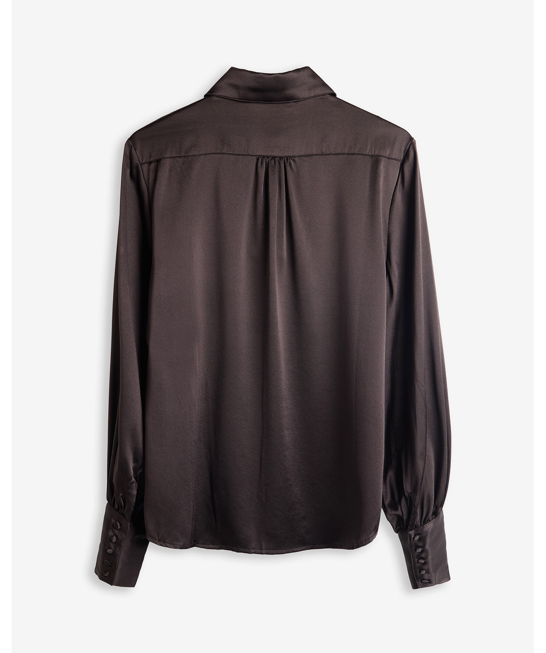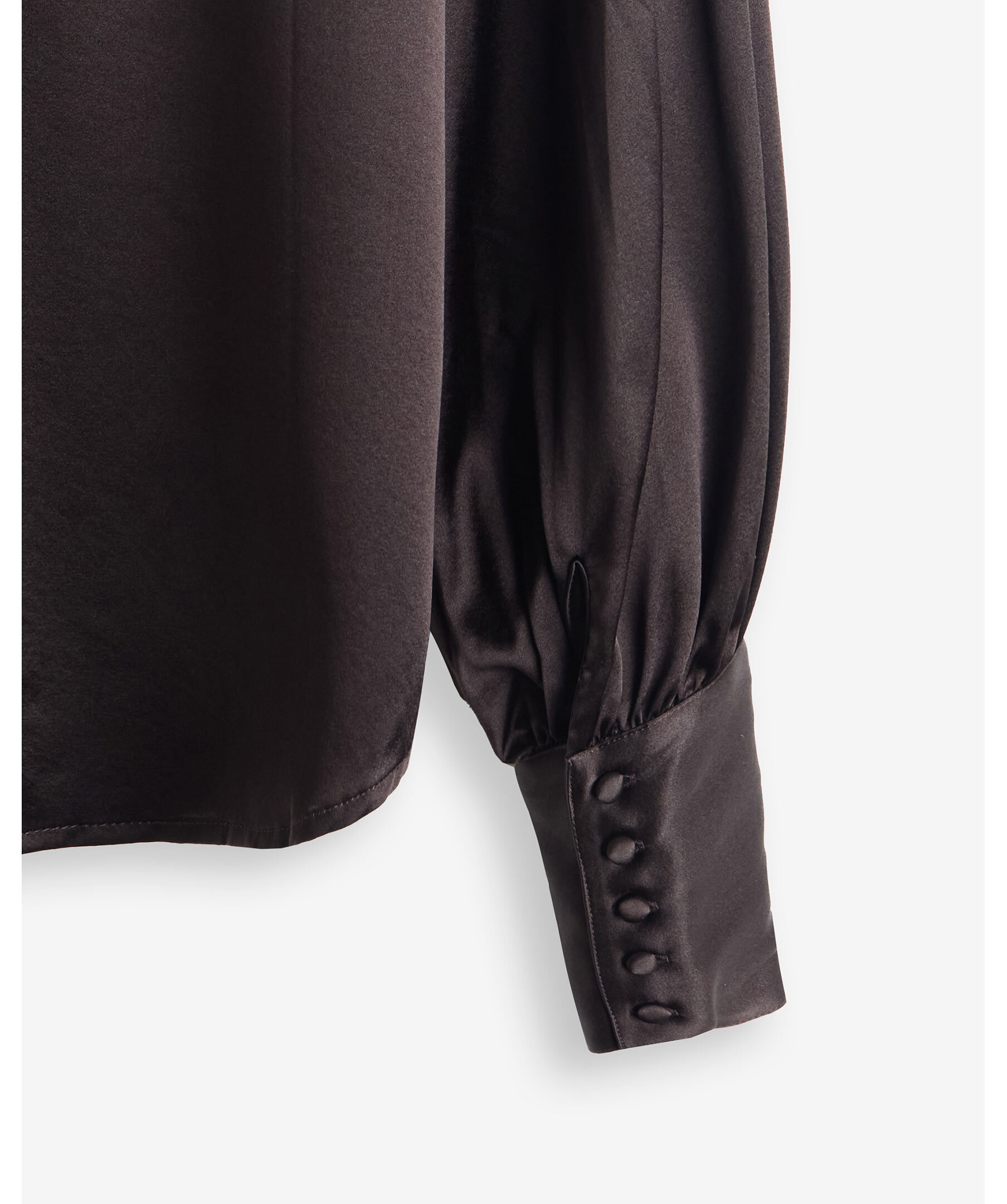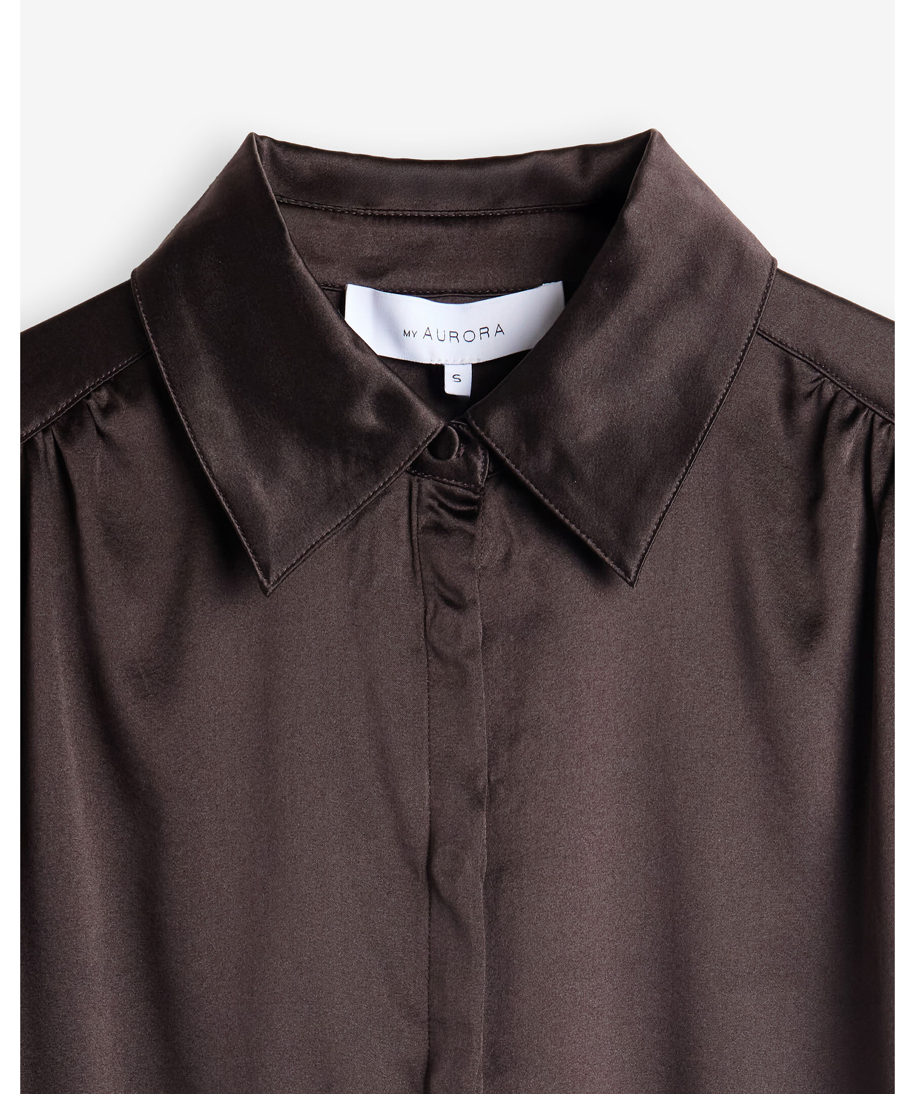 Mörkbrun silkblus från My Aurora. Blusen har dolda knappar framtill, ballongärmar och klädda knappar på manschetterna. Tillverkad i en silkblandning.