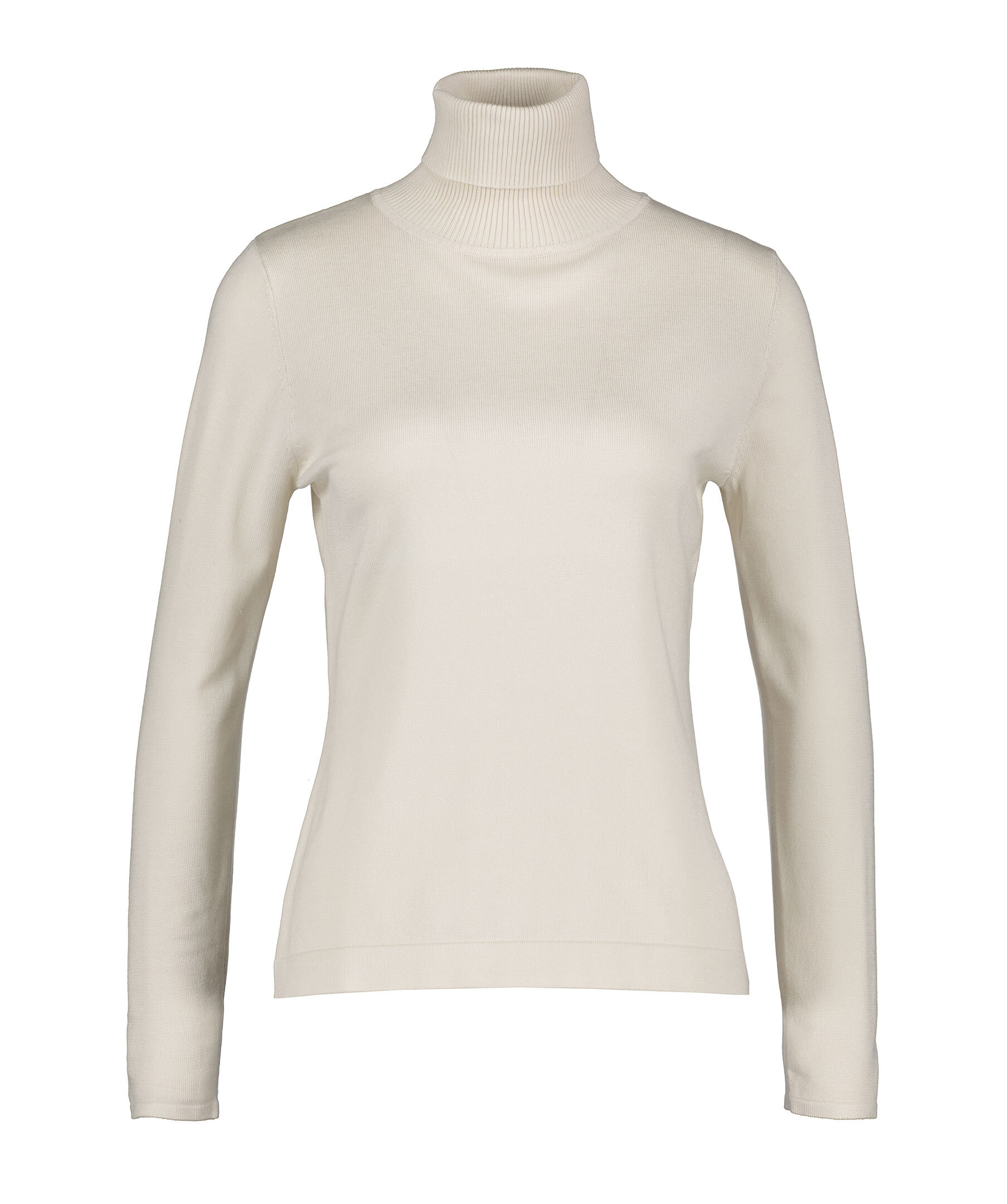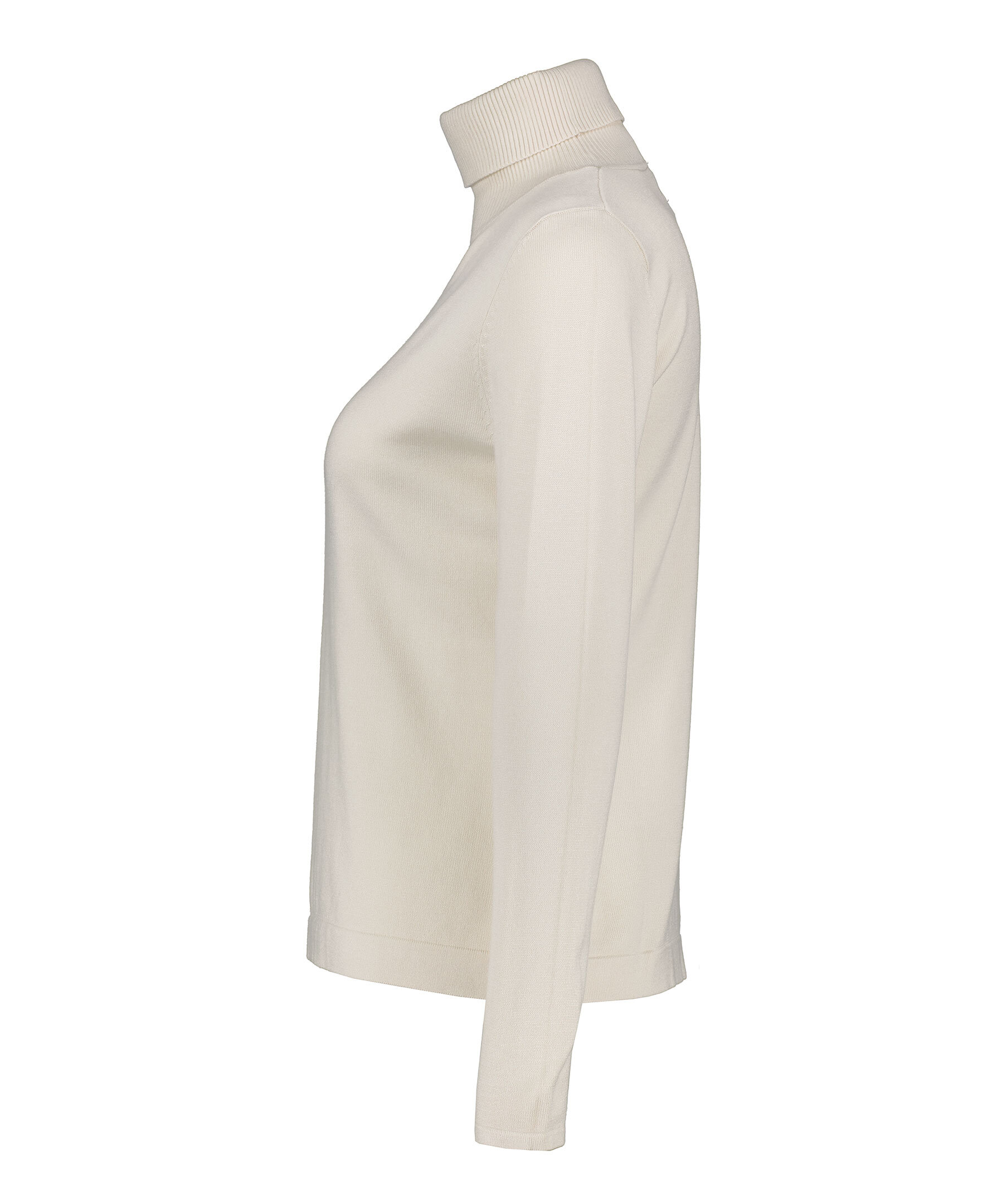 Sandfärgad, finstickad polotröja från My Aurora. Tröjan har en hög, ribbstickad krage samt ribbstickade muddar vid plaggslut. Tillverkad i en viskosblandning.