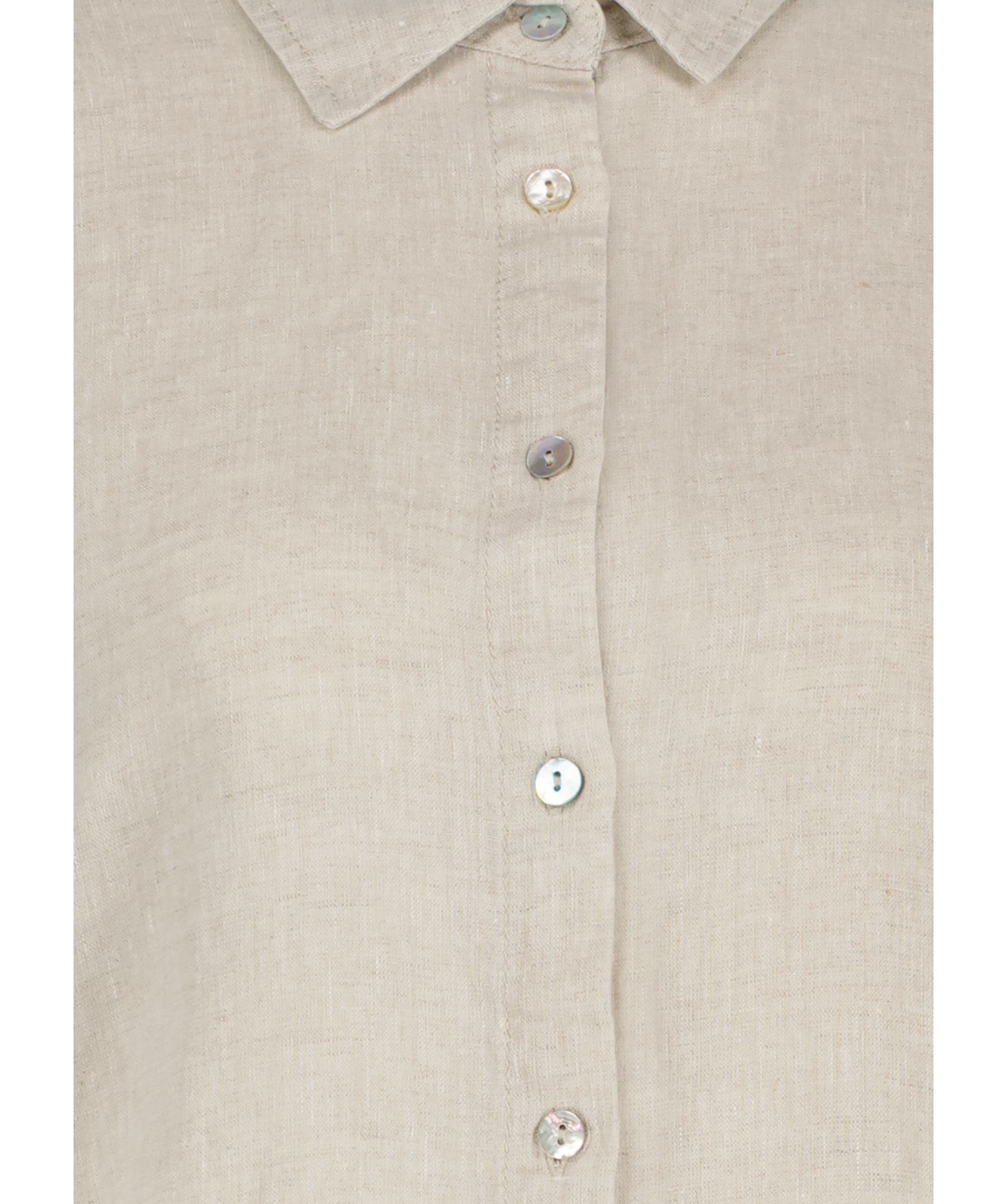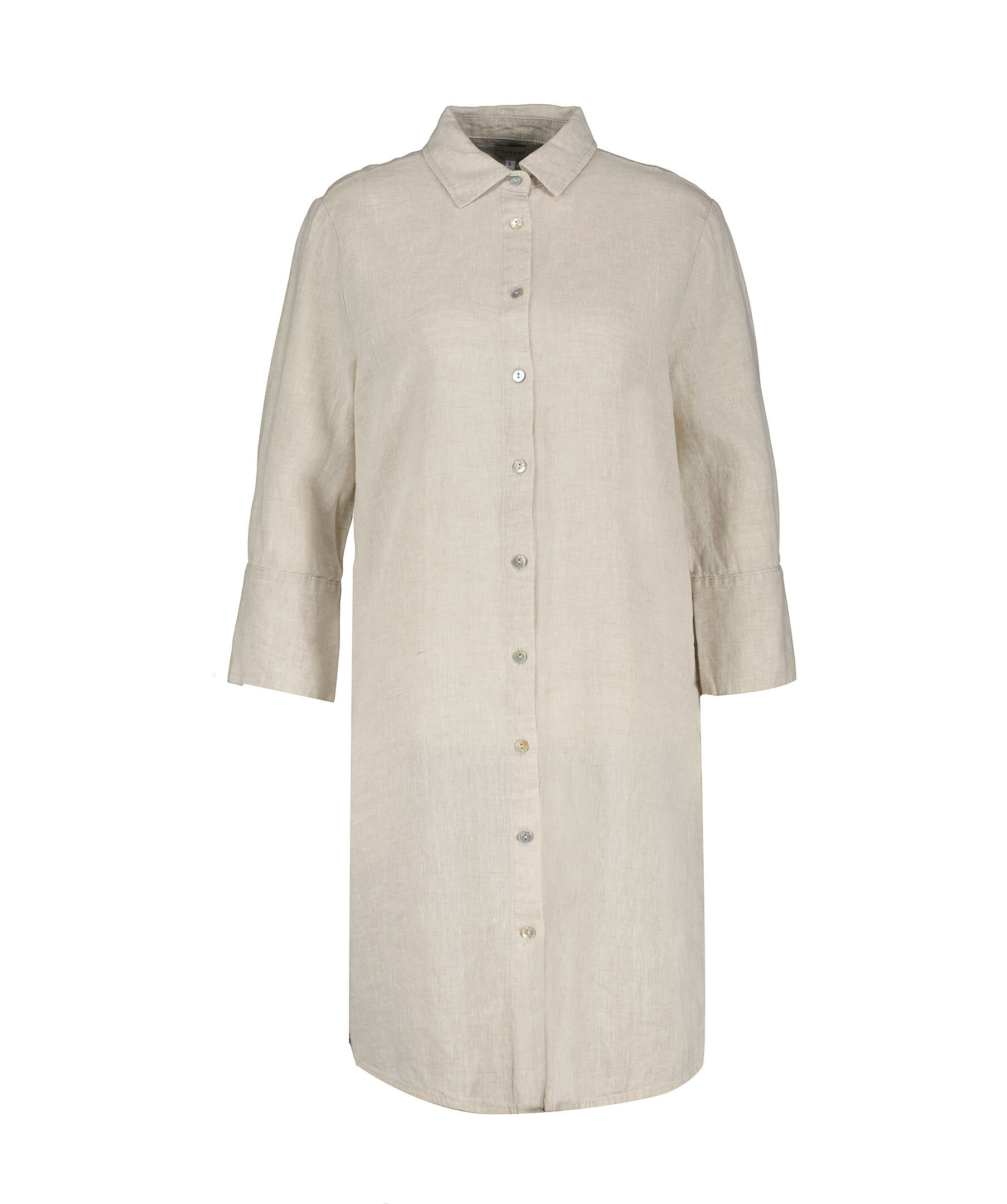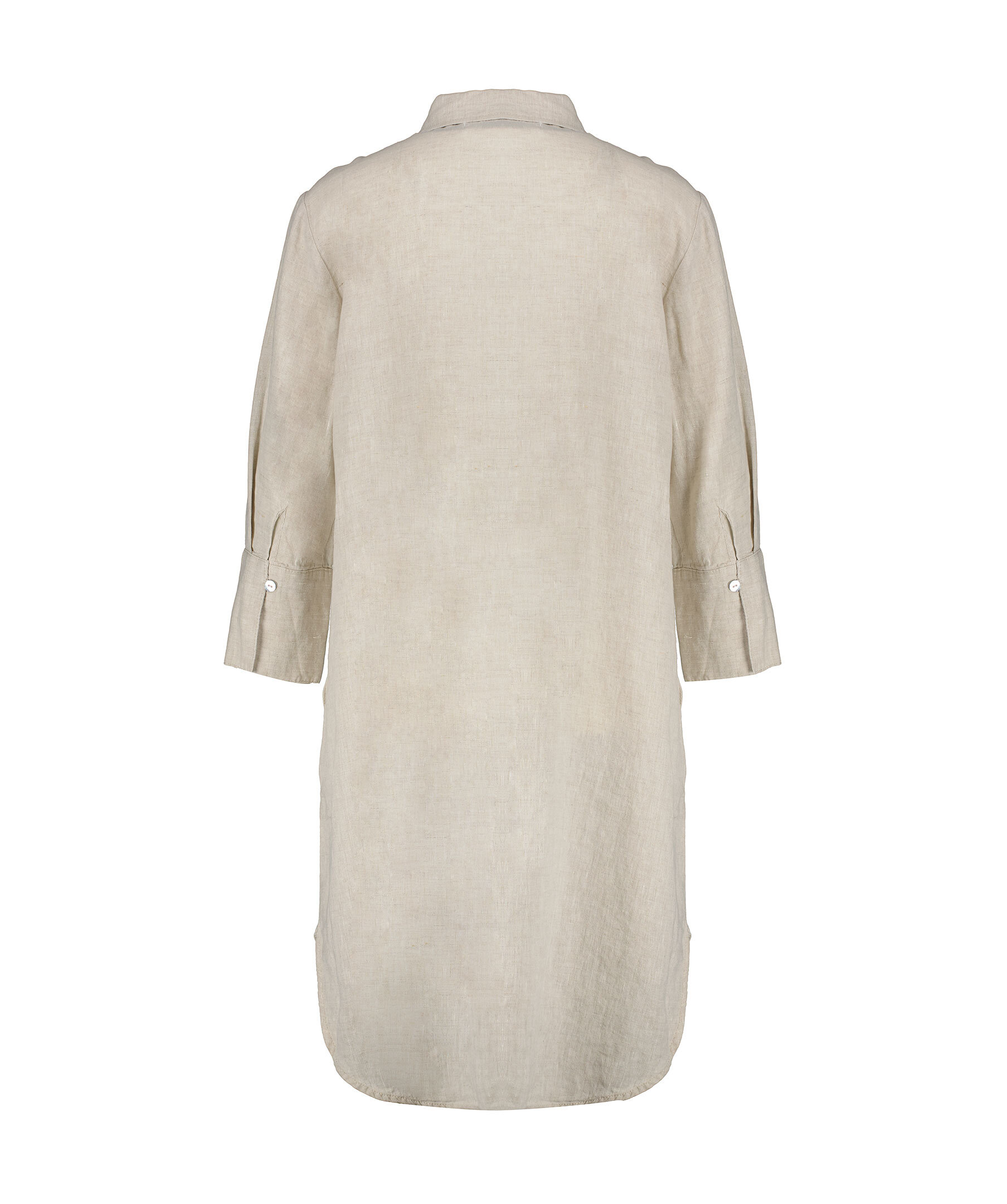 Sandfärgad skjortklänning från My Aurora. klänningen stängs med pärlemorknappar framtill och har något bredare manschetter och har två fickor. Tillverkad i 100% lin.