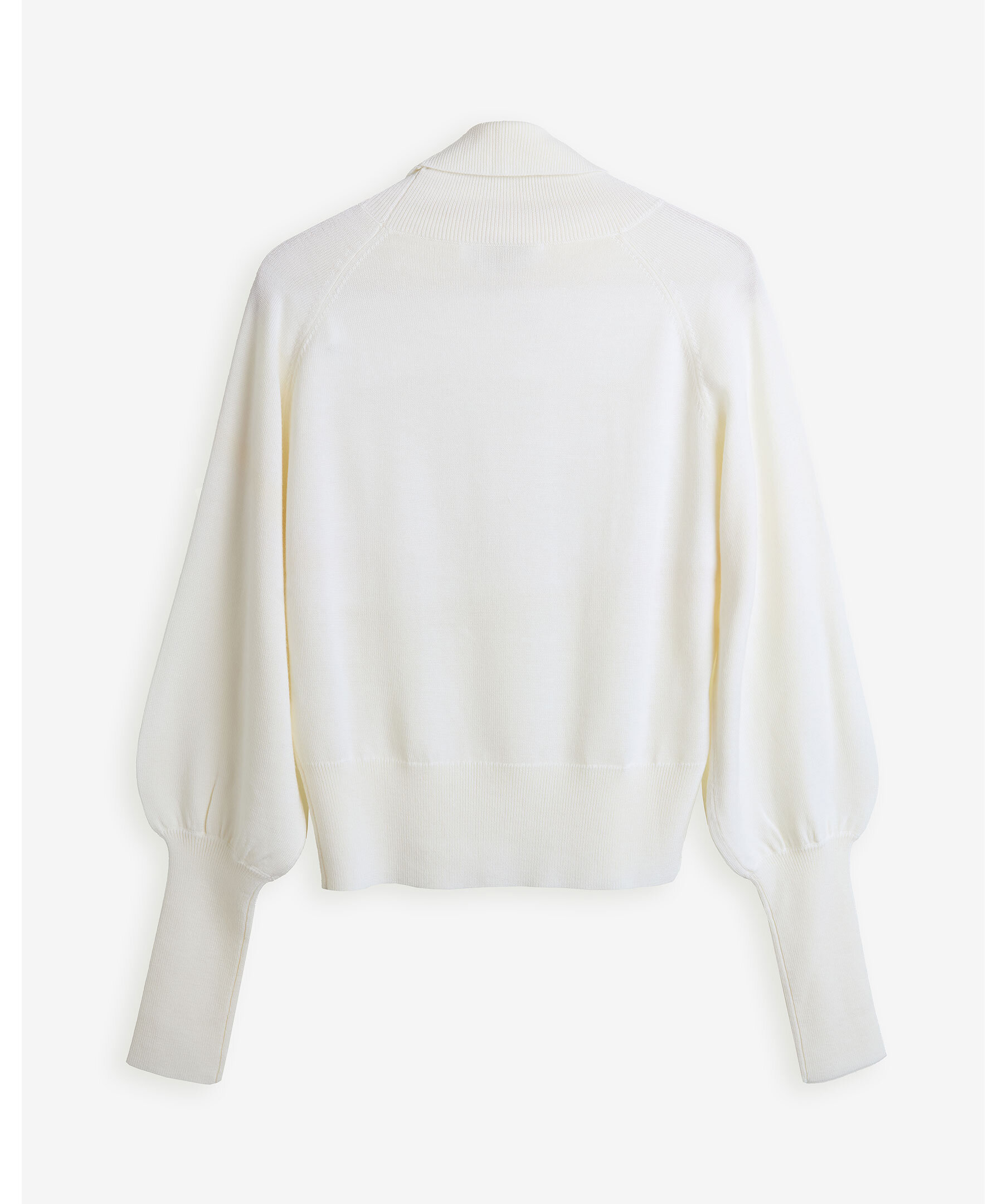 Krämvit, finstickad polotröja från My Aurora. Tröjan har en hög krage som går att vika ned samt ballongärmar med extra långa muddar. Tillverkad i 100% merinoull.