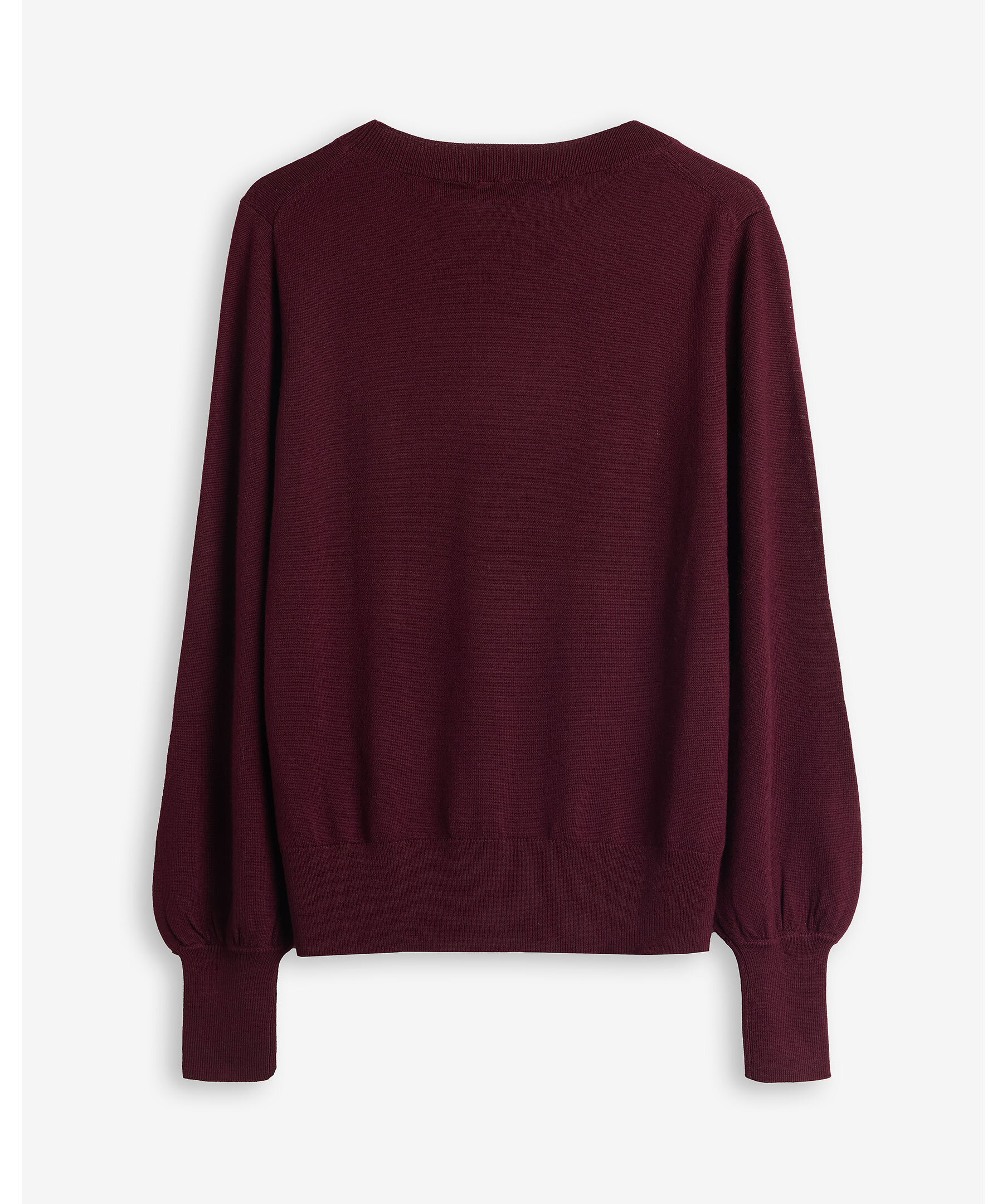 Vinröd, finstickad tröja med lätta ballongärmar från My Aurora. Tröjan har rund, ribbstickad halsringning samt ribbstickade muddar vid ärm- och plaggslut. Tillverkad i 100% merinoull.
