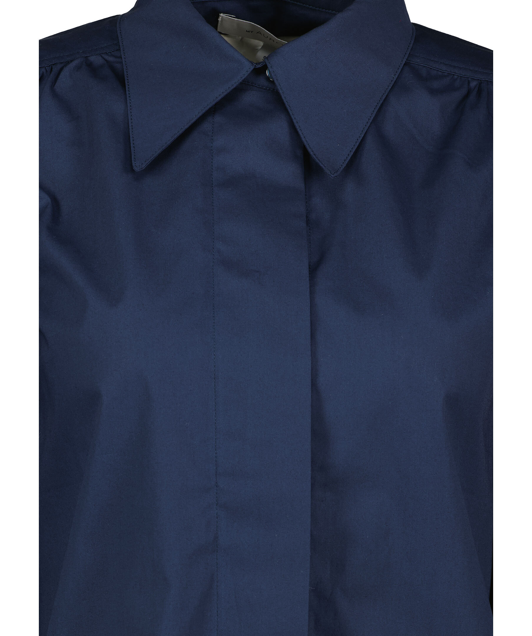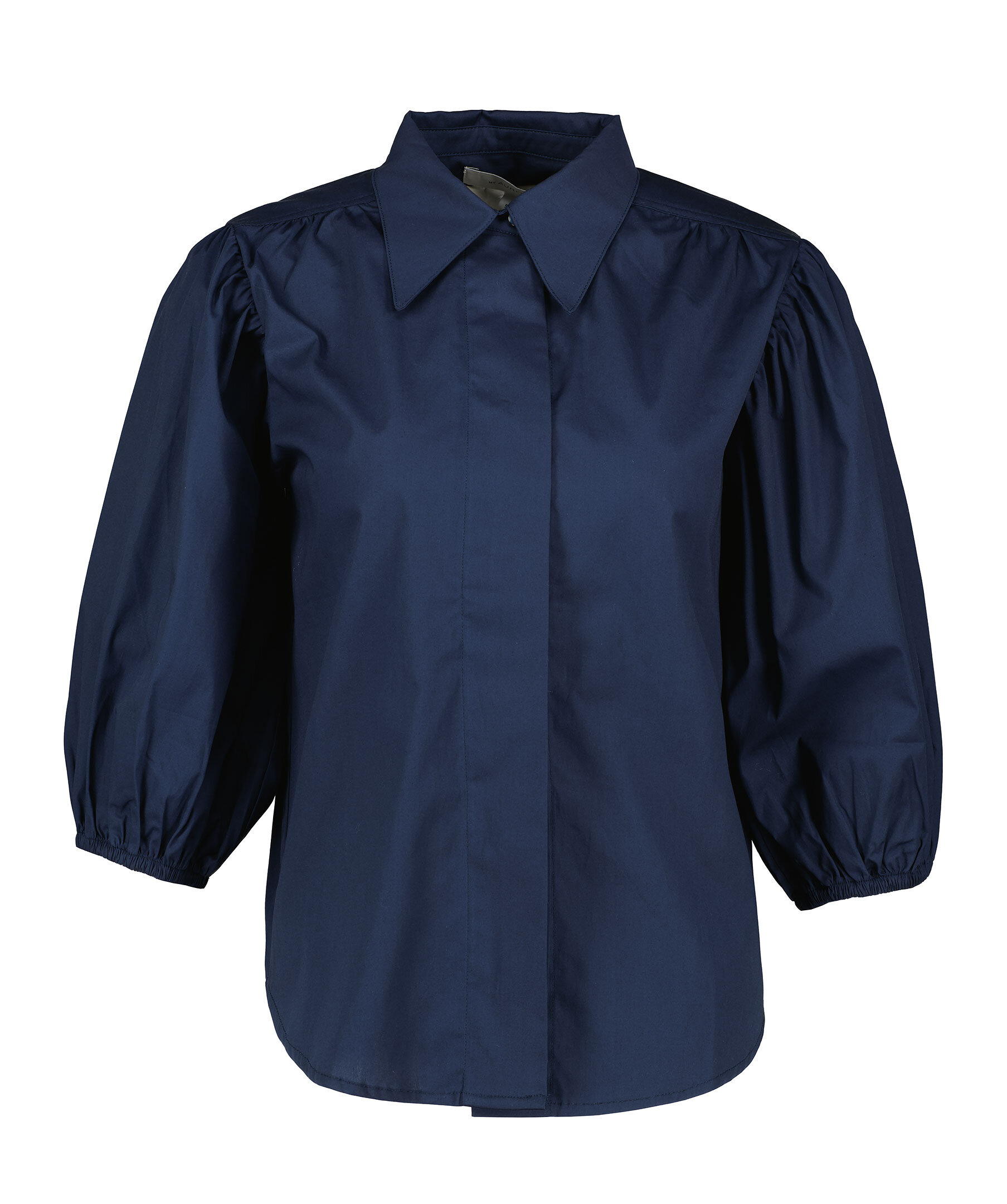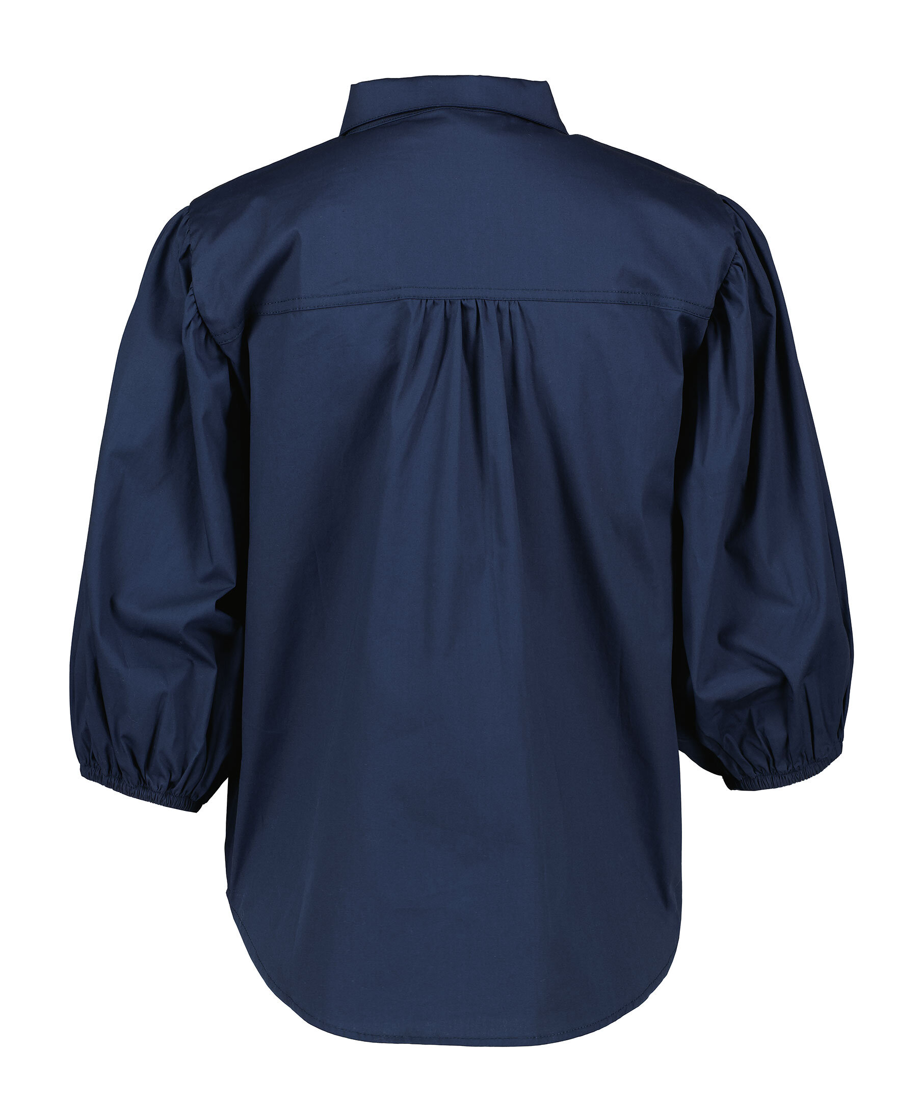 Mörkblå kortärmad blus med puffärmar från My Aurora. Stängs framtill med dolda knappar. Spetsig krage. Plisserade detaljer på axlarna och ryggen. Tillverkad i bomullsblandning.