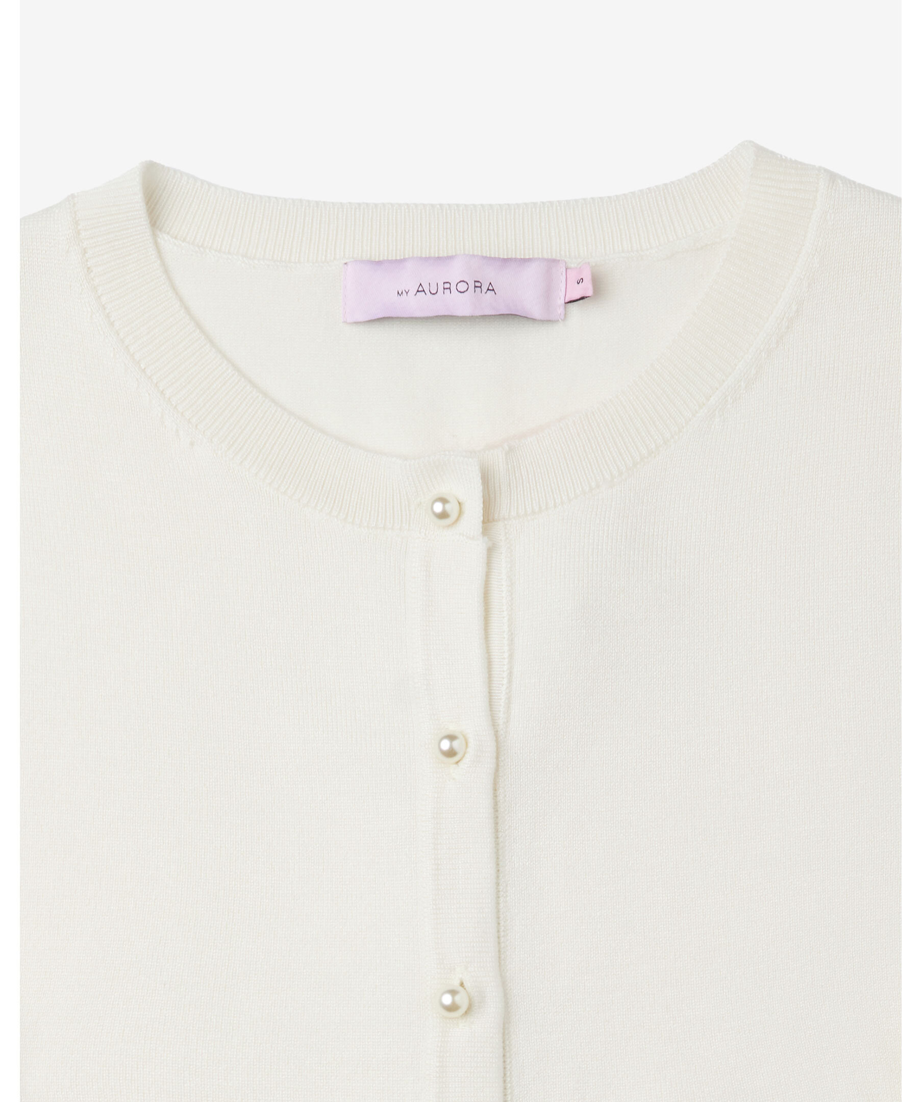 Finstickad cardigan i vitt från My Aurora Pink. Ribbstickade muddar och stängs med eleganta pärlknappar. Gjord i en viskos och nylon blandning.