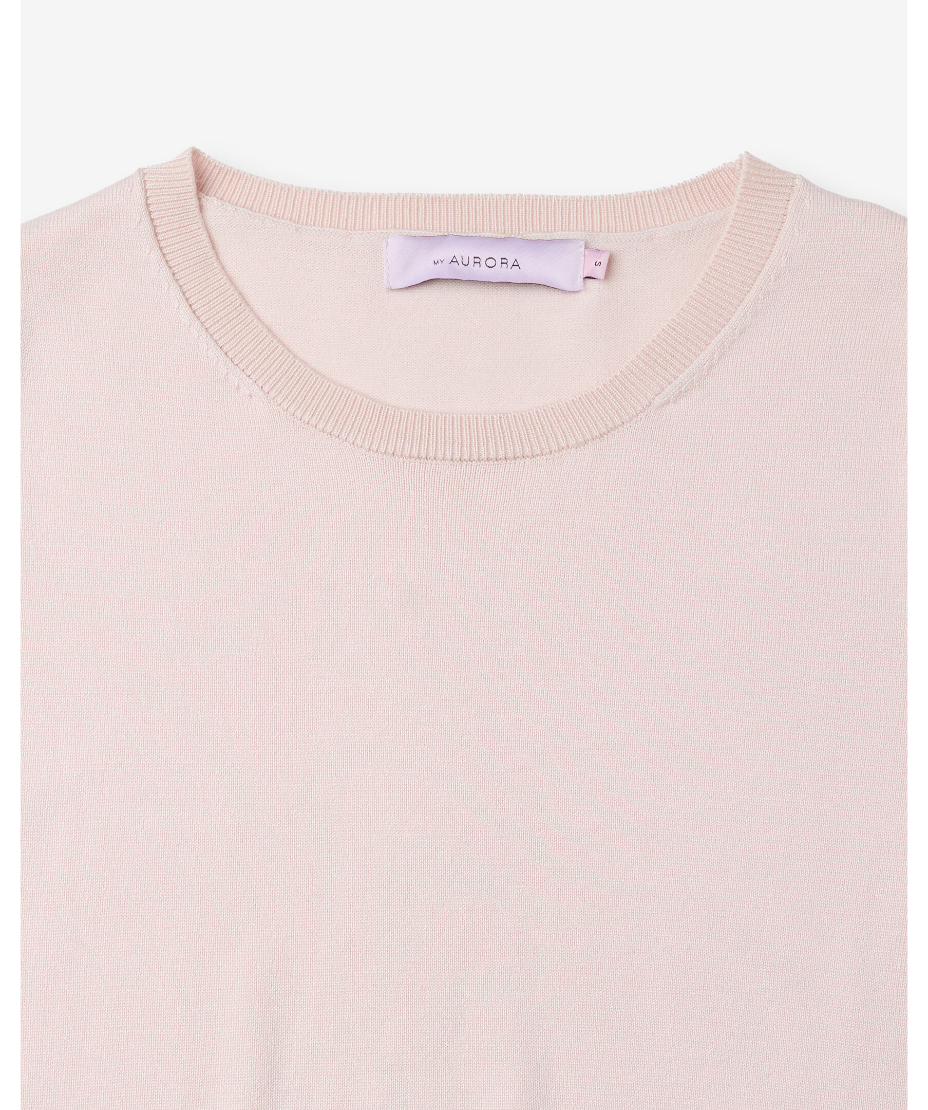 Tunn finstickad tröja i ljusrosa från My Aurora Pink. Ribbstickade muddar vid halsring, ärm och plaggslut. Tröjan är tillverkad i en blandning av viskos och nylon.