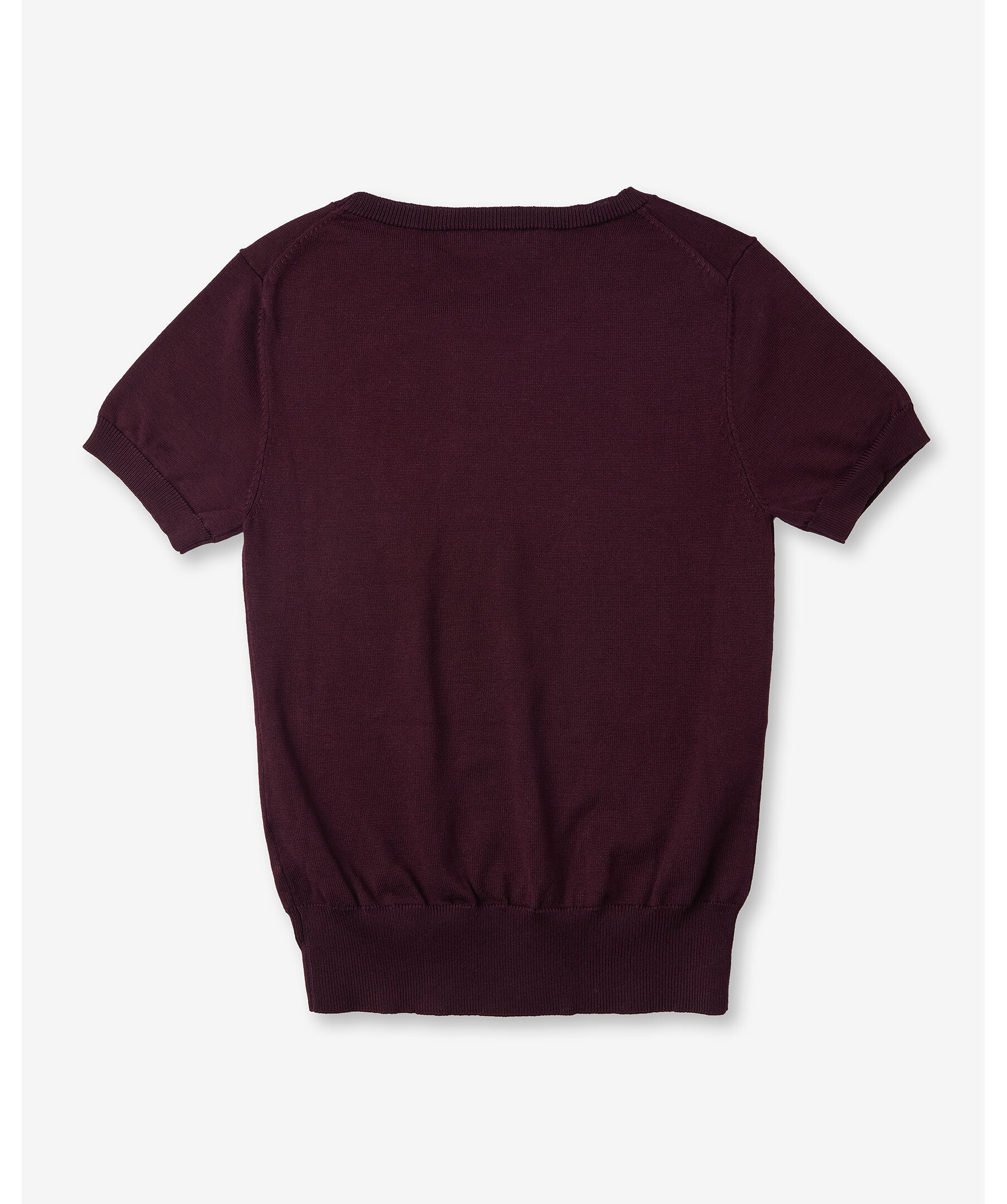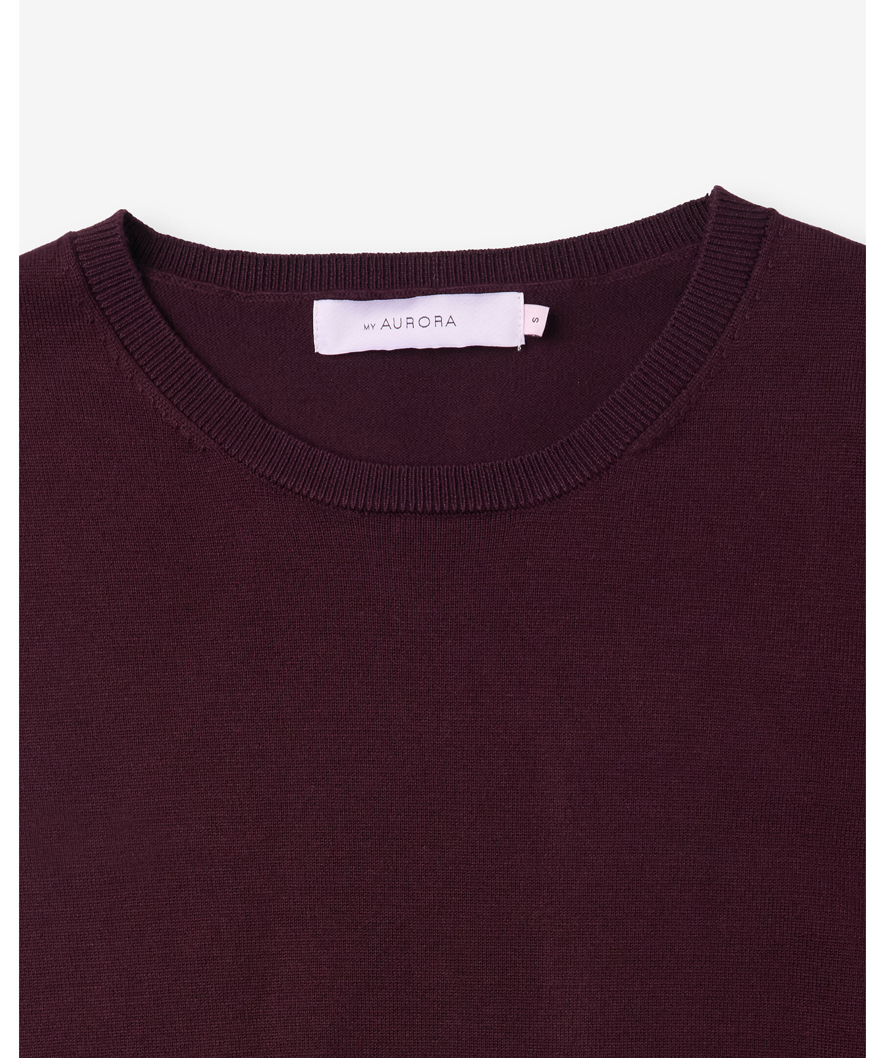 Tunn finstickad tröja i vinrött från My Aurora Pink. Ribbstickade muddar vid halsring, ärm och plaggslut. Tröjan är tillverkad i en blandning av viskos och nylon.