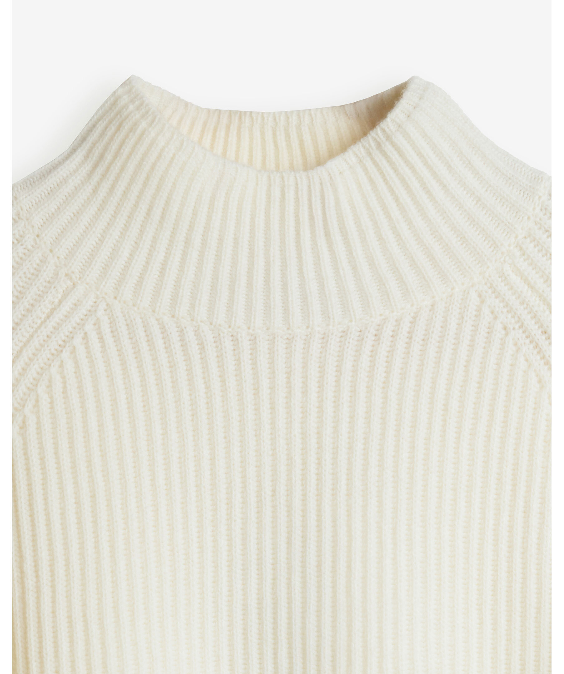 Krämvit, ribbstickad polotröja från My Aurora. Tröjan har korta slitsar i sidorna och är tillverkad i 100% merinoull.