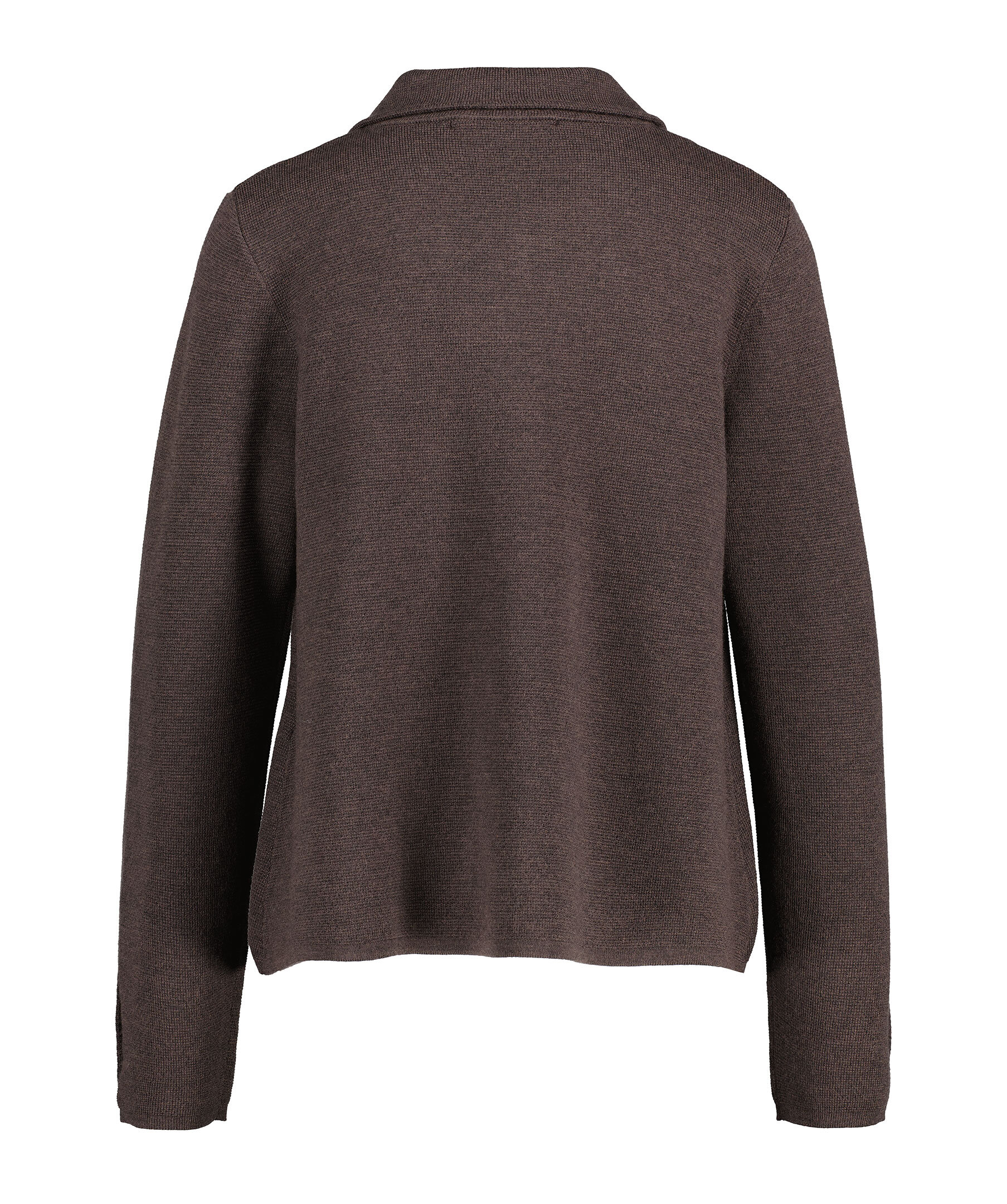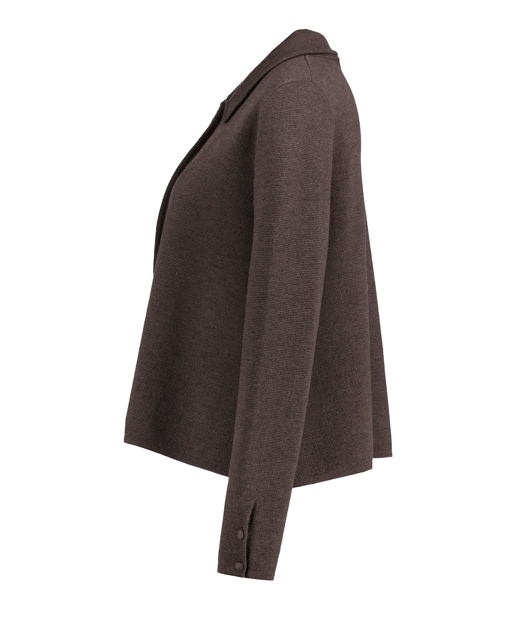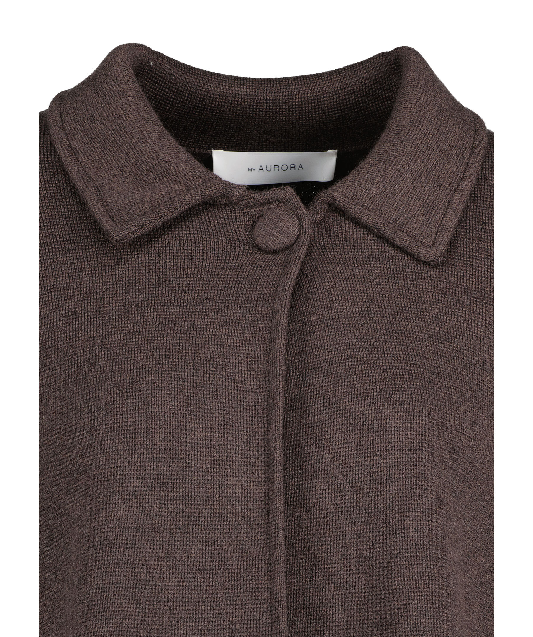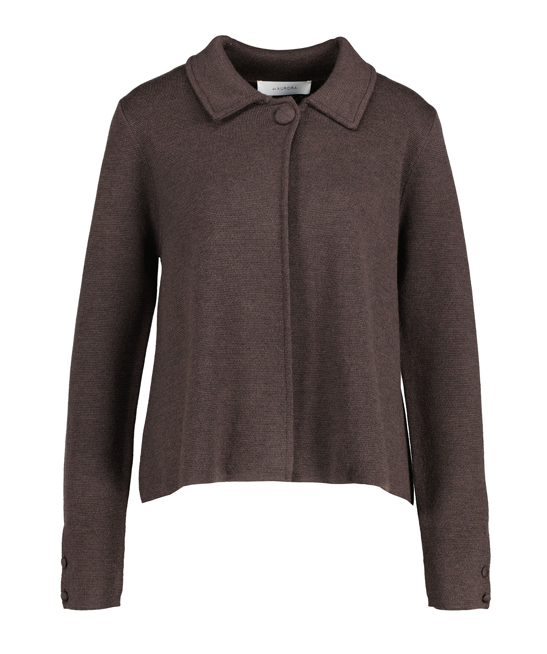 Mörkbrun stickad kofta från My Aurora. Stängs framtill med en klädd knapp. Spetsig krage. Tillverkad i 100% Merinoull. Tre knappar vid ärmslut.