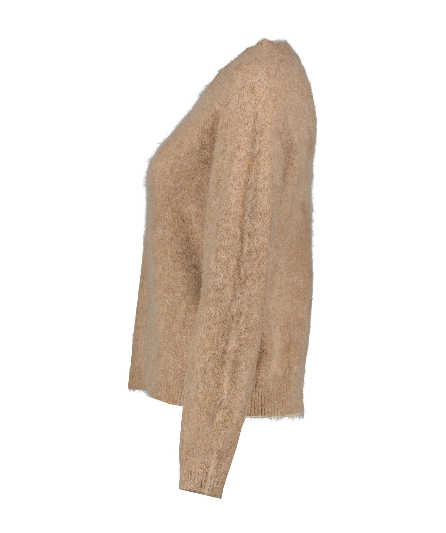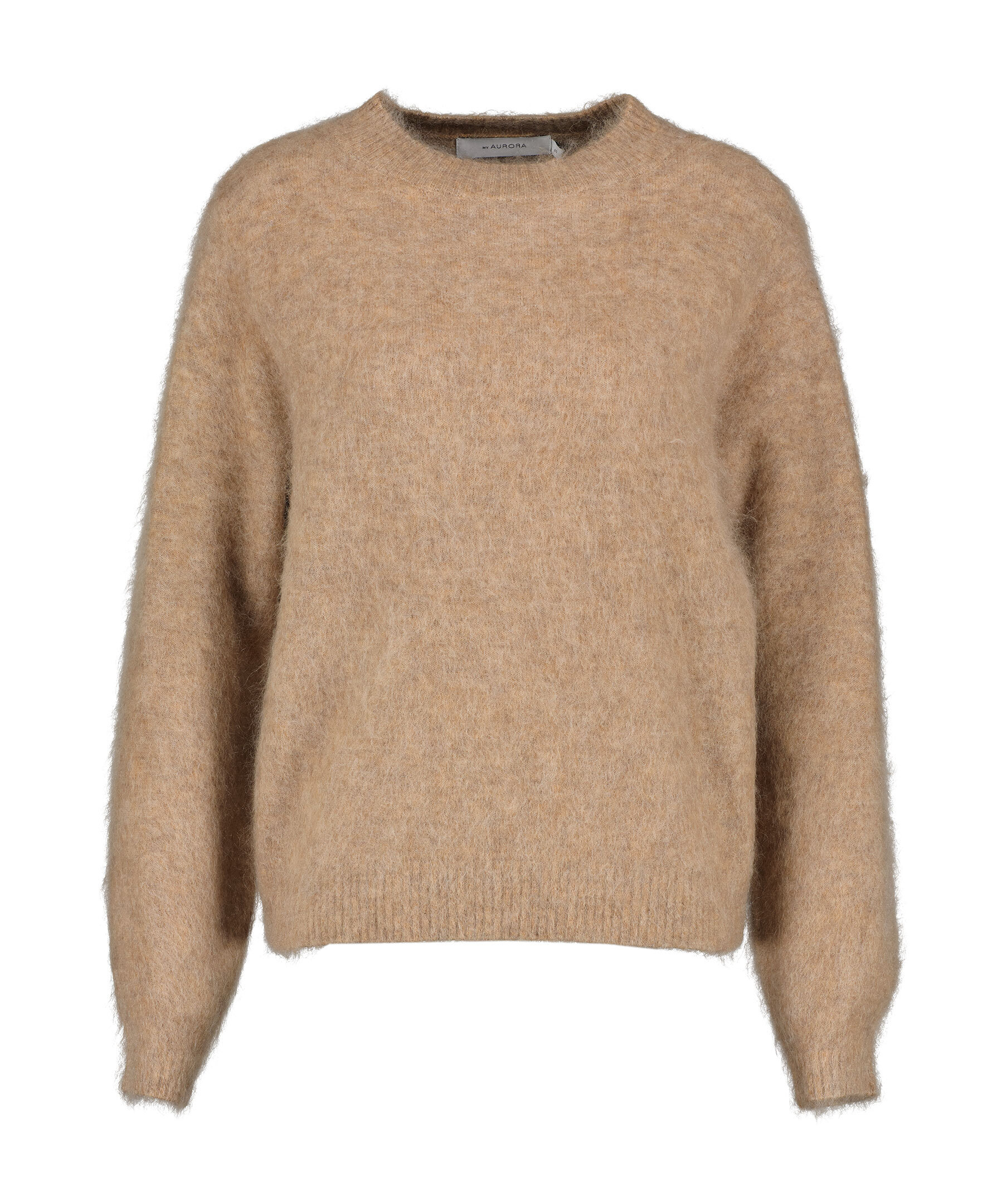 Kamelfärgad stickad pullover från My Aurora Pink. Tröjan har ribbstickad rund halsringning samt ribbstickade muddar vid ärm- och plaggslut. Tillverkad i en ullblandning.