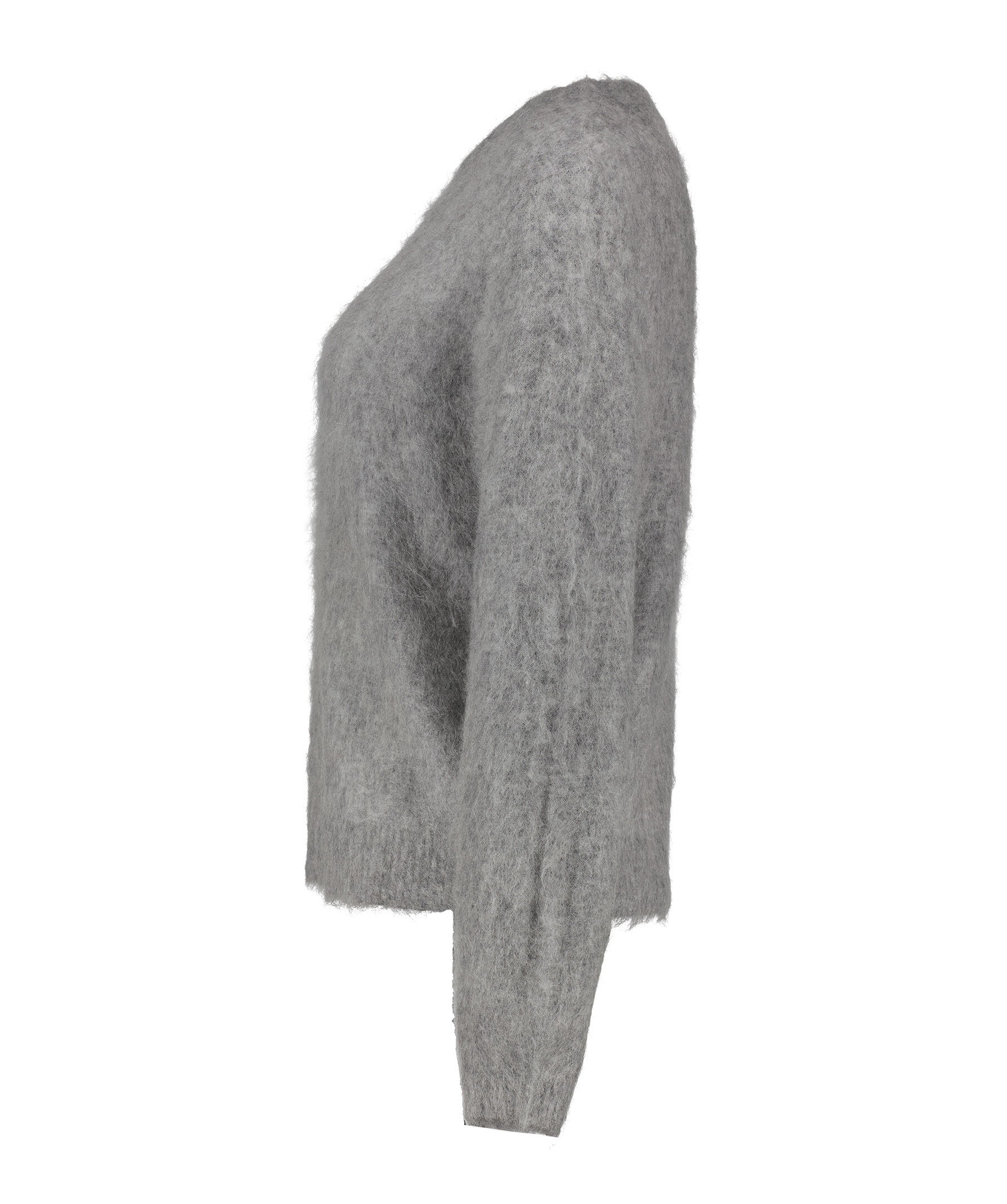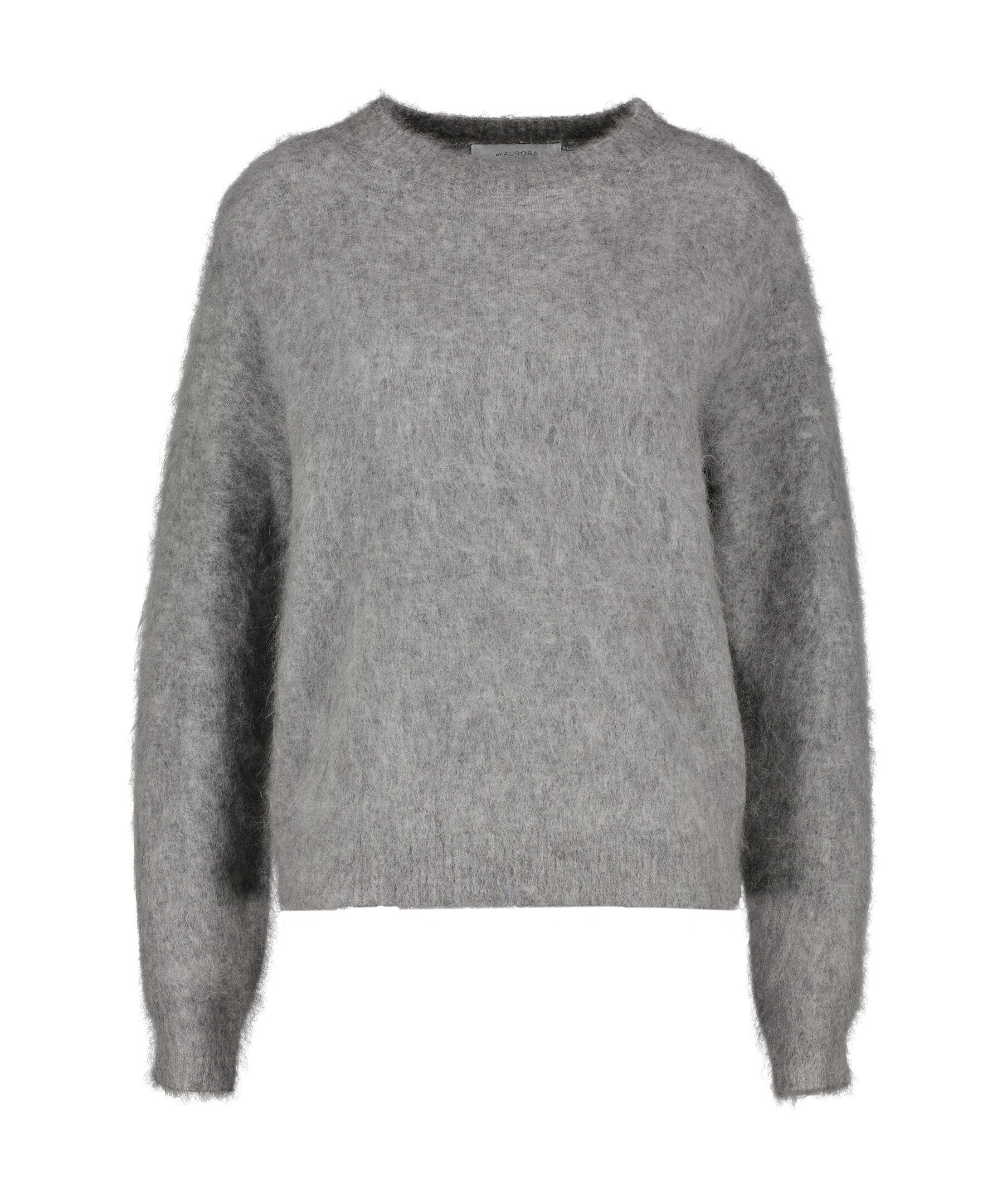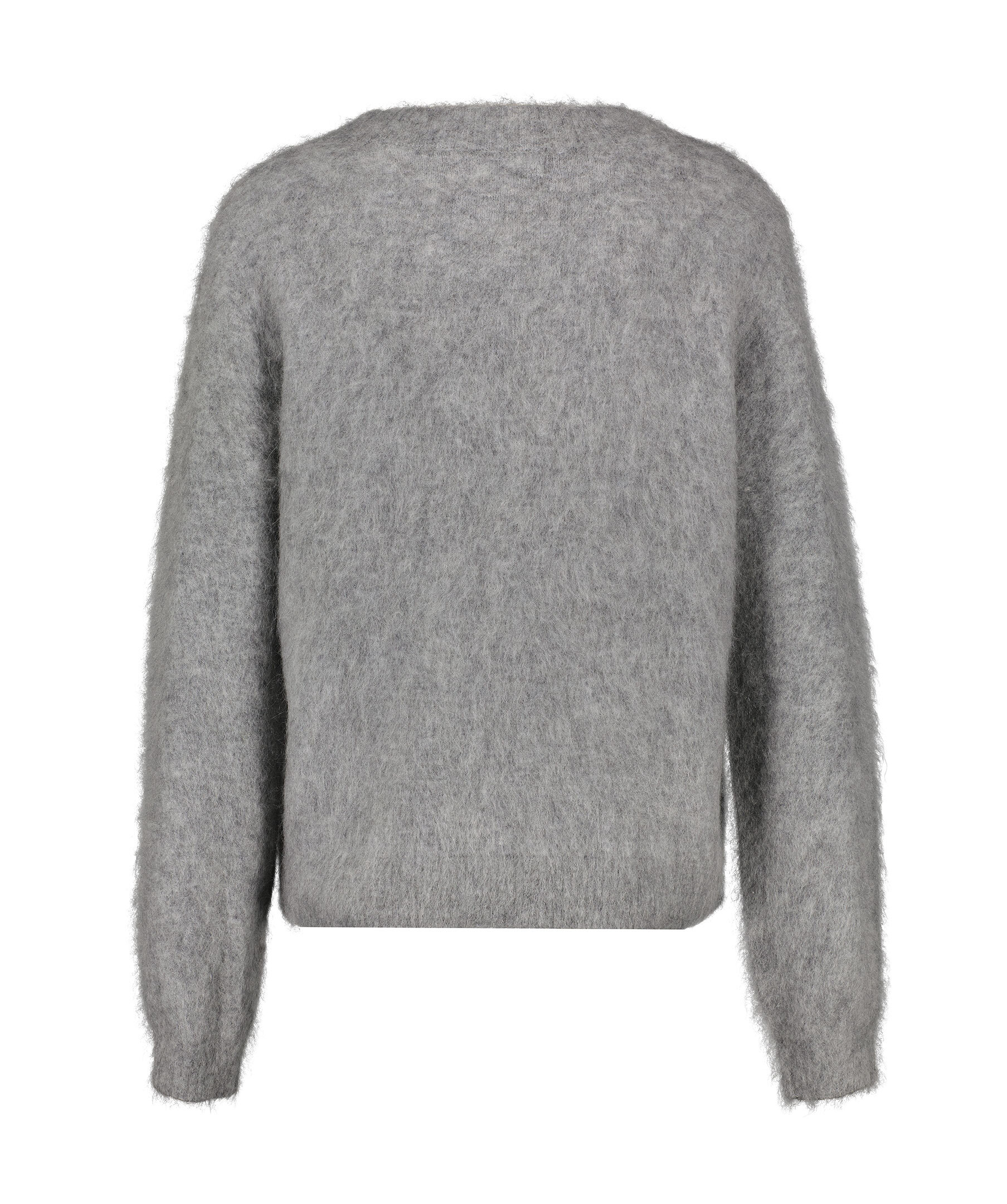Grå stickad pullover från My Aurora Pink. Tröjan har ribbstickad rund halsringning samt ribbstickade muddar vid ärm- och plaggslut. Tillverkad i en ullblandning.