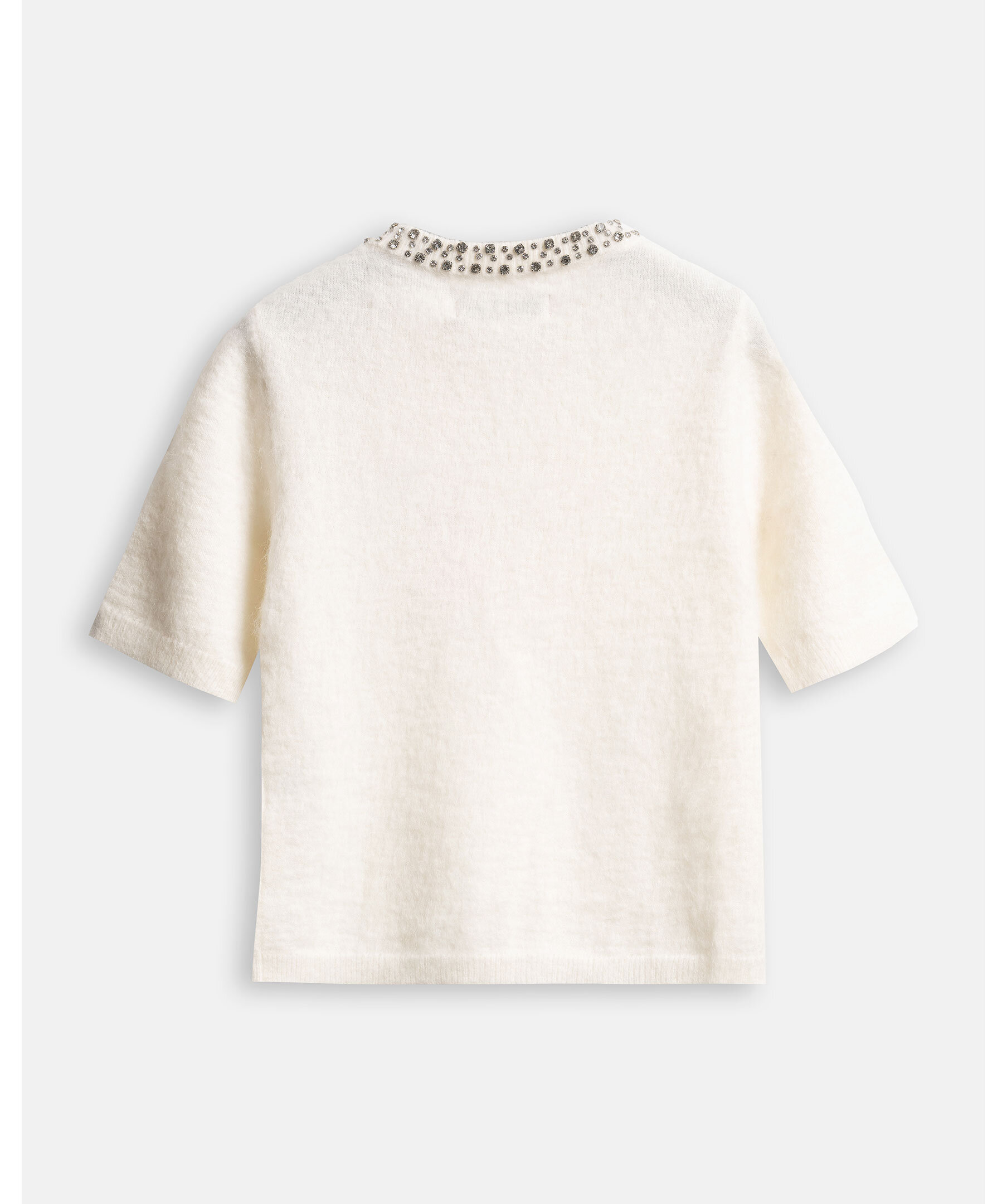 Kortärmad stickad tröja från My Aurora i en mohair- och ullblandning. Tröjan är rundhalsad och dekorerad med strass kring halsringningen.