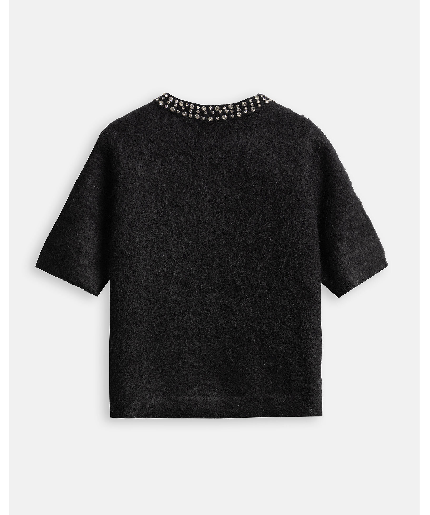 Kortärmad stickad tröja från My Aurora i en mohair- och ullblandning. Tröjan är rundhalsad och dekorerad med strass kring halsringningen.