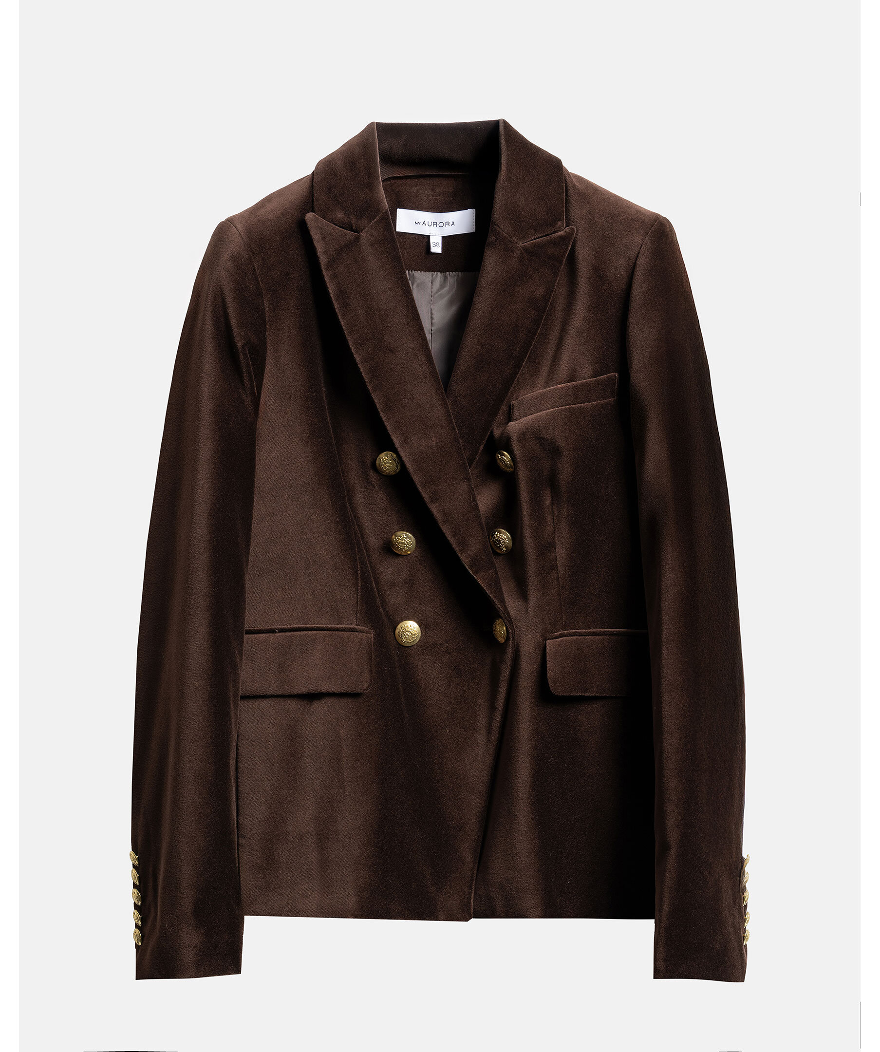 Brun dubbelknäppt blazer i sammet från My Aurora. Kavajen har utanpåliggande fickor och dekorativa guldfärgade knappar.
