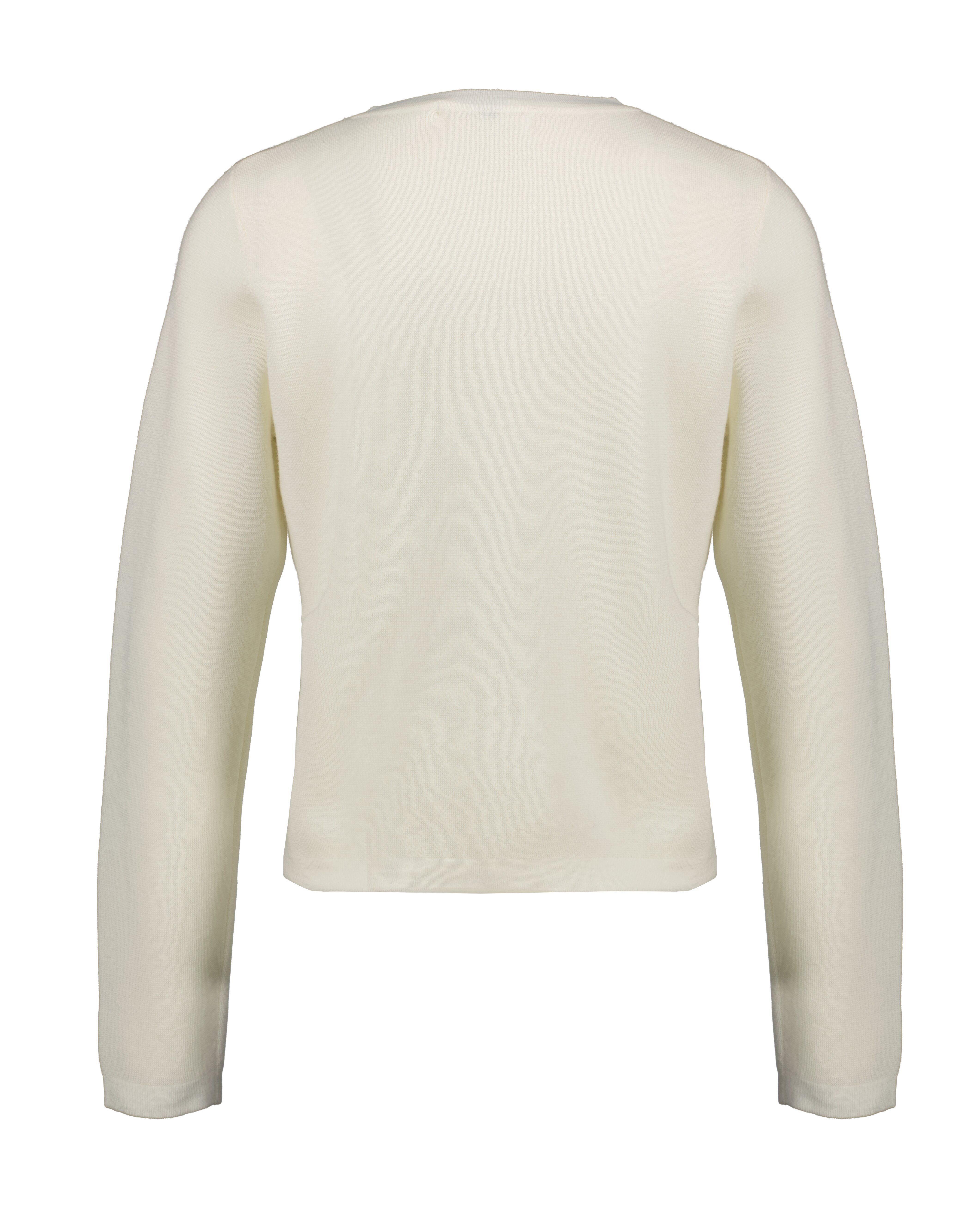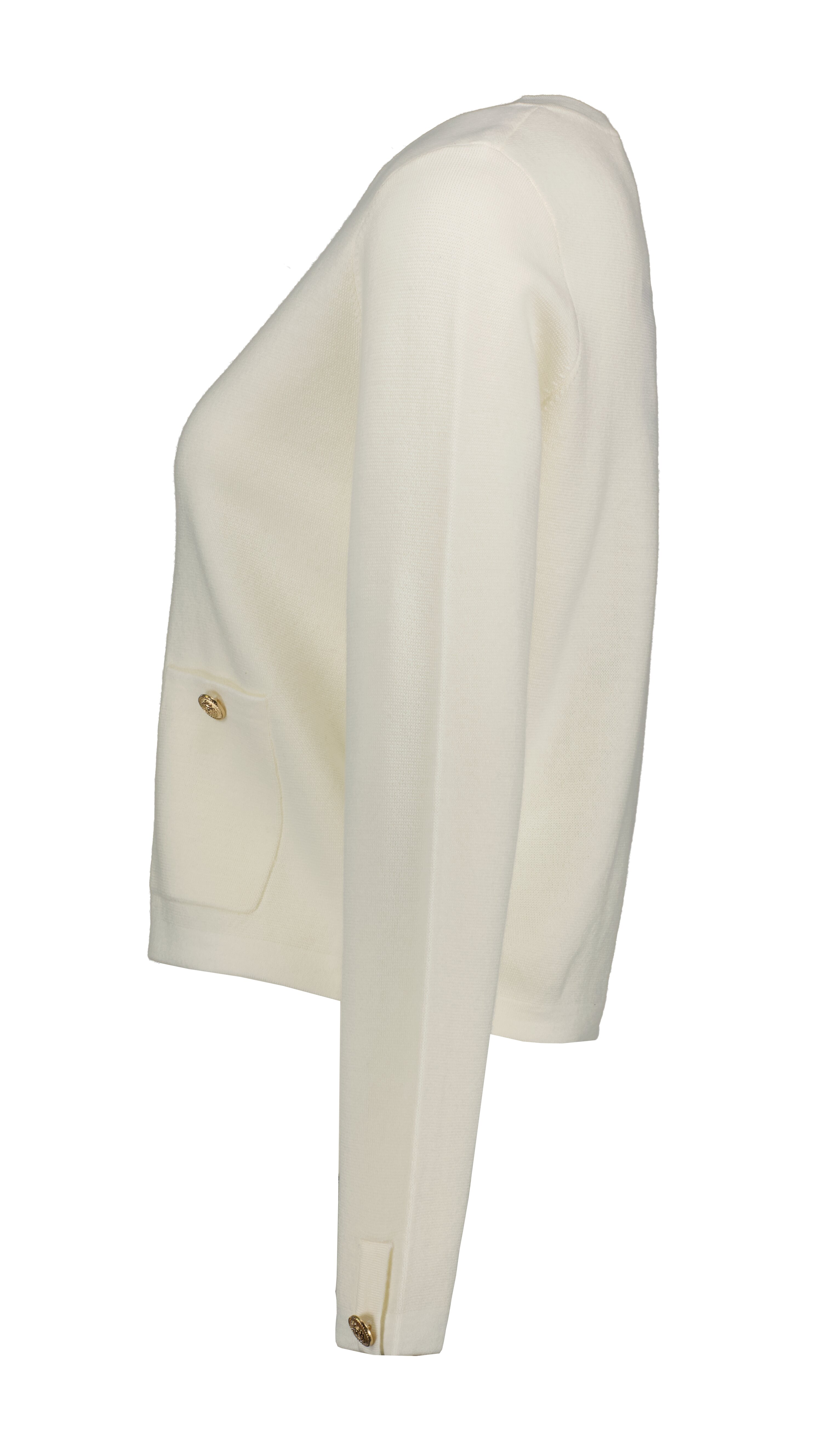 Krämvit, finstickad kofta från My Aurora. Koftan stängs med dekorativa, guldfärgade knappar och har likadana knappar vid fickorna och ärmslut. Tillverkad i merinoull.