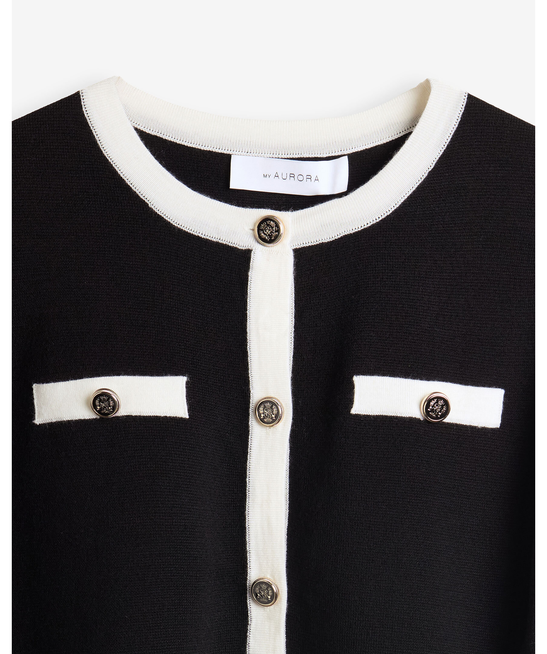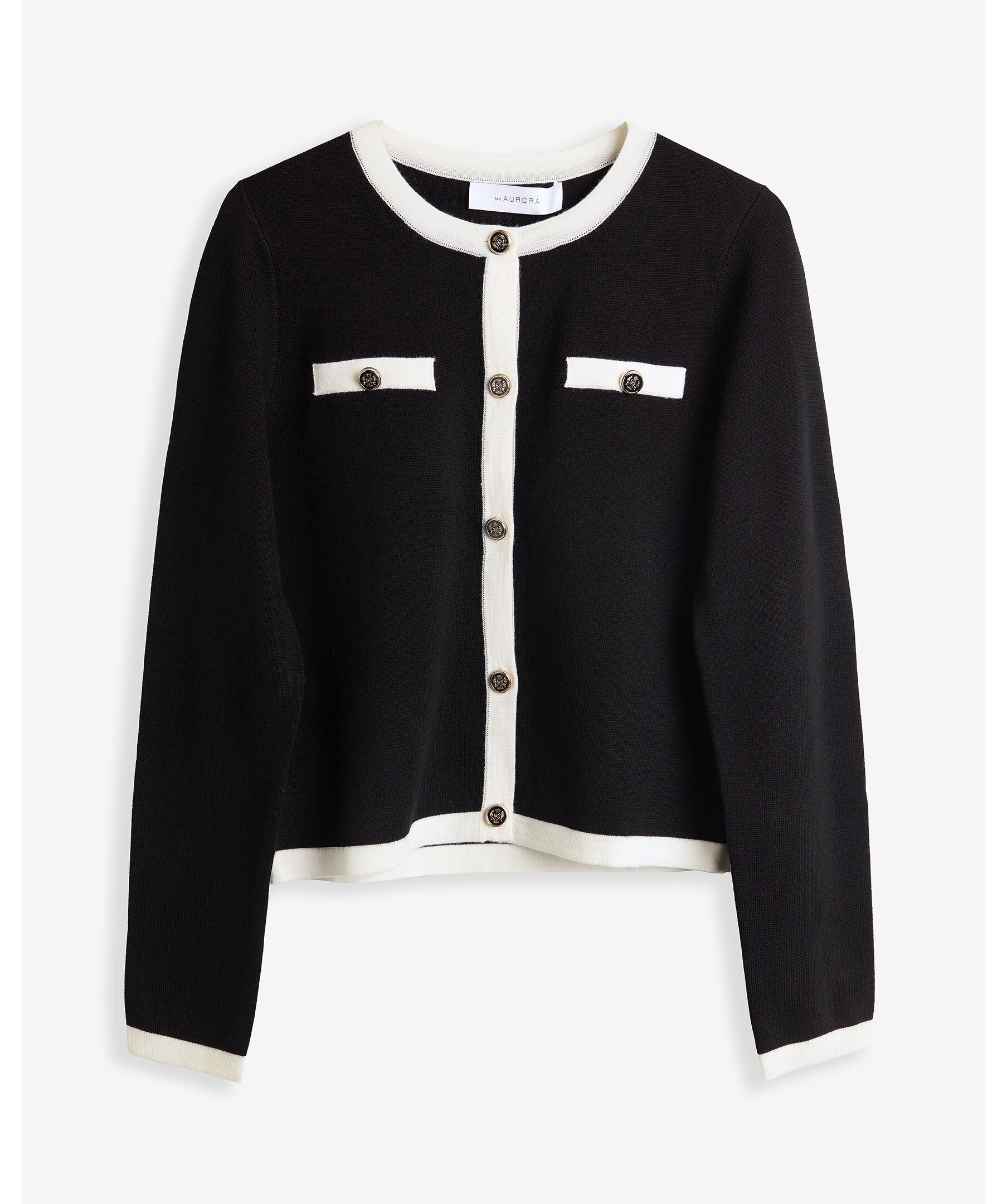 Svart kofta från My Aurora. Koftan stängs med guldfärgade knappar och har två dekorativa passpoalfickor på bröstet samt kontrastfärgade kanter. Tillverkad i 100% merinoull.