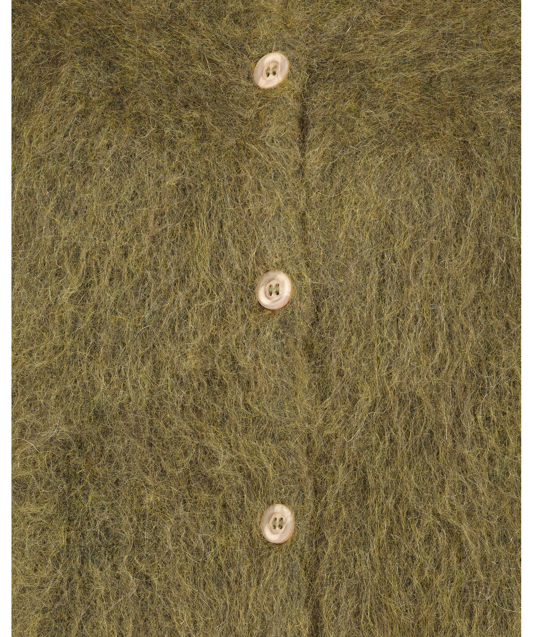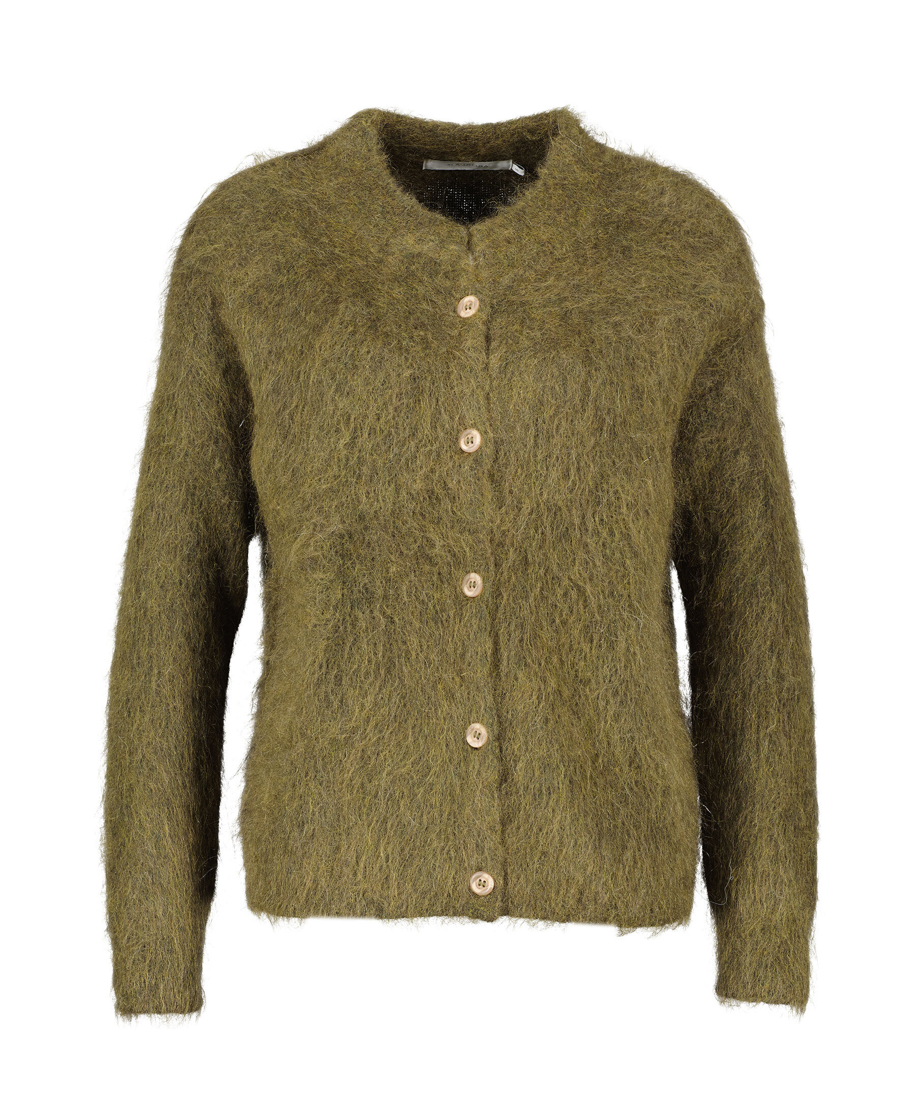 Grön stickad kofta från My Aurora Pink. Koftan har rundad halsringning, stängs framtill med knappar. Tillverkad av en ull och kid mohair blandning.