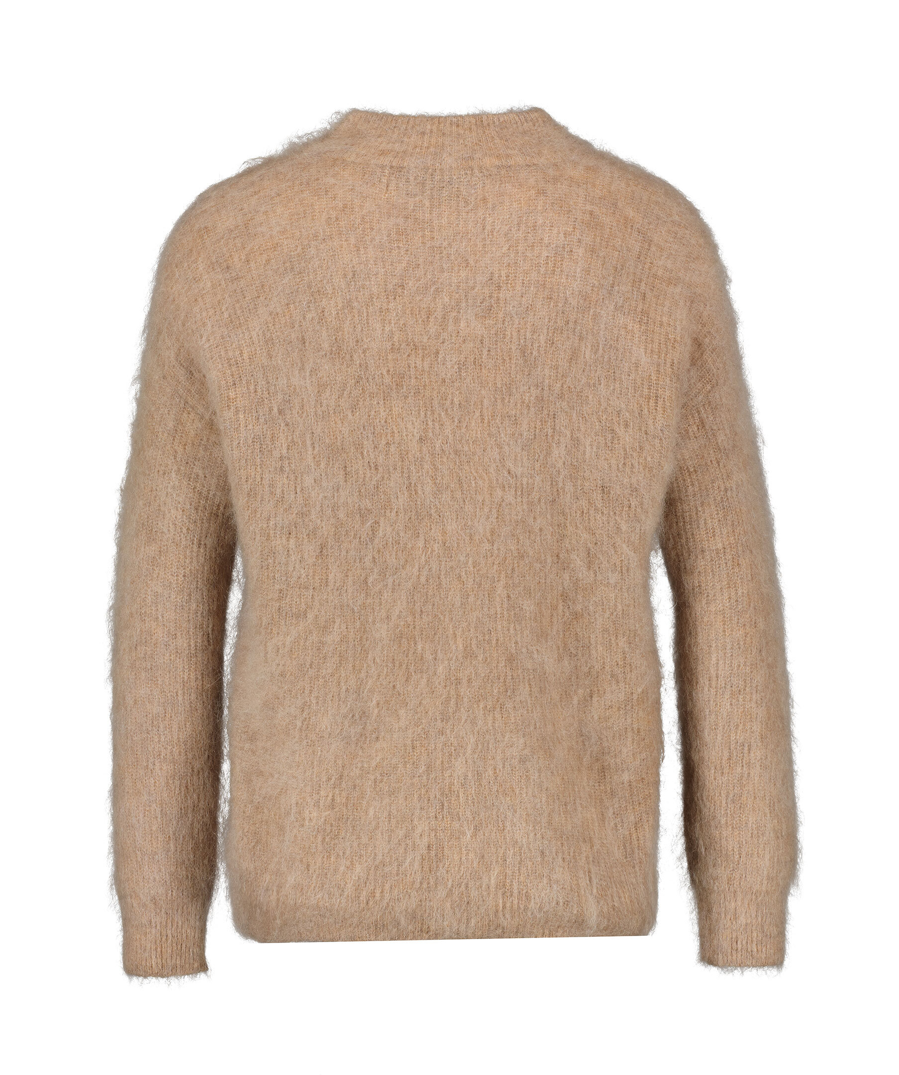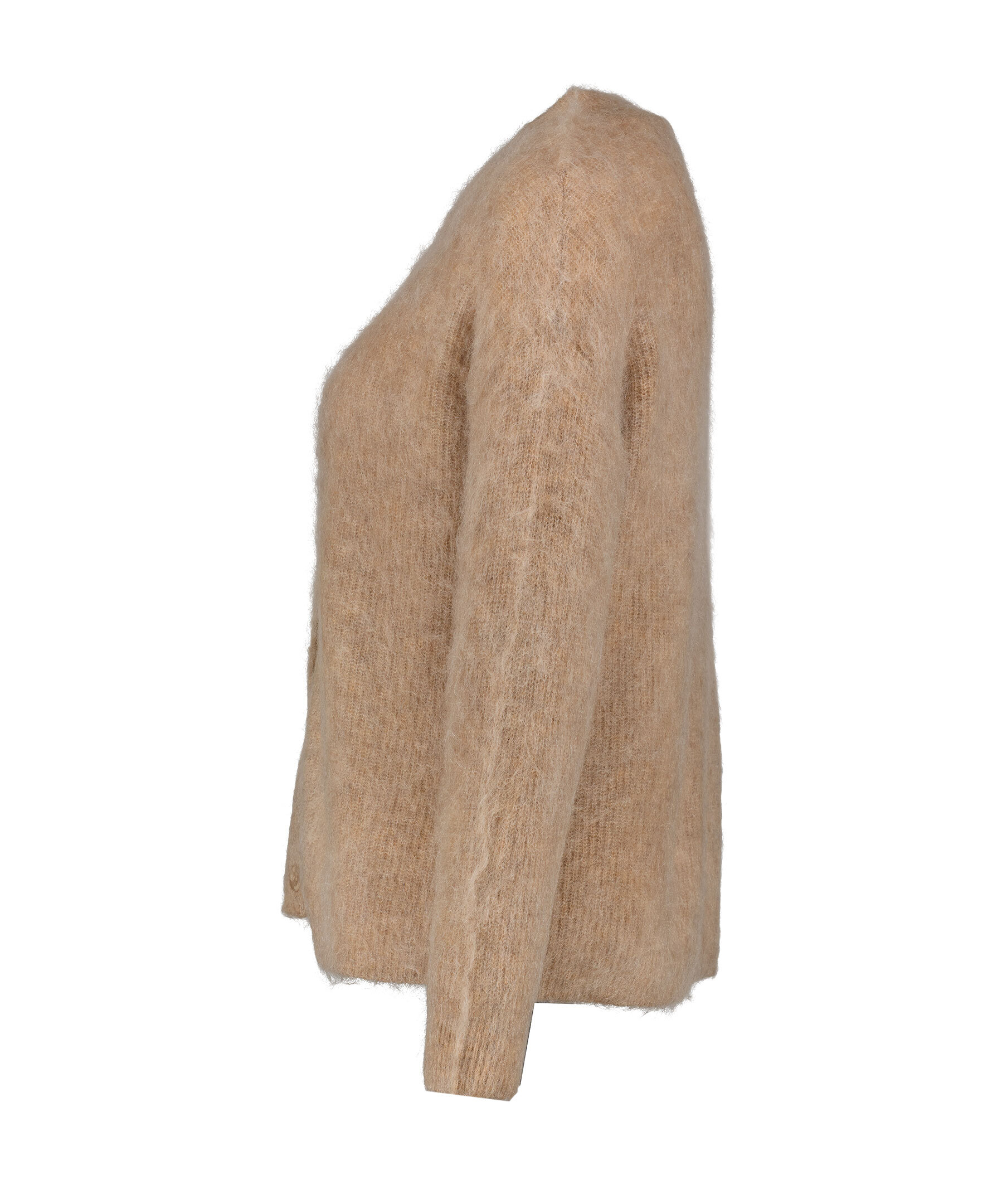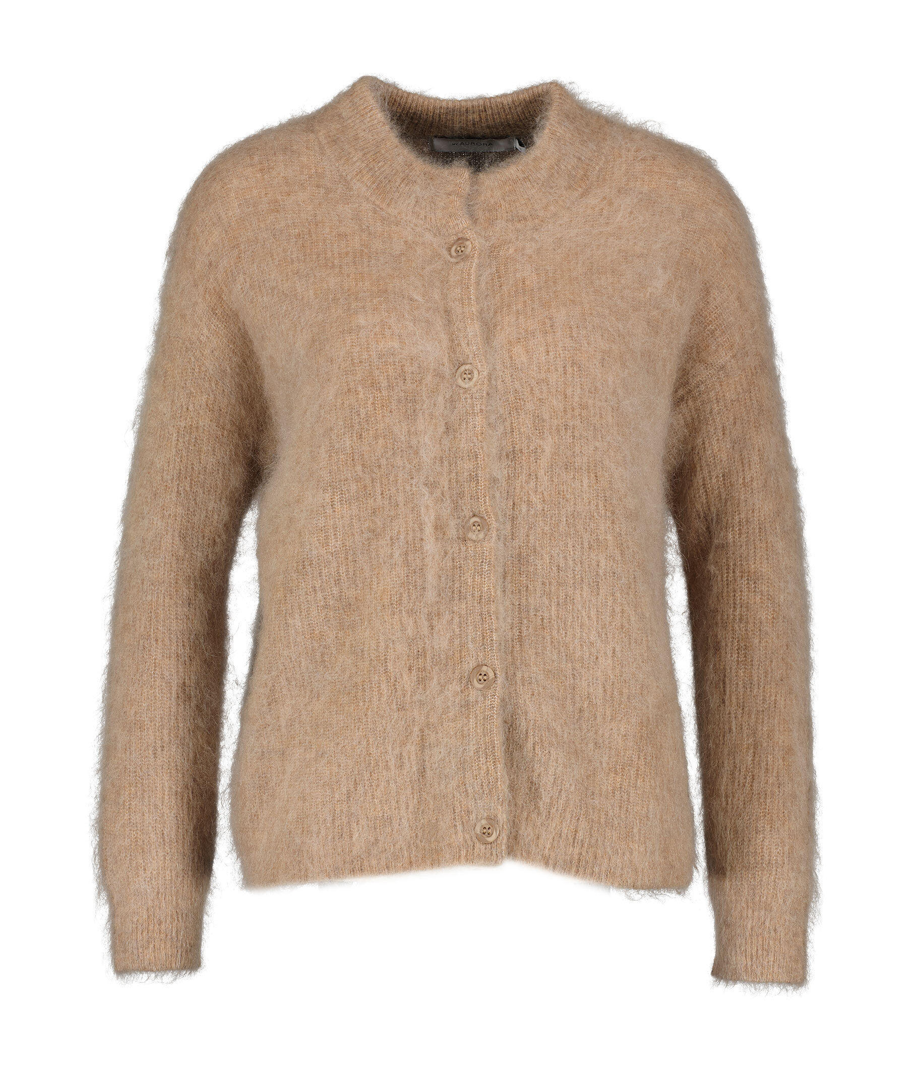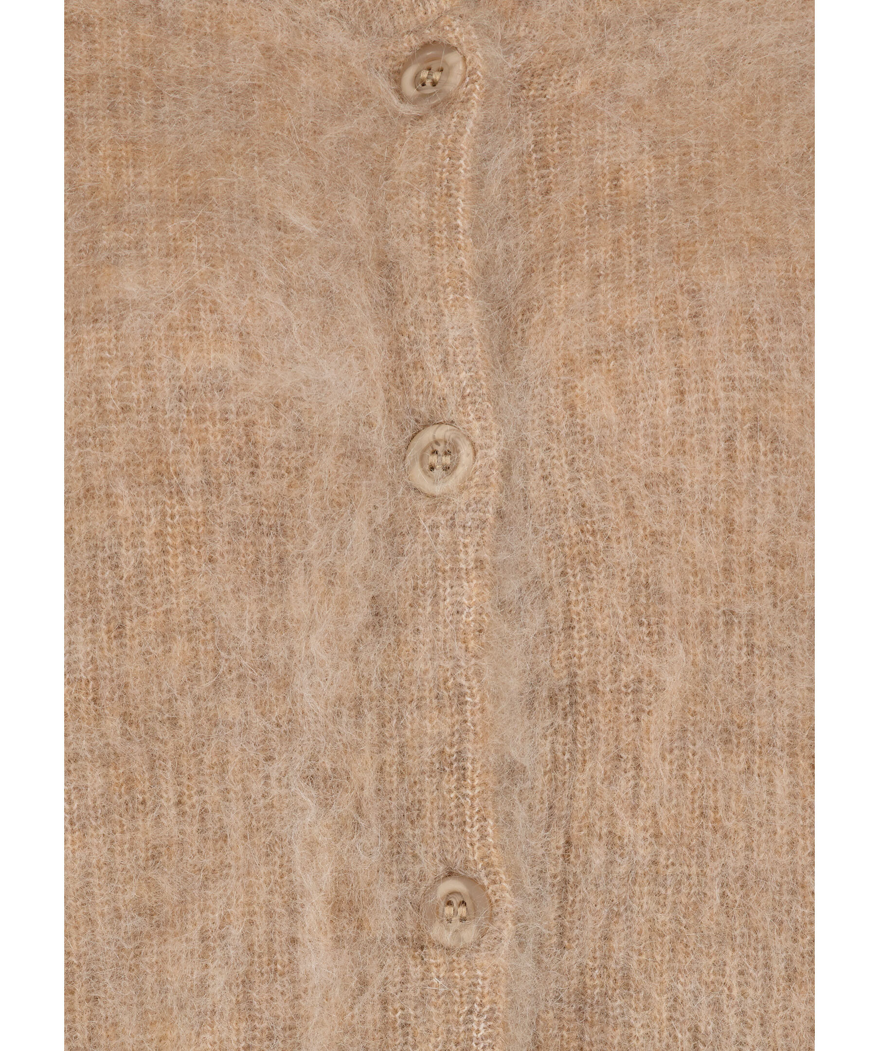 Beige stickad kofta från My Aurora Pink. Koftan har rundad halsringning, stängs framtill med knappar. Tillverkad av en ull och kid mohair blandning.