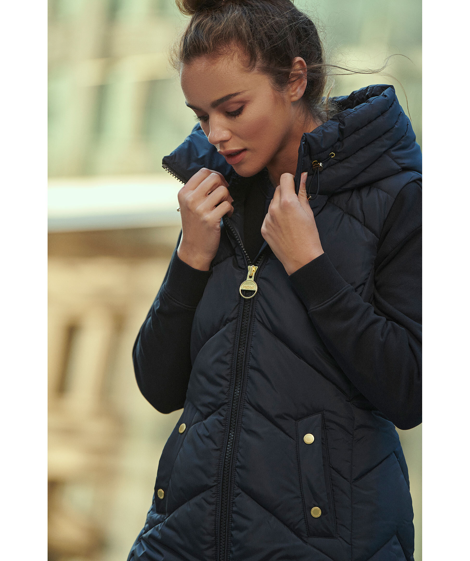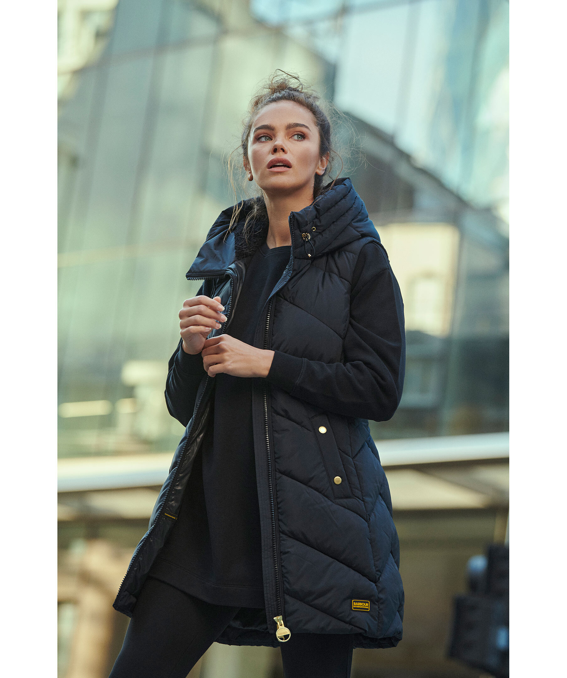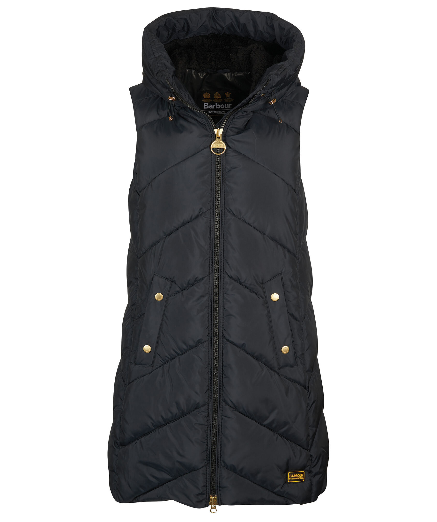 Längre, svart väst med luva från Barbour International. Tillverkad i 100% polyester. Stängs med tvåvägsdragkedja. Luvans insida är beklädd med pälsimitation. Två diagonala fickor som stängs med guldfärgade tryckknappar. Innerficka som stängs med dragkedja. Dragsko i luva och midja. Logotyp i silikon längst ner till vänster.