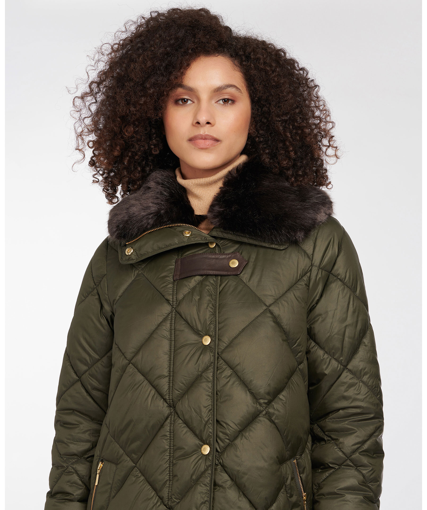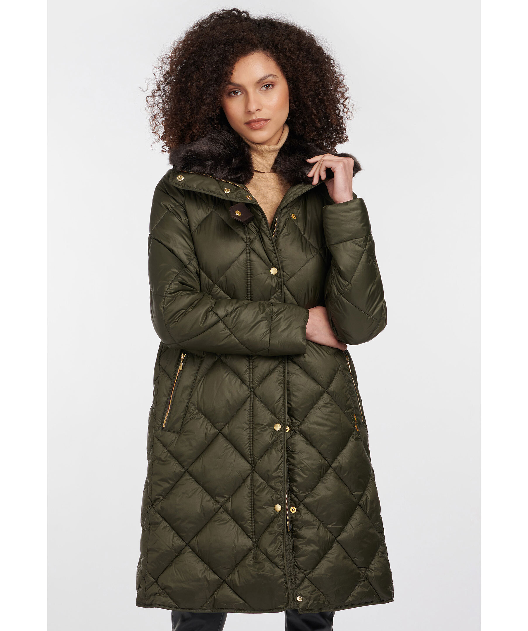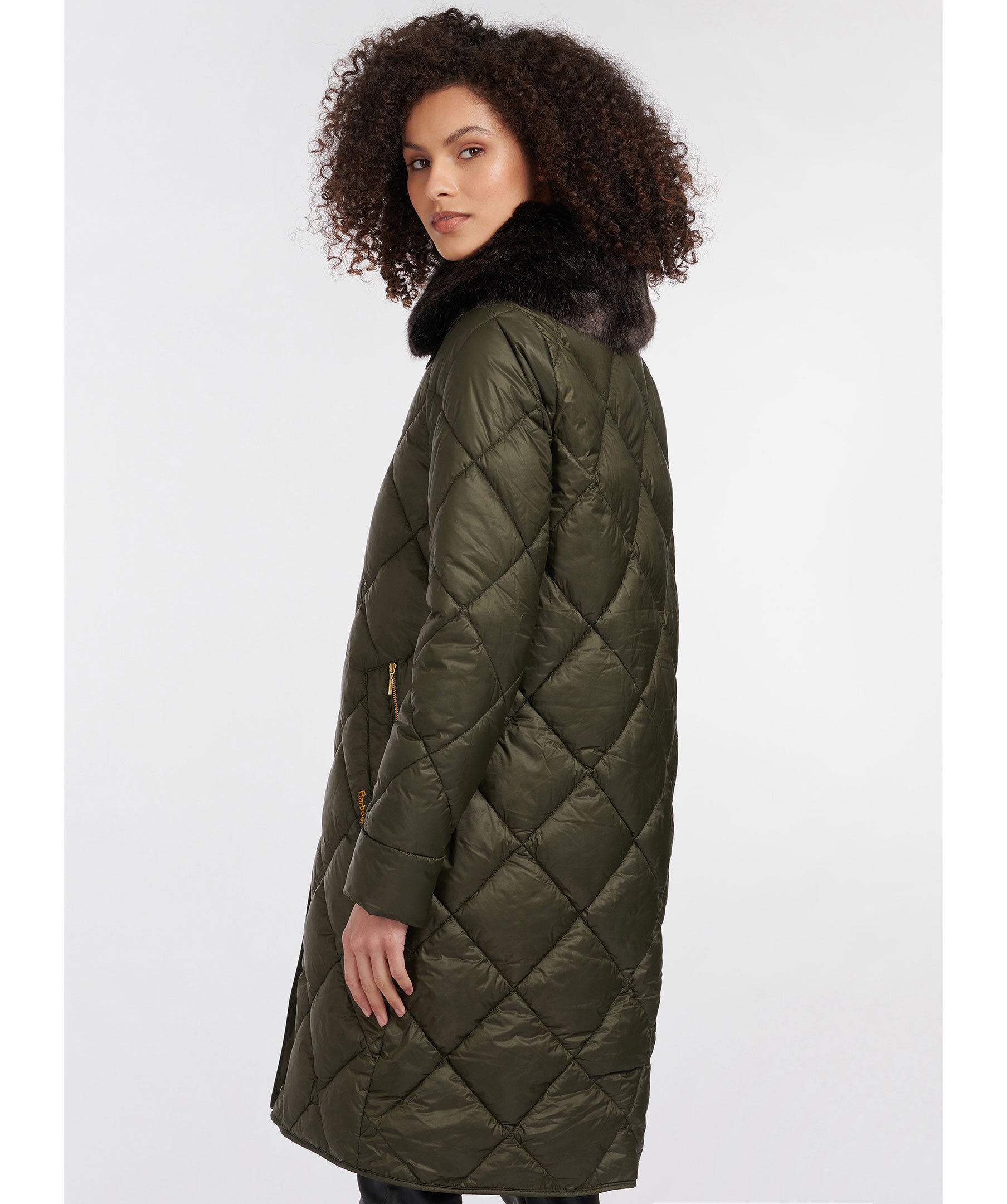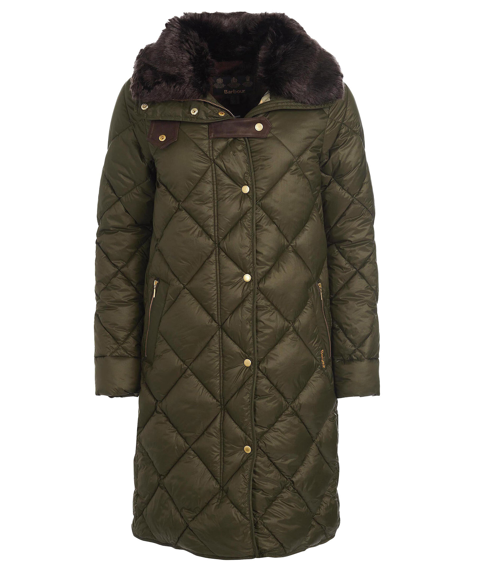 Mörkgrön quiltad kappa i en lång modell från Barbour. Kappan är gjord i ett semi glansigt vattenavvisande yttertyg, hög krage, två framfickor med dragkedja och en innerficka. Fodrad med mjuk polyester och ryggpartiet på insidan har ett mjukt konstpälsfoder. Avtagbar extra innerkrage i konstpäls. Läder spännen vid kragen. Kappan är tänkt att sluta vid knäna. Passar till höst och lätt vinter.