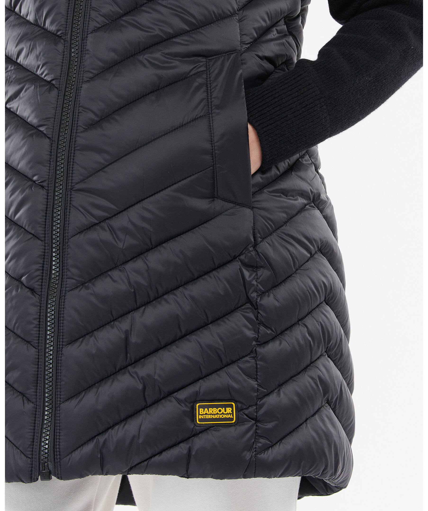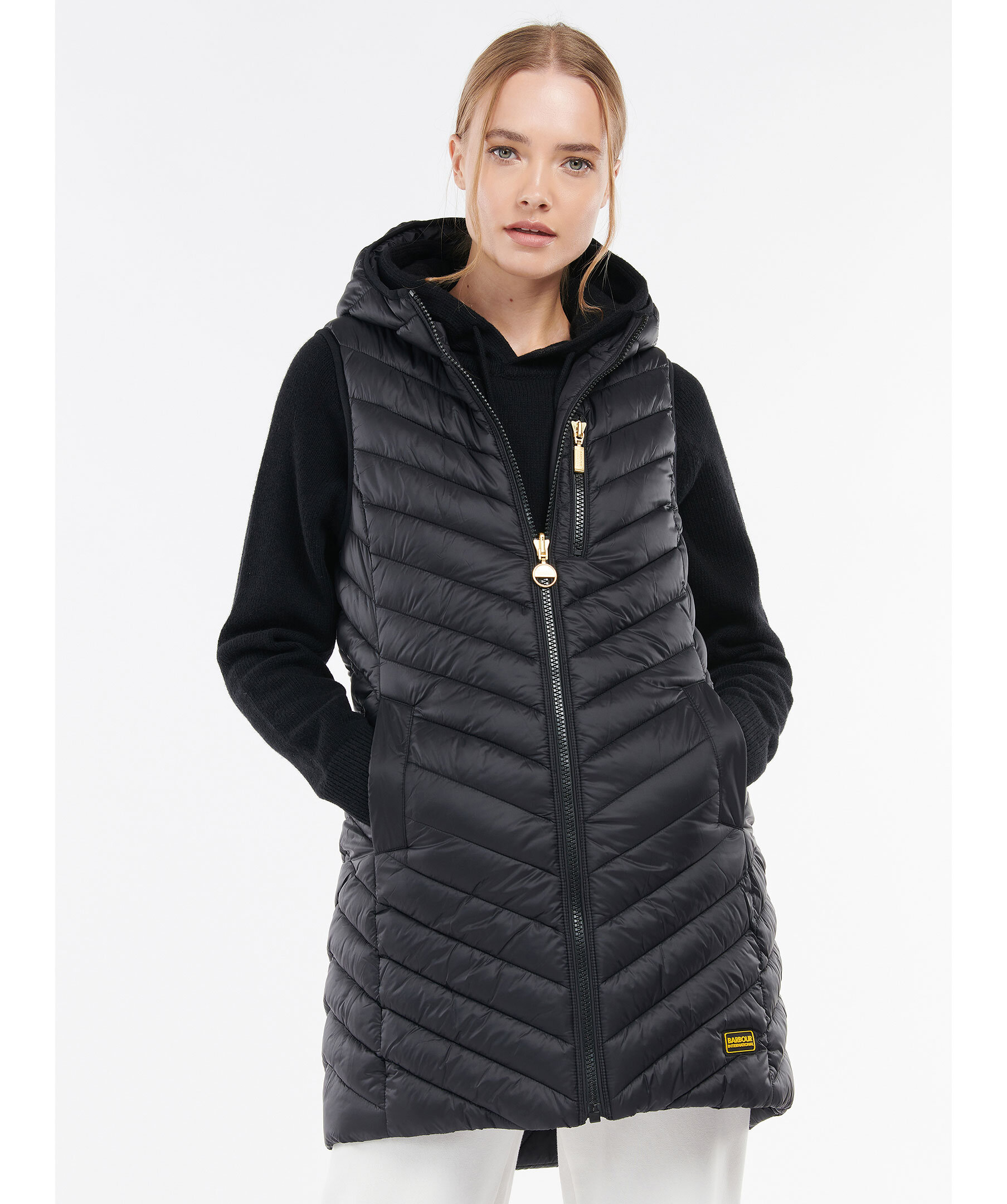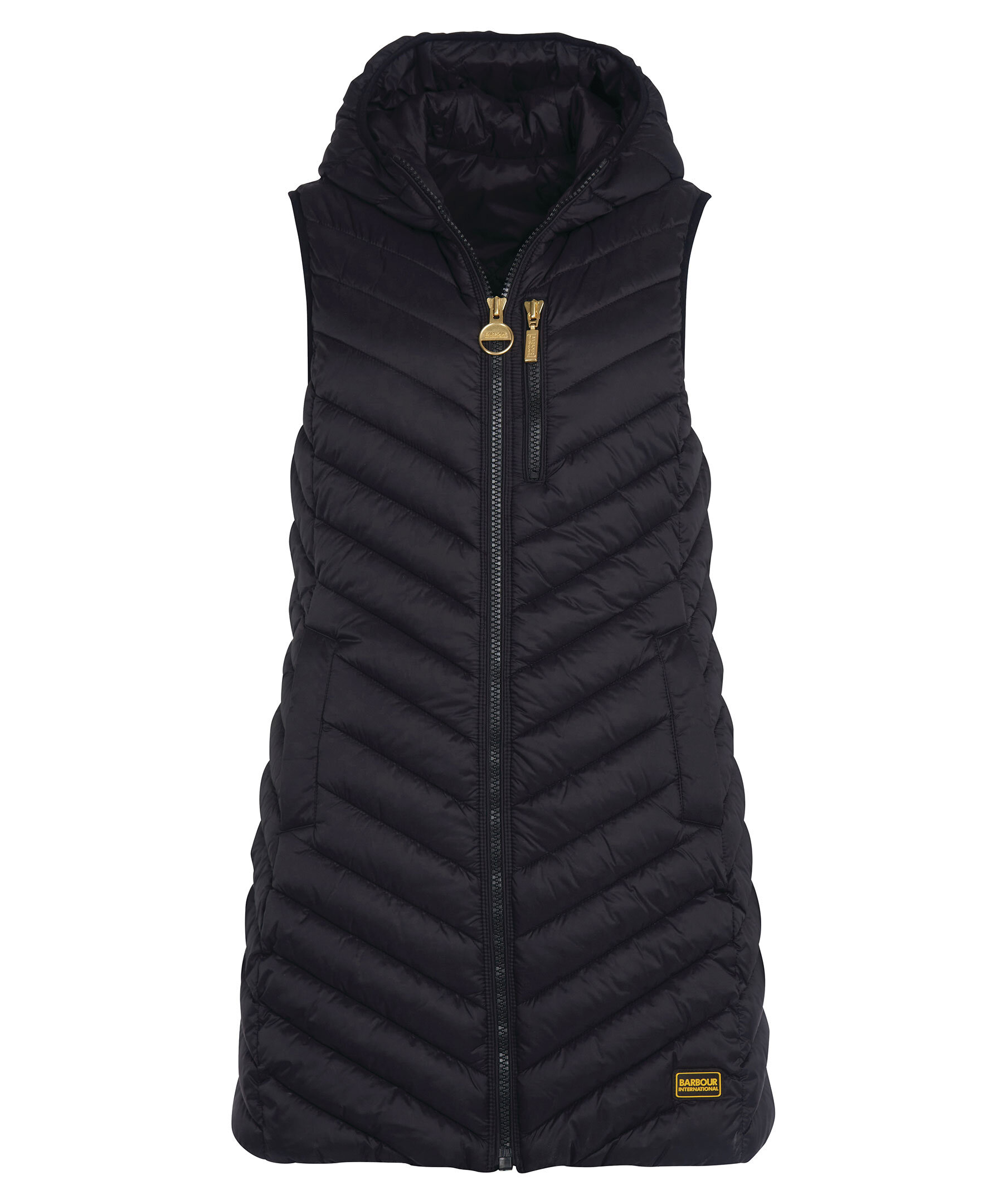 Längre, svart väst med luva från Barbour International. Tillverkad i 100% polyamid. Stängs med guldfärgad dragkedja. Två framfickor och en bröstficka. Dragsko i luva och midja. Logotyp i silikon längst ner till vänster.