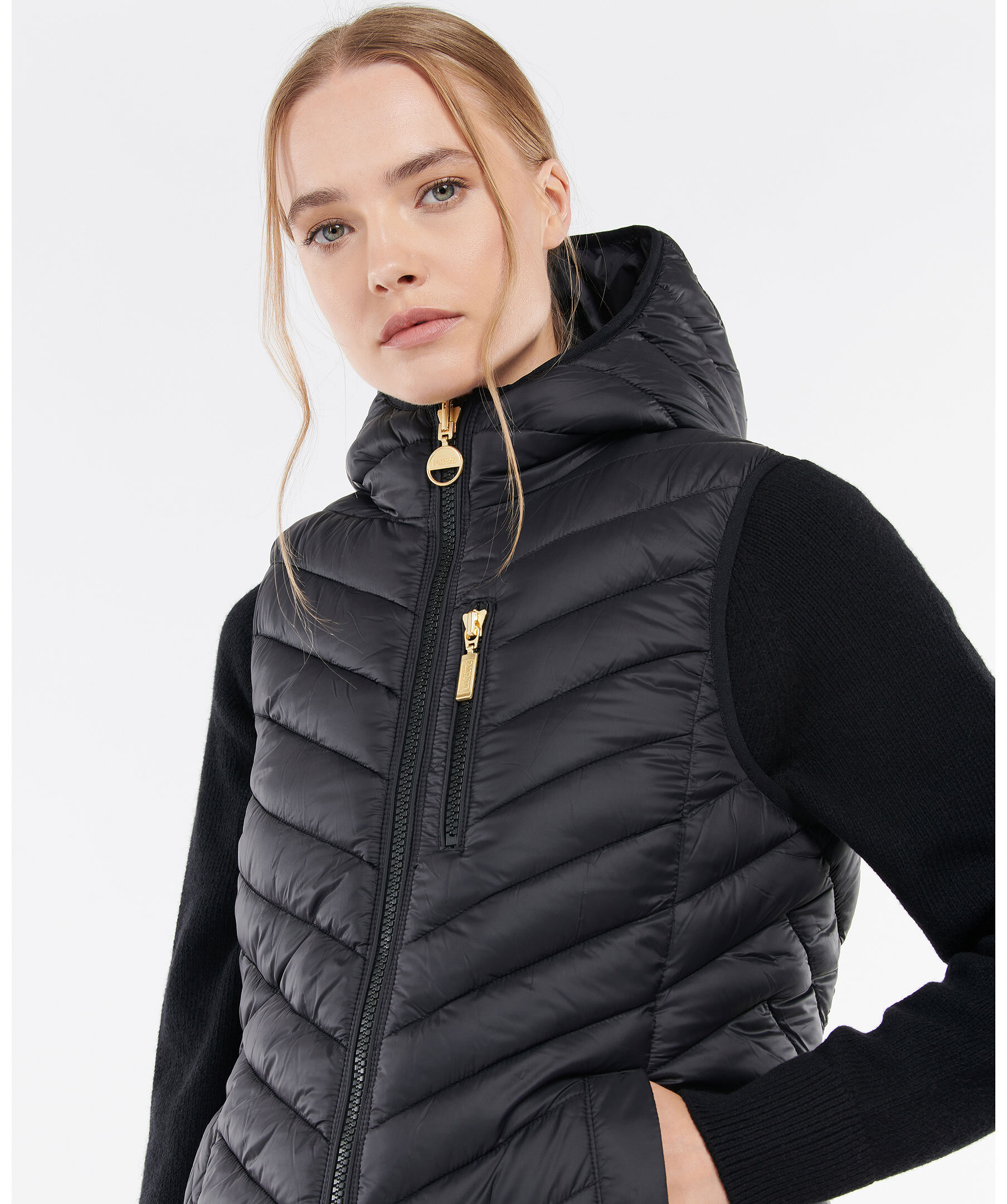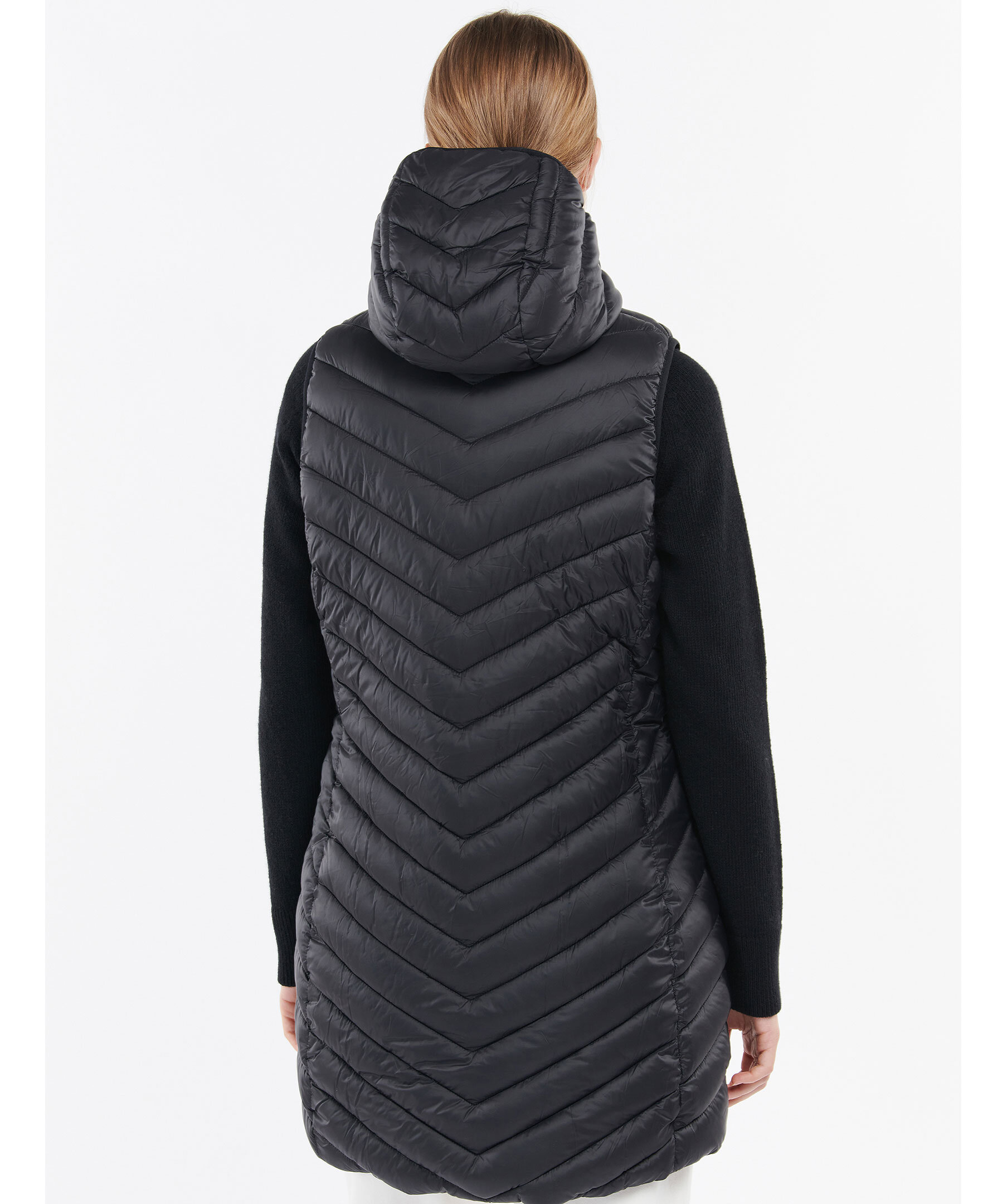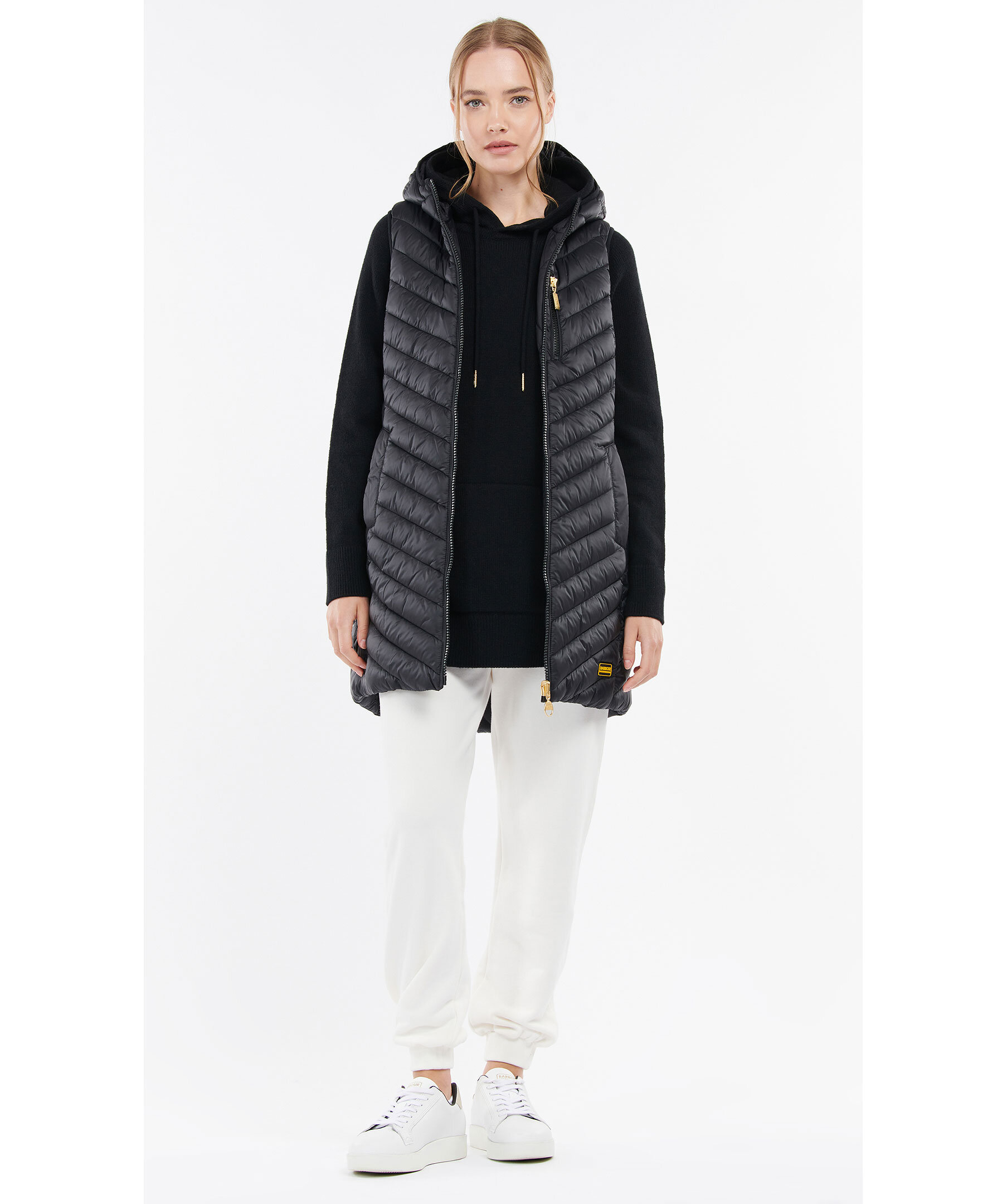 Längre, svart väst med luva från Barbour International. Tillverkad i 100% polyamid. Stängs med guldfärgad dragkedja. Två framfickor och en bröstficka. Dragsko i luva och midja. Logotyp i silikon längst ner till vänster.