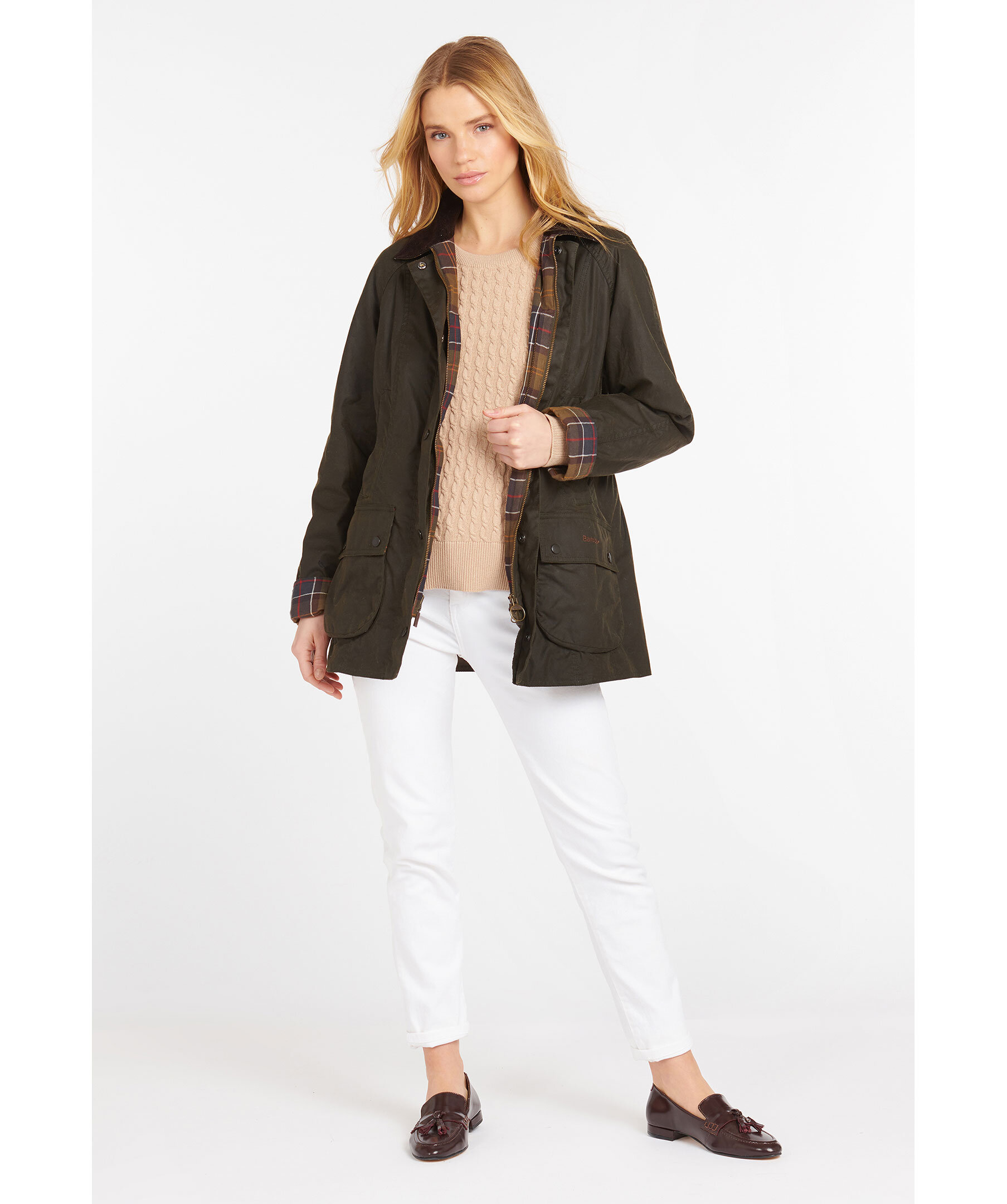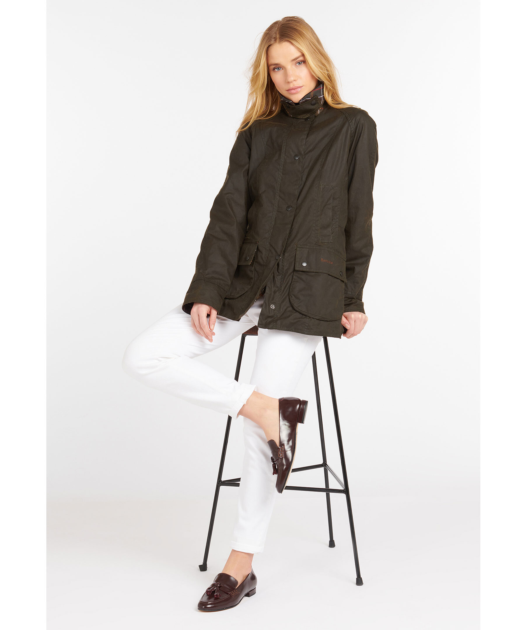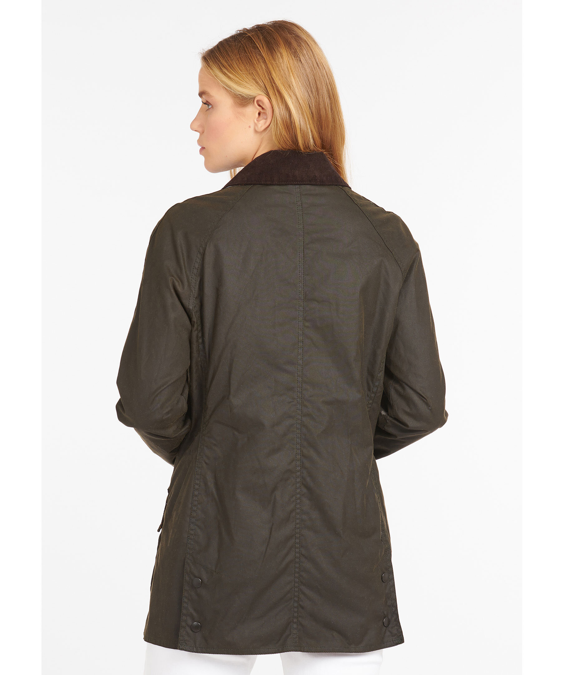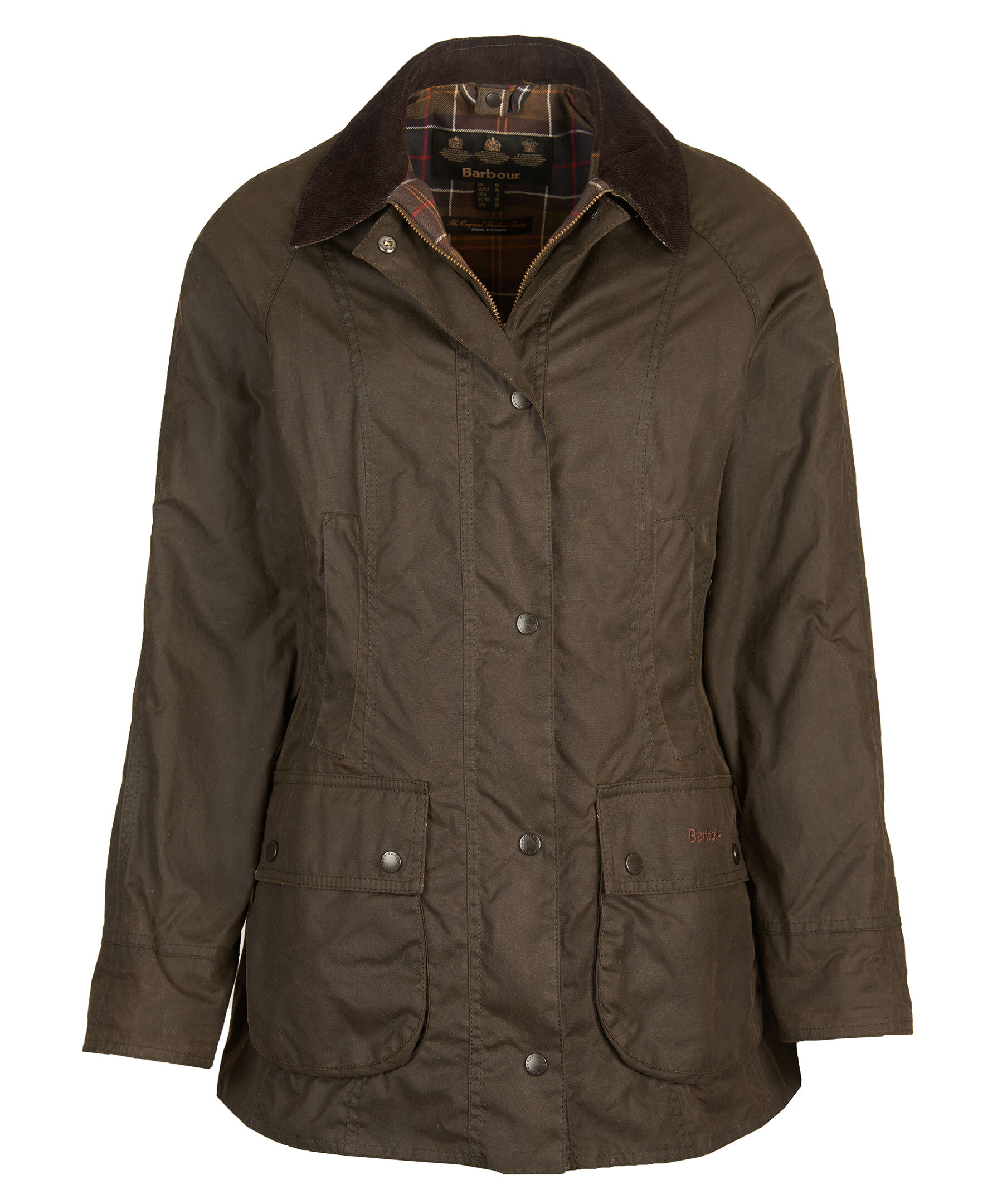 Mörkgrön höstjacka från Barbour i vaxad bomull. Krage i brunt manchestertyg, fyra fickor fram, diskret logotyp på vänster framficka, en innerficka med dragkedja. Slits med tryckknappar baktill. Jackan stängs med en tvåvägsdragkedja och tryckknappar.