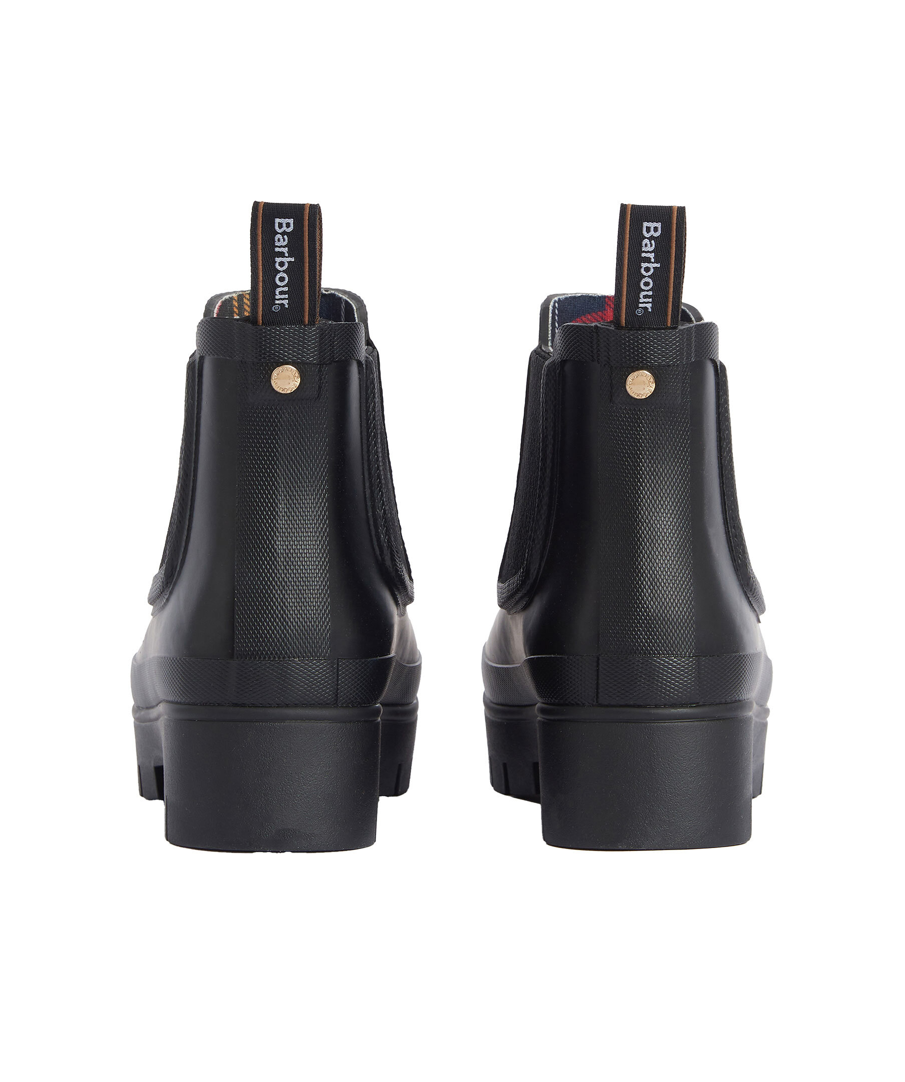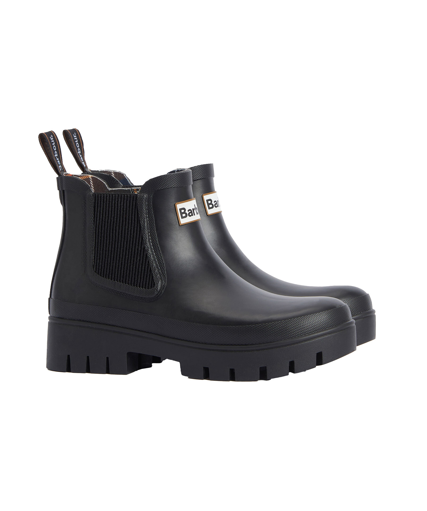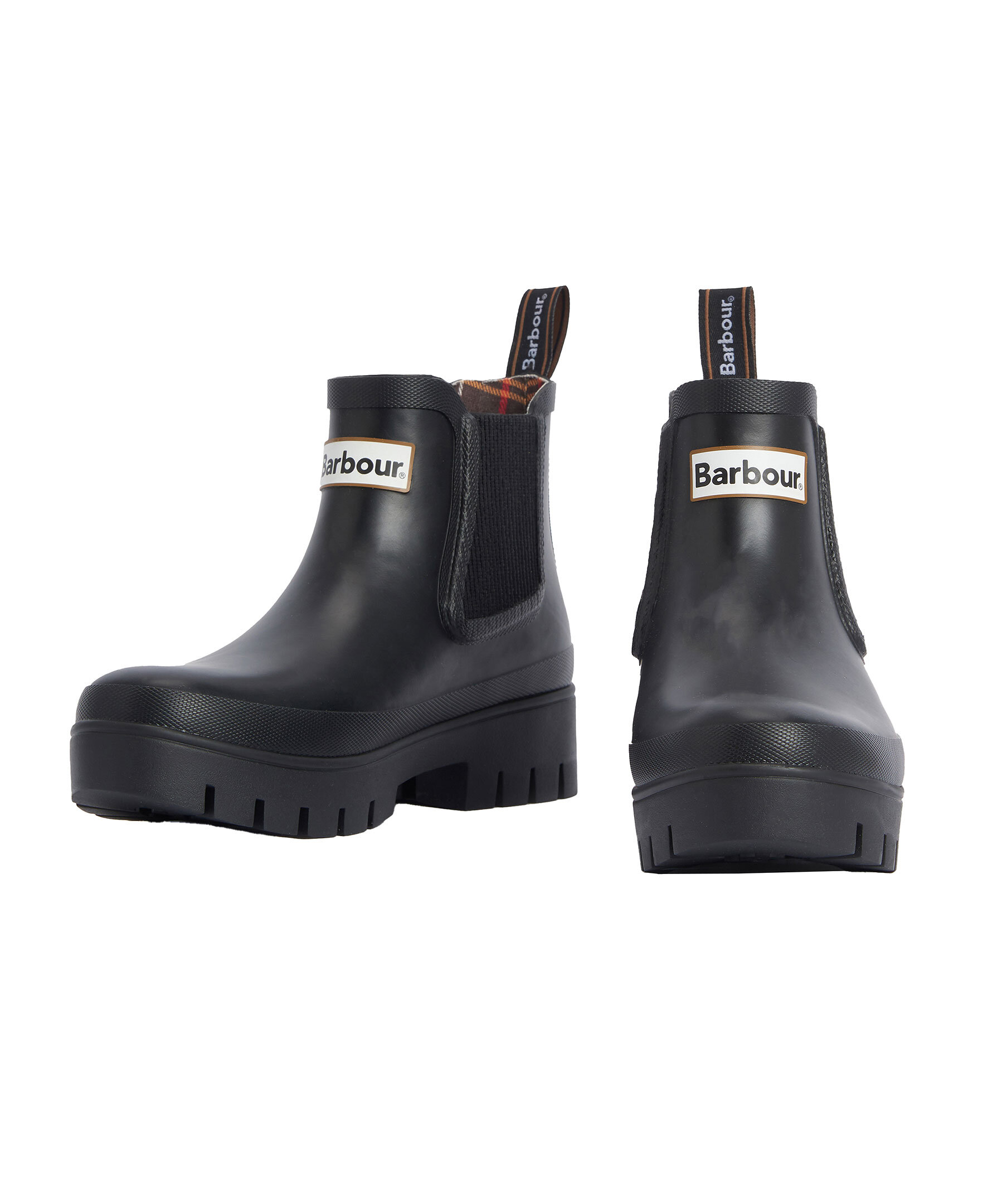 Svarta stövlar från Barbour. Stövlarna är designade för de blötaste utomhusäventyren och har en tjock sula, elastiska sidokilar och dragflikar för att göra det lätt att klä på sig samt logotyp på framsidan. Tillverkade i gummi. Klackhöjd: 4cm.