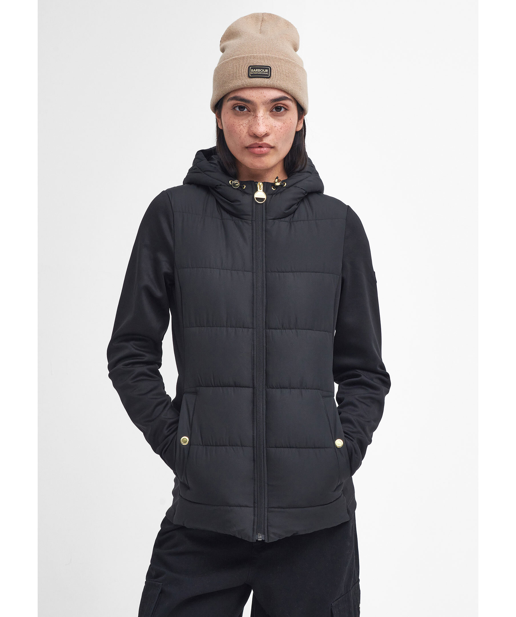 Svart, quiltad hybridjacka från Barbour. Jackan stängs med dragkedja och har huva med dragsko, två sidfickor med tryckknapp och logotyp i gummi på vänster ärm. Tillverkad i en polyesterblandning.