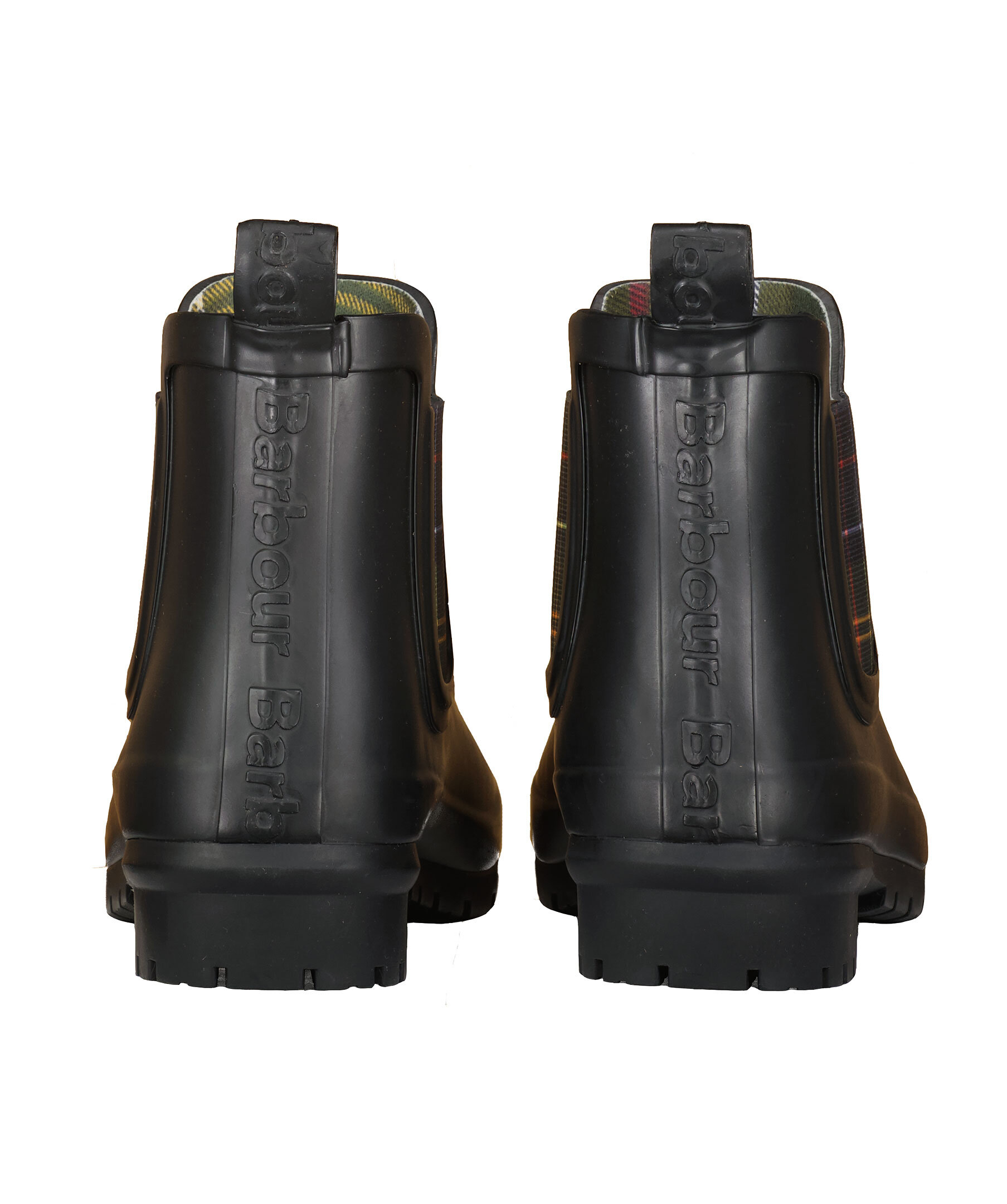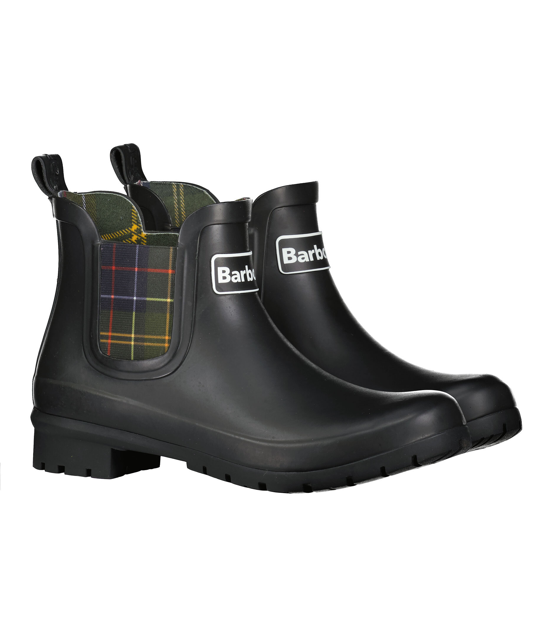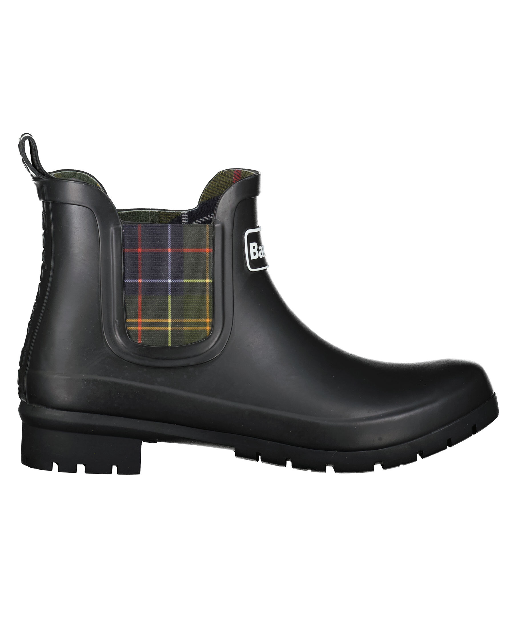 Svarta gummistövlar från Barbour. Insida och stretchigt material vid sidan i tartan mönster. Stor logotyp i vitt framtill samt diskret logotyp bak vid hälen.