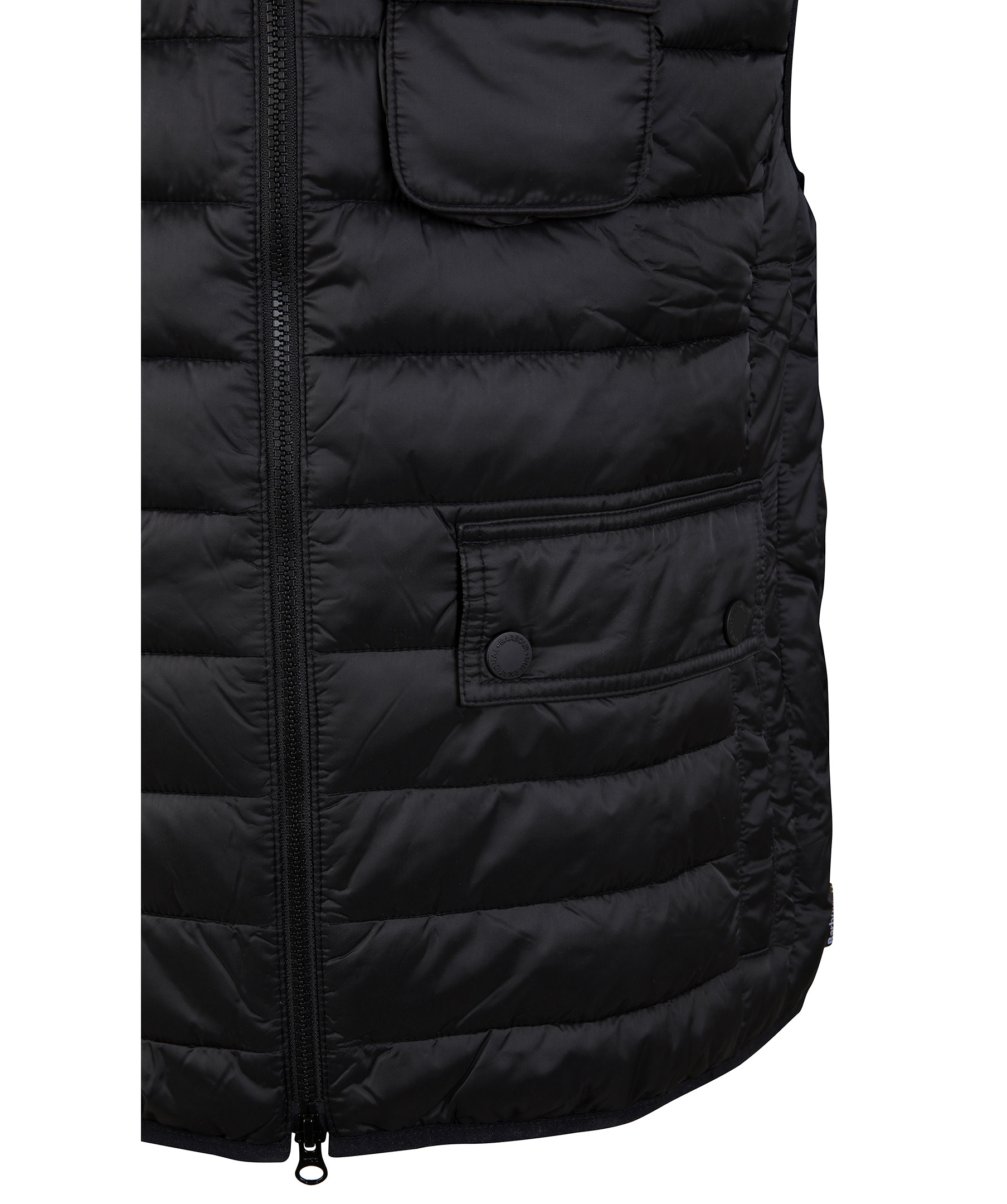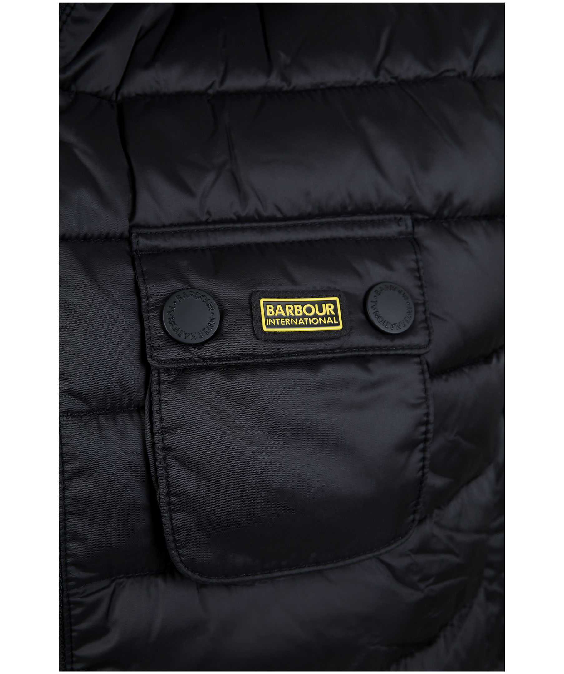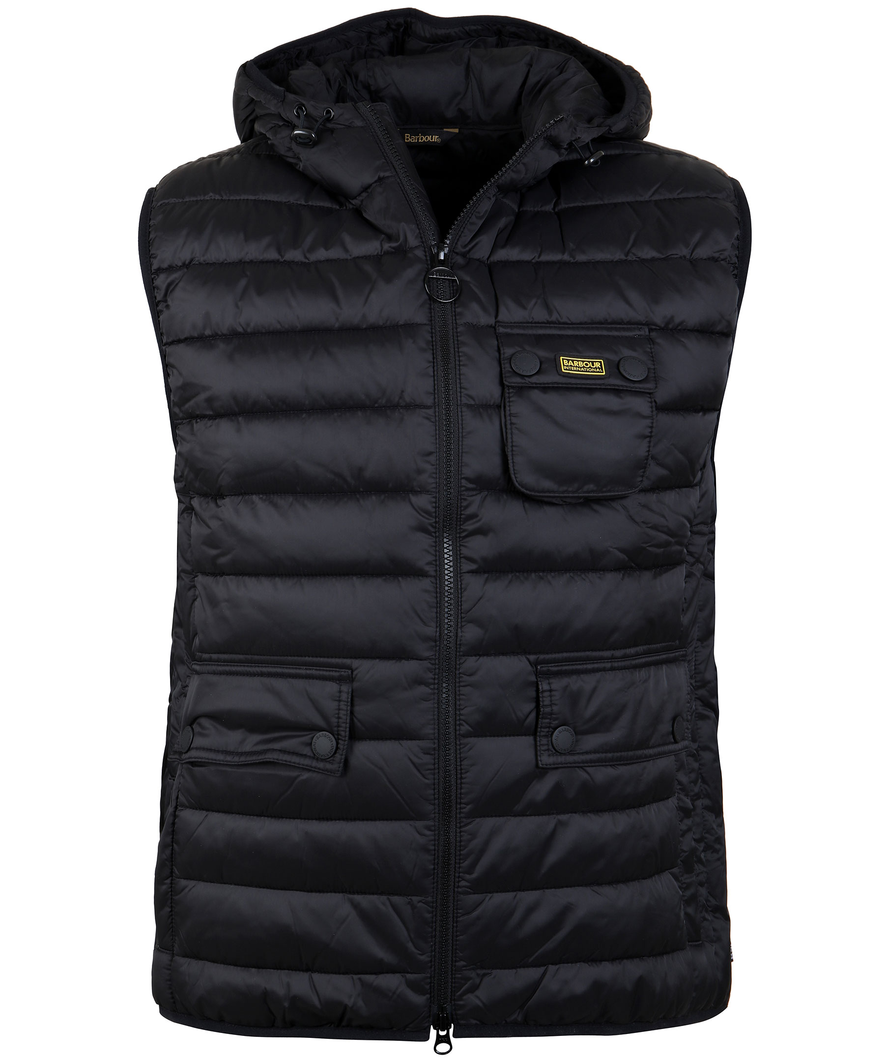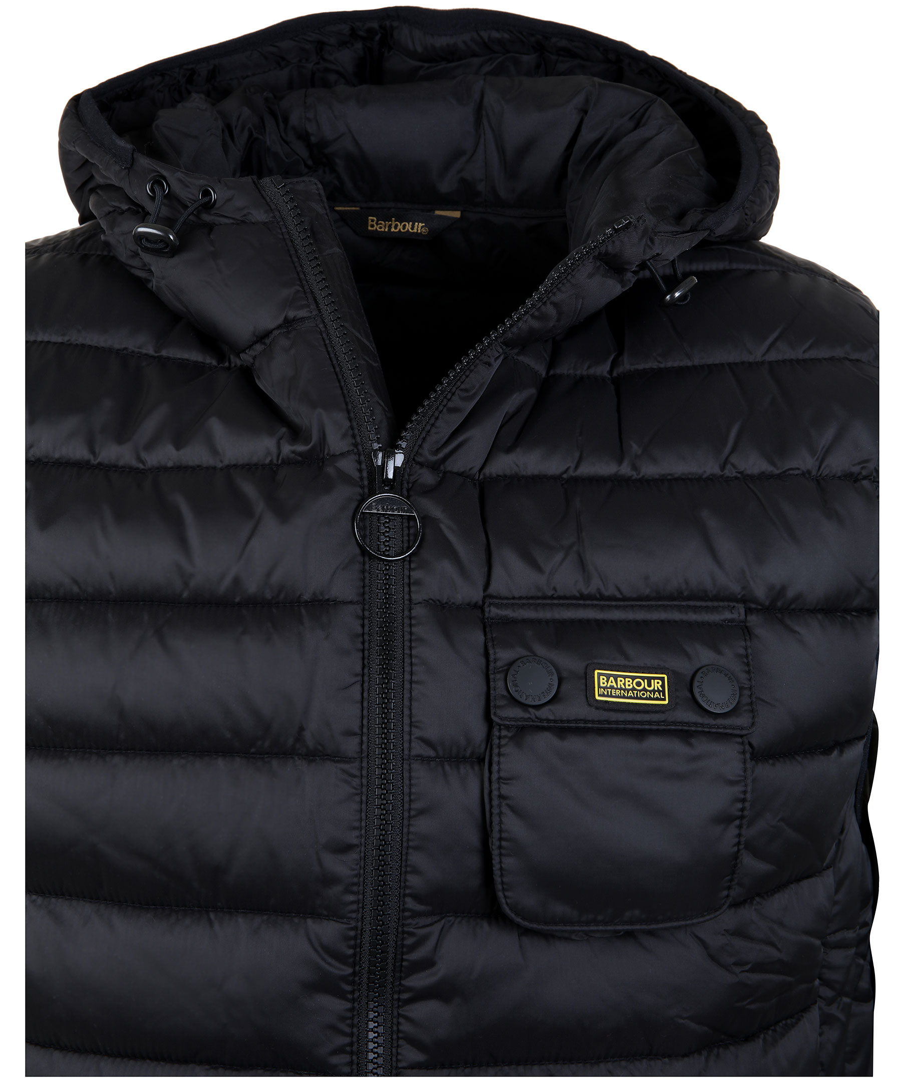 Svart fodrad väst med luva från Barbour International. Tillverkad i polyamid och fylld med polyester. Västen har en quiltad design, fem framfickor varav en bröstficka, en innerficka. Dragsko i luva och logotyp på bröstfickans ficklock.