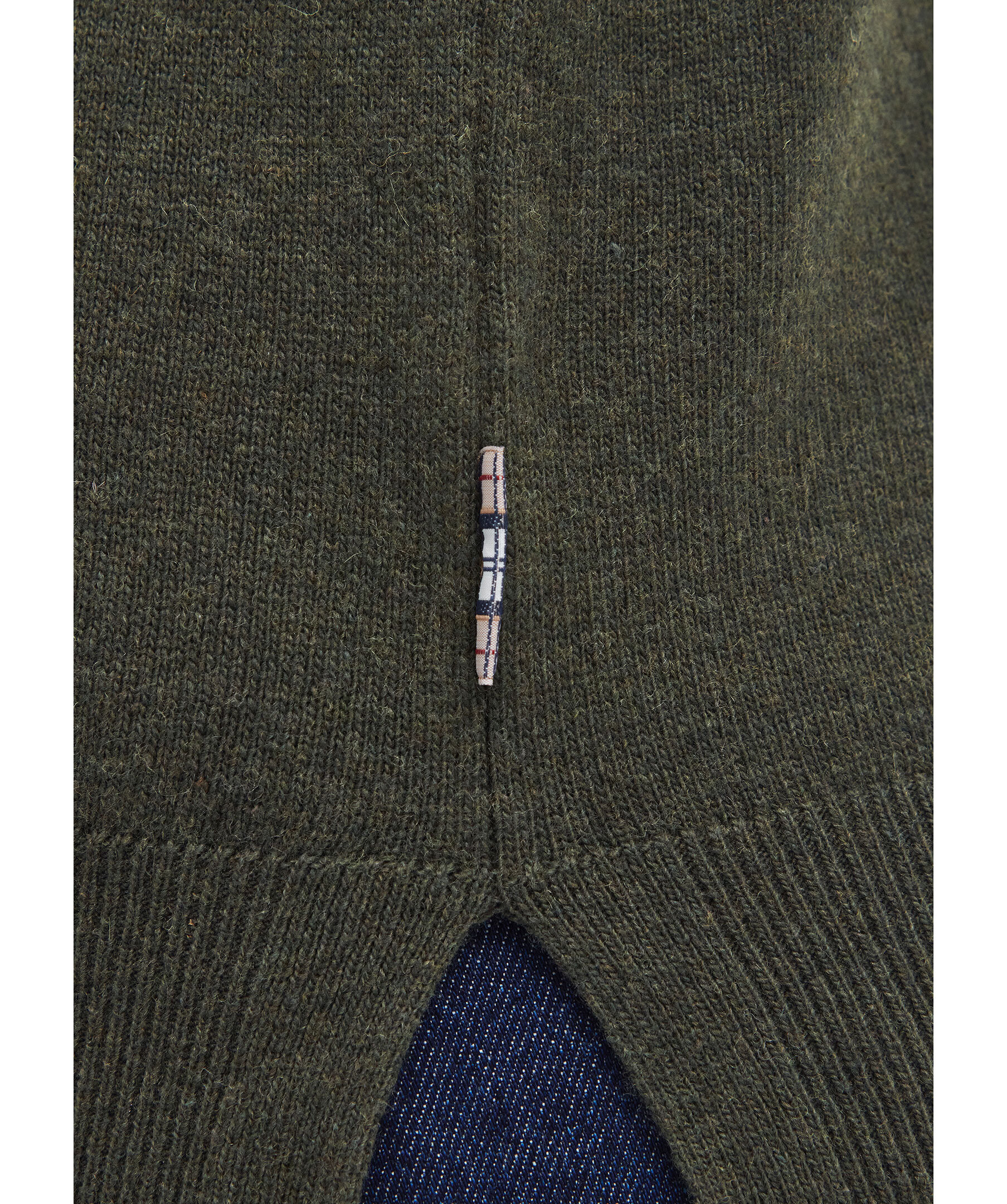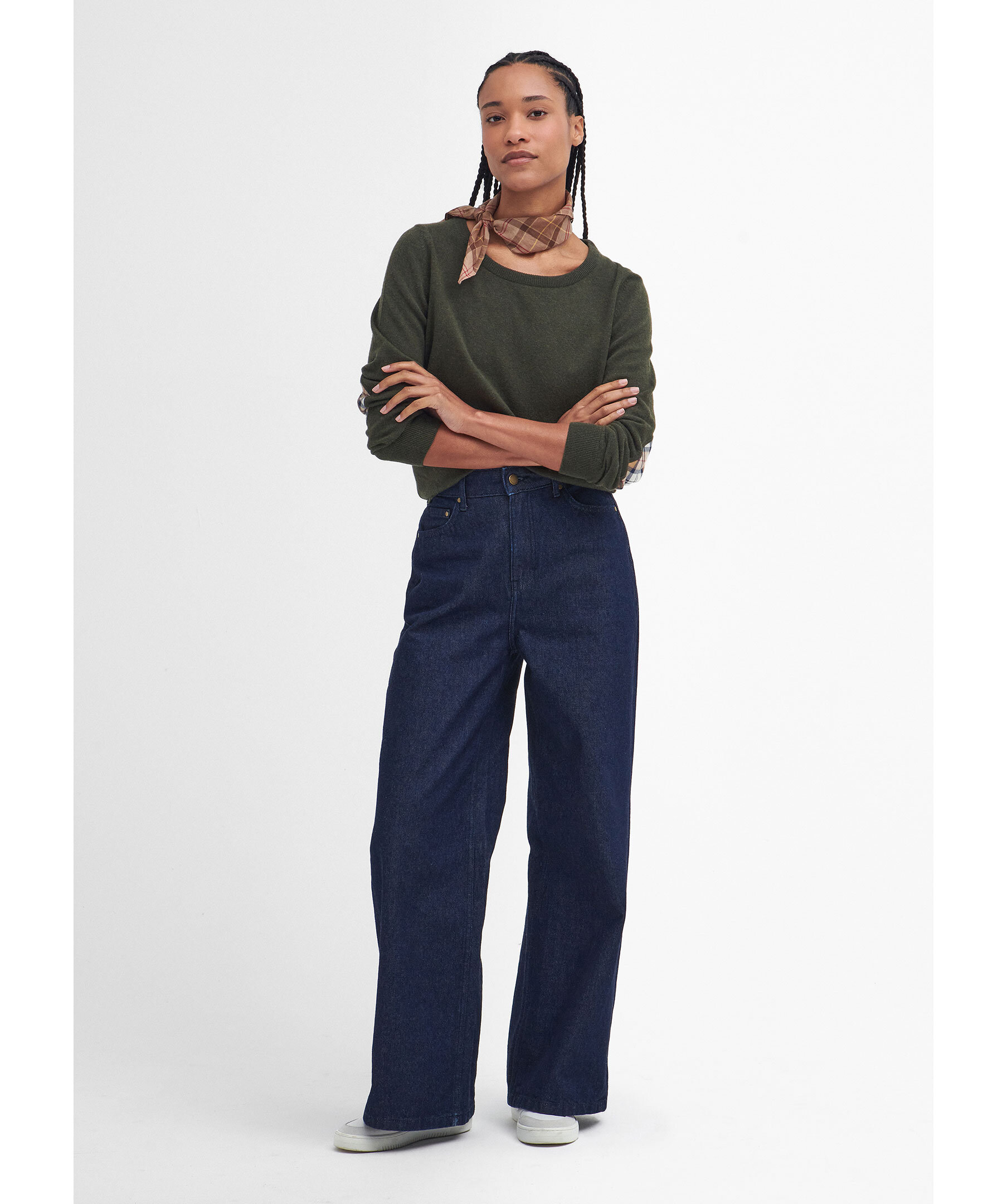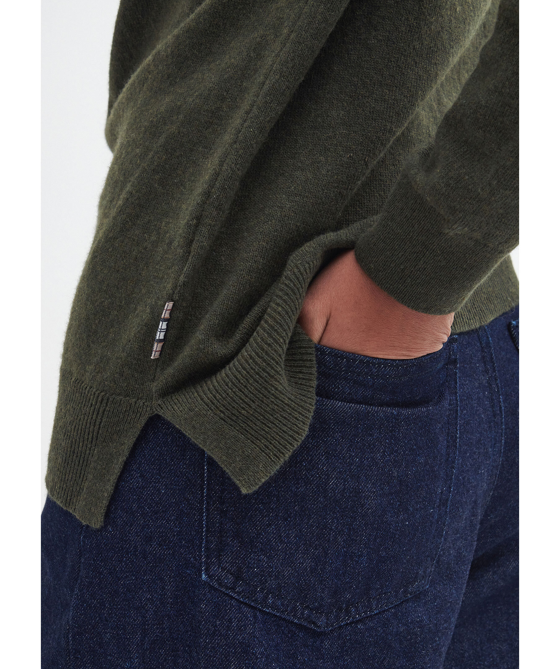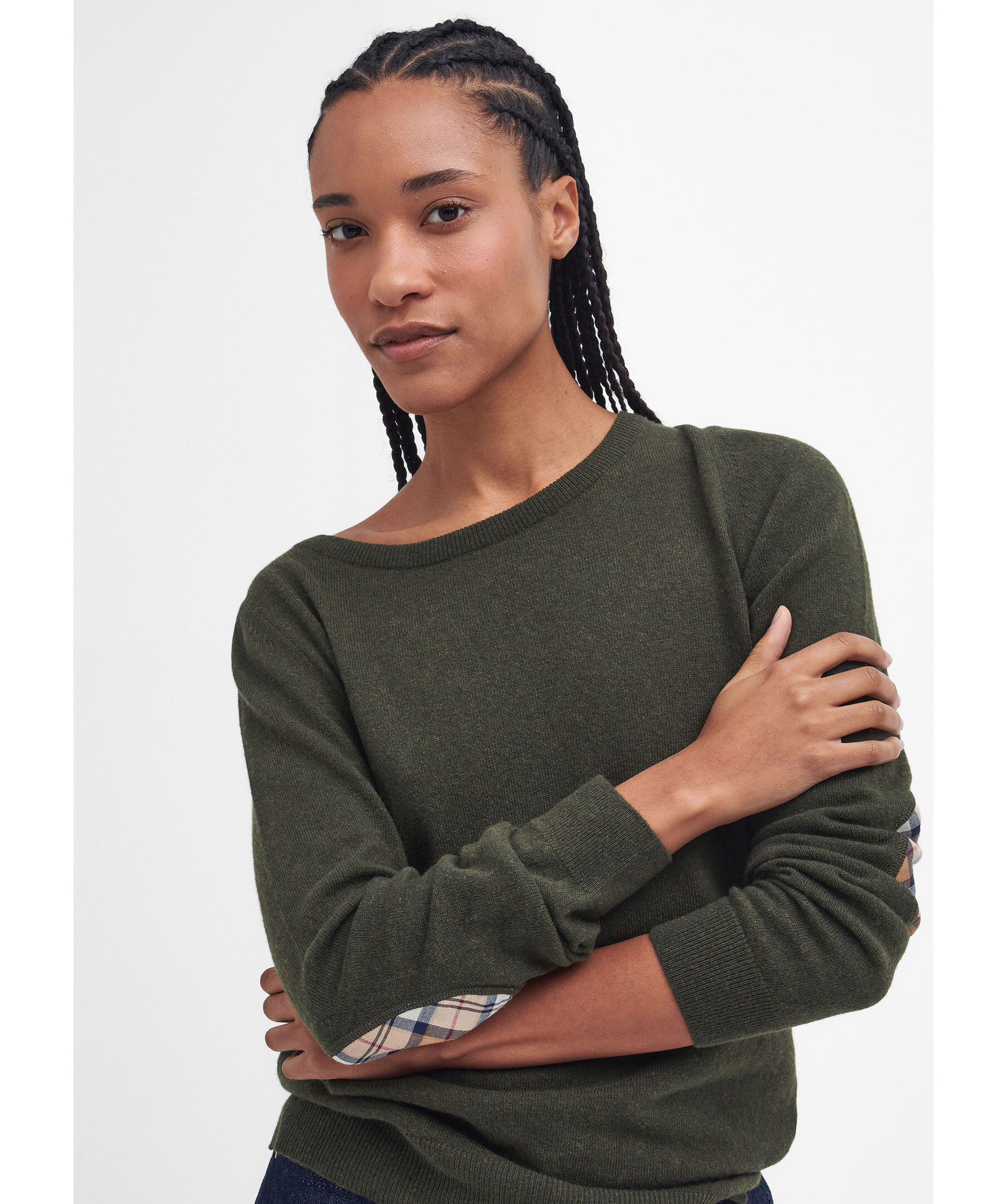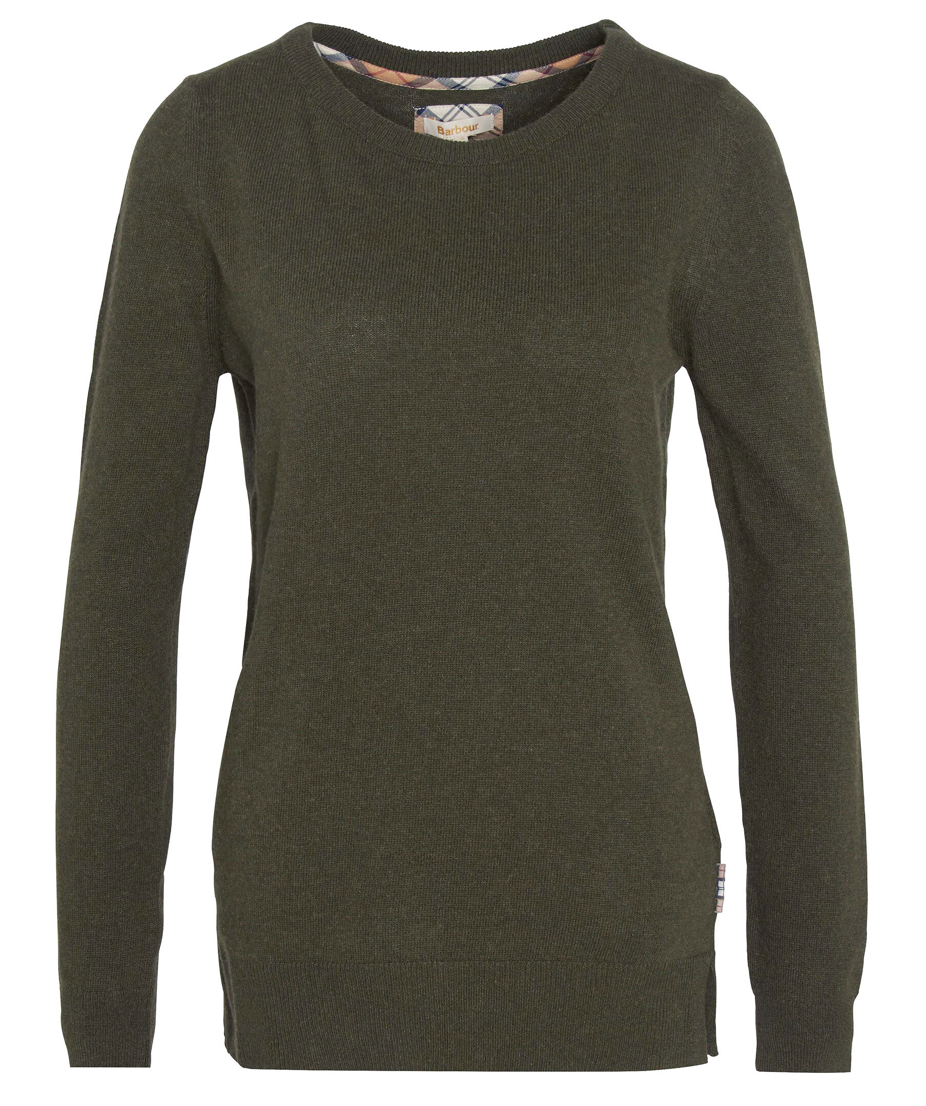 Olivgrön, finstickad tröja och har rund halsringning från Barbour. Långa ärmar och ribbade kanter. Tillverkad i mjuk blandning av ull och bomull och har patchar på armbågar med rutigt tartanmönster.