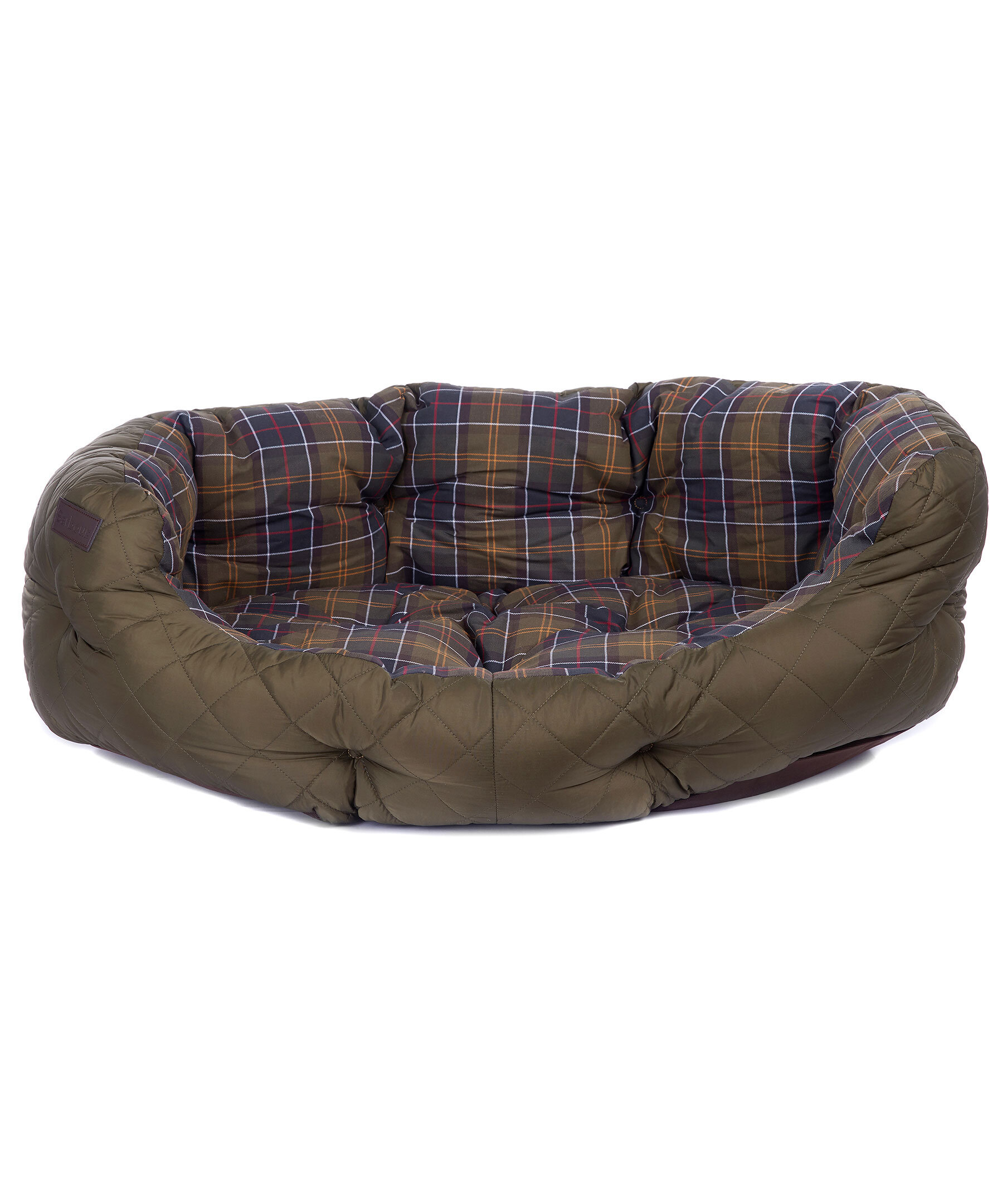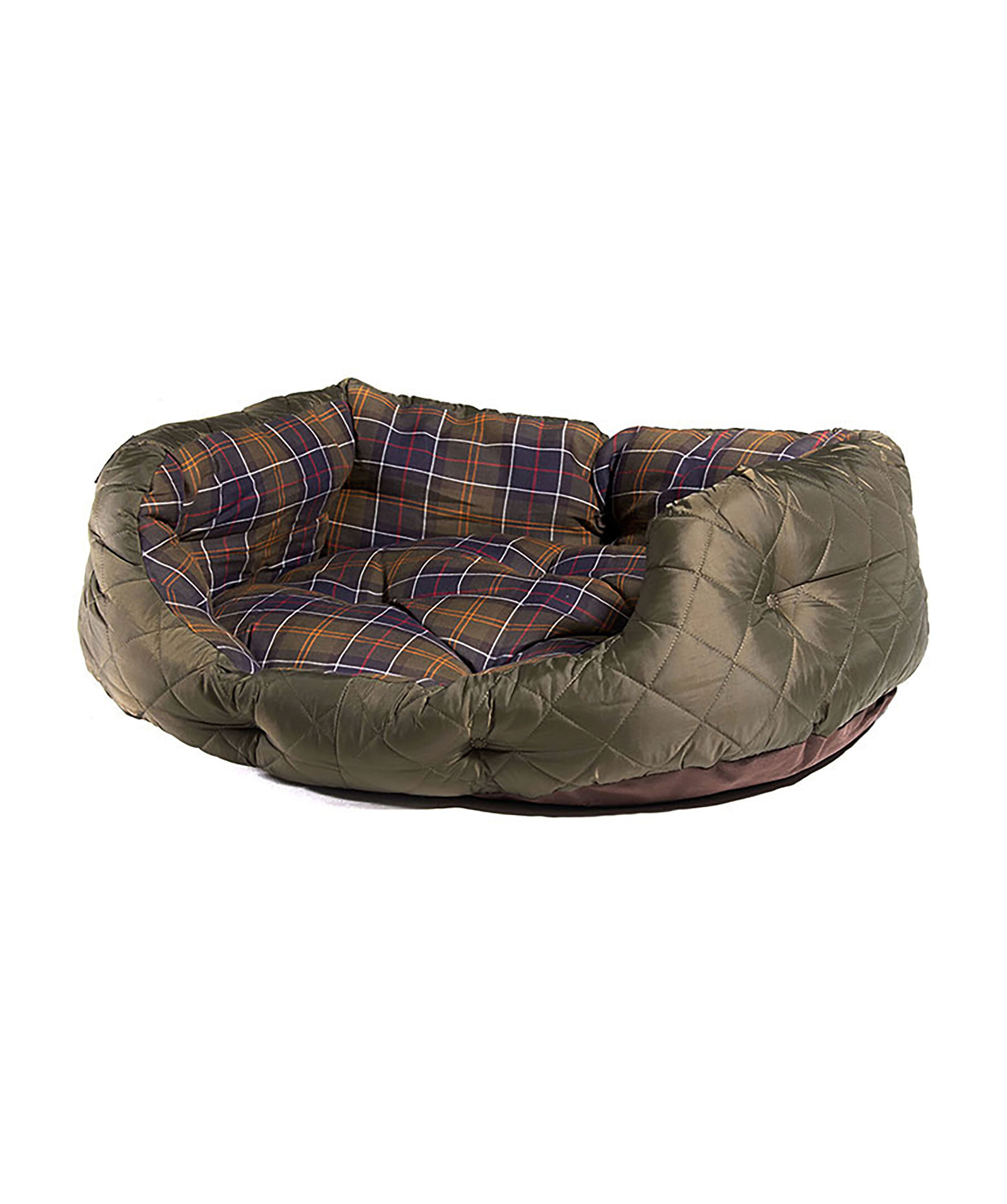 Fin sovsäng för hundar från Barbour. Militärgrönt, quiltat polyamidtyg på utsidan och en mysigt bomullsfoder i Barbours ikoniska Classic Tartan mönster på insidan. Den har enastående komfort och funktionalitet och är utformad med höga sidor för att hålla din hundkamrat mysig och säker, plus en tappad front för att hunden enkelt ska kunna lägga sig i den. Patch med logotyp på sidan. Dynan är avtagbar och tvättbar. Storlek: 78 x 62 x 31.
