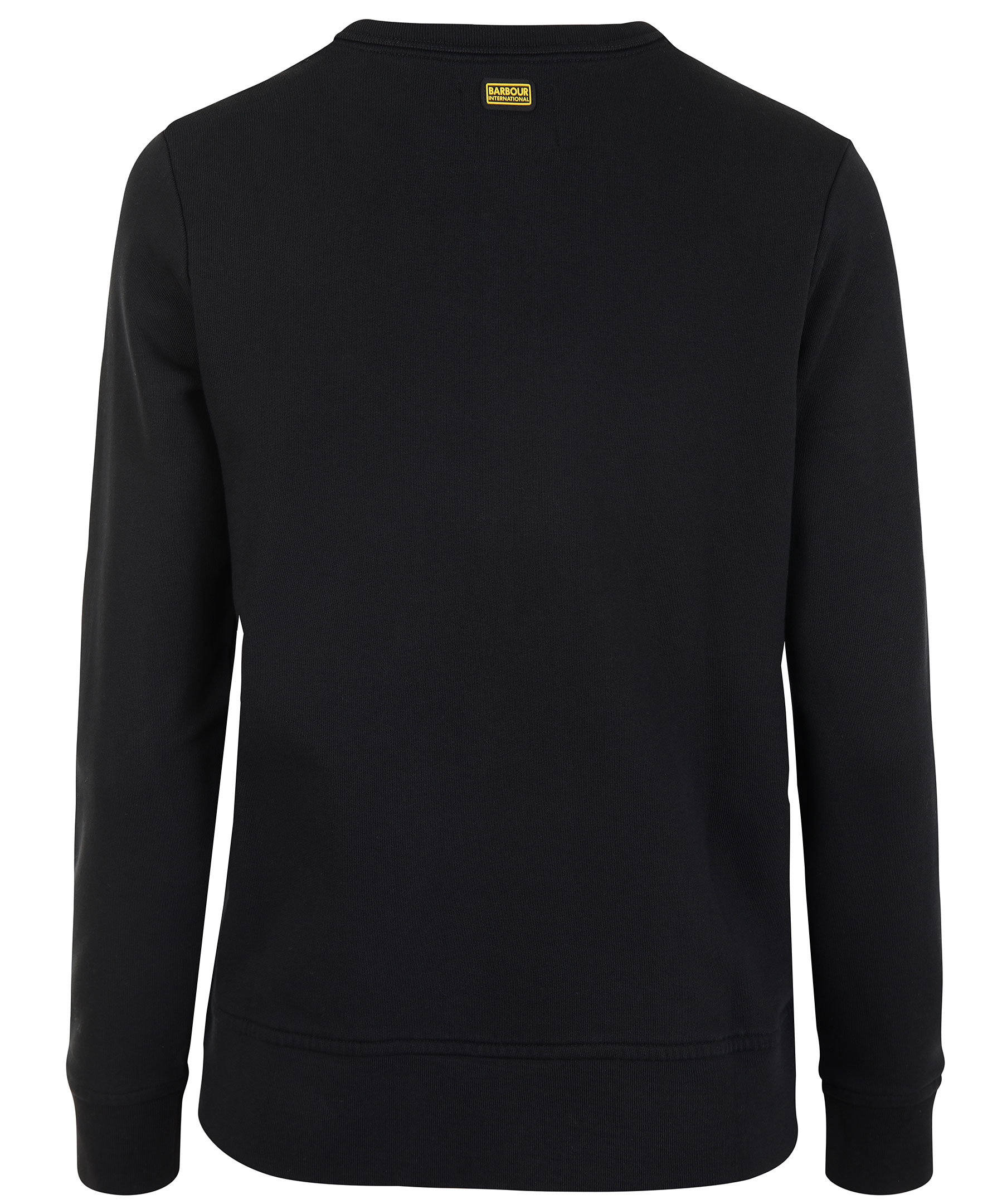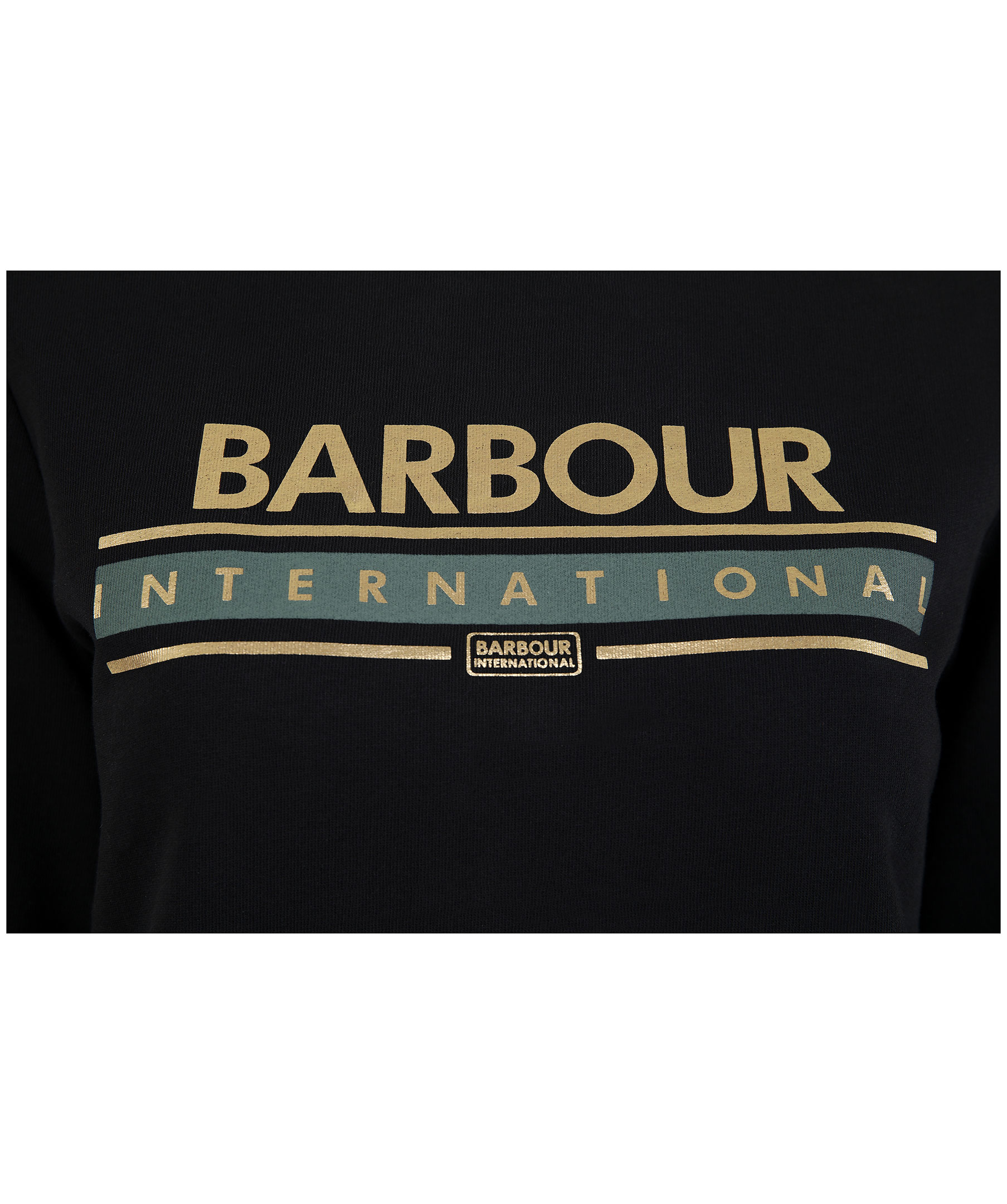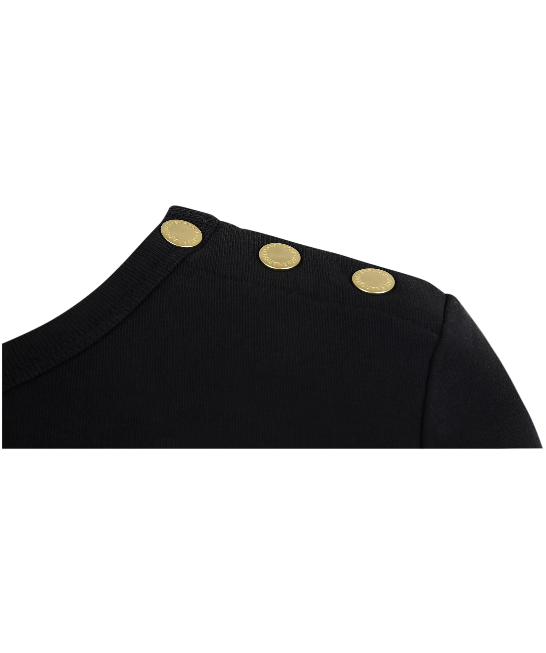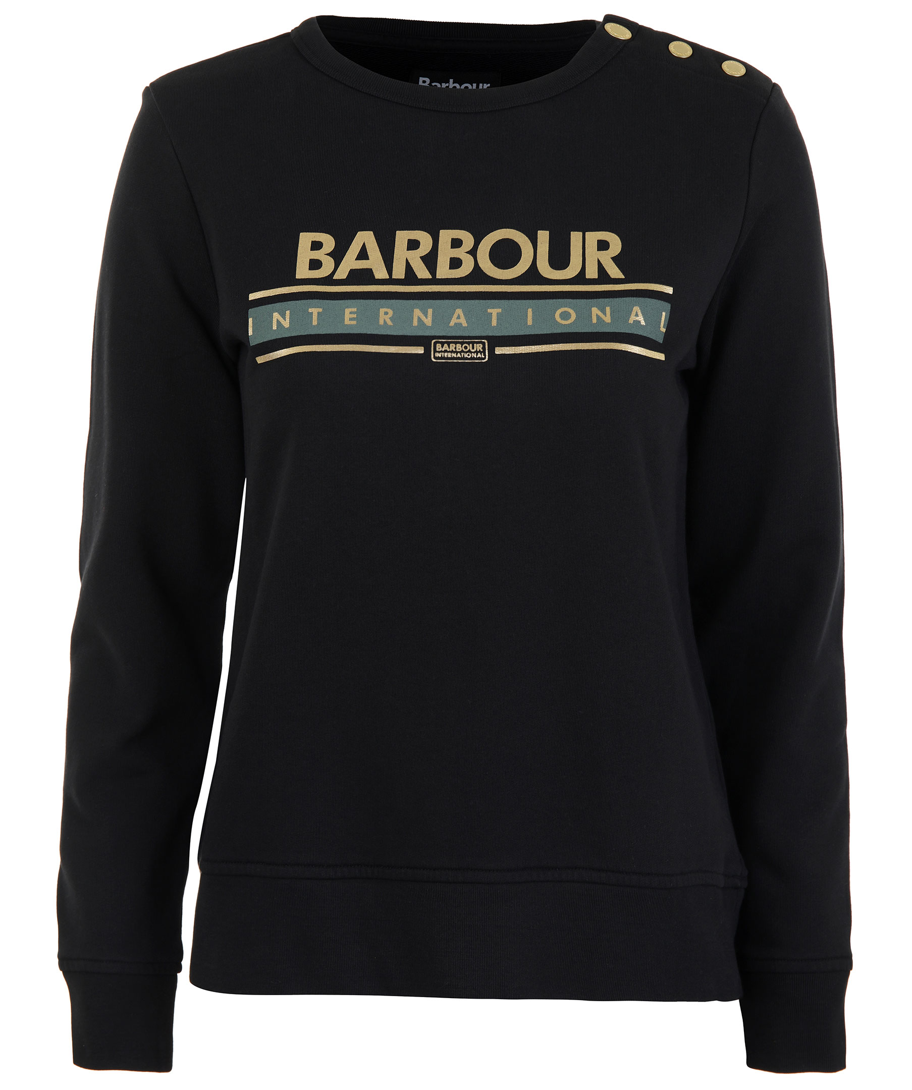 Svart sweatshirt från Barbour International. Tillverkad i 100% bomull. Muddar i ärmslut, plaggslut och tryckt, guldfärgad logotyp på bröstet. Tre guldfärgade tryckknappar på vänster axel.