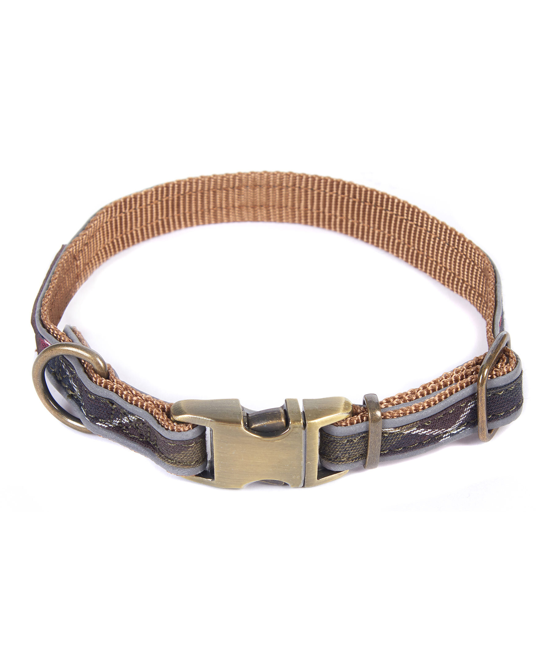 Hundhalsband från Barbour. Klassiskt, grönt mönster med reflex på kanterna. Den är helt justerbar och fästs med ett märkeslås. Tillverkad i polypropen och bomull. Liten, brun patch i läder med logotyp på utsidan.