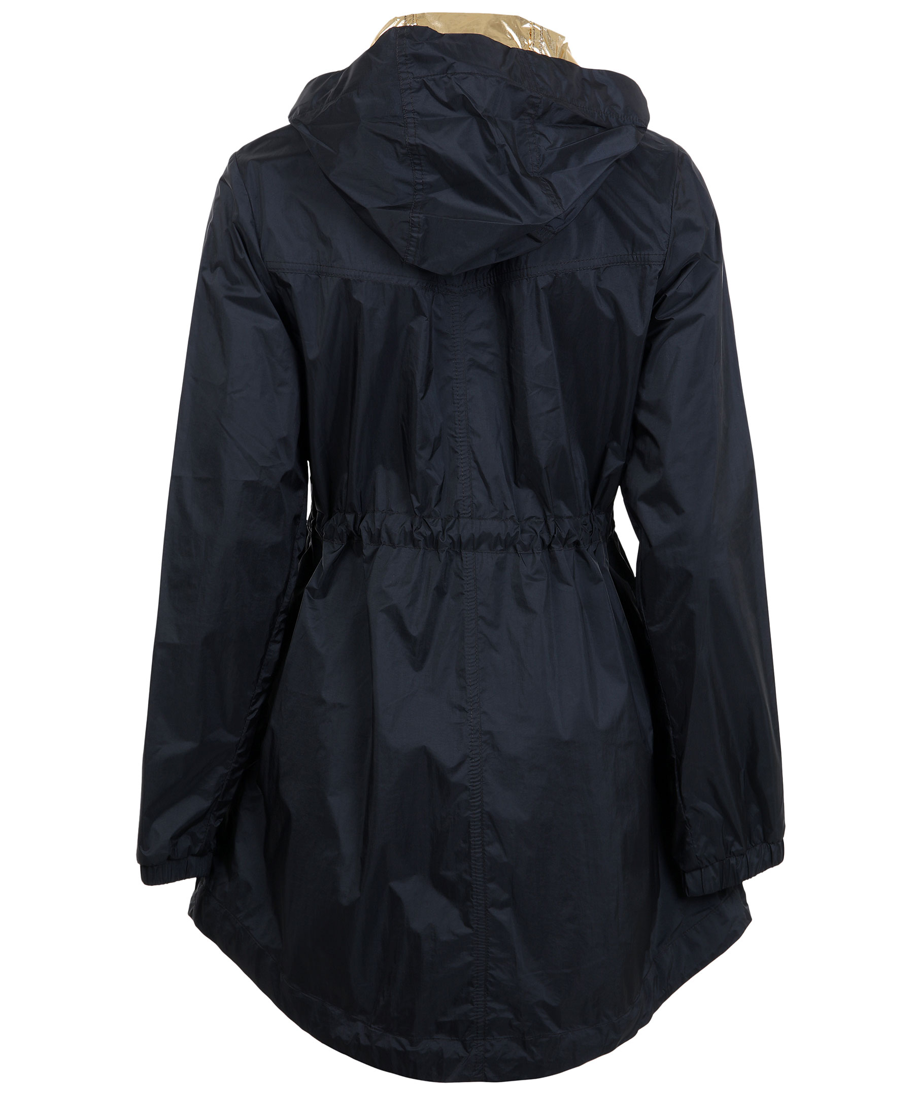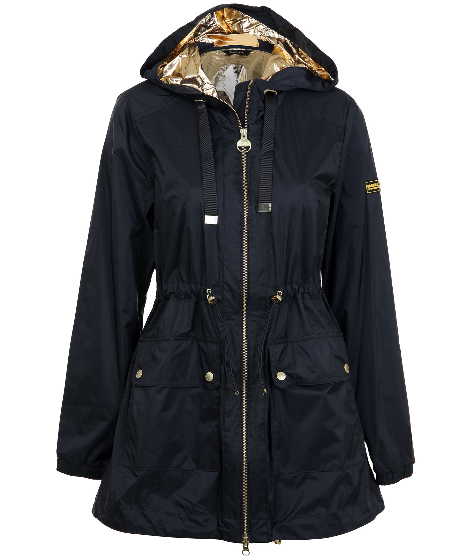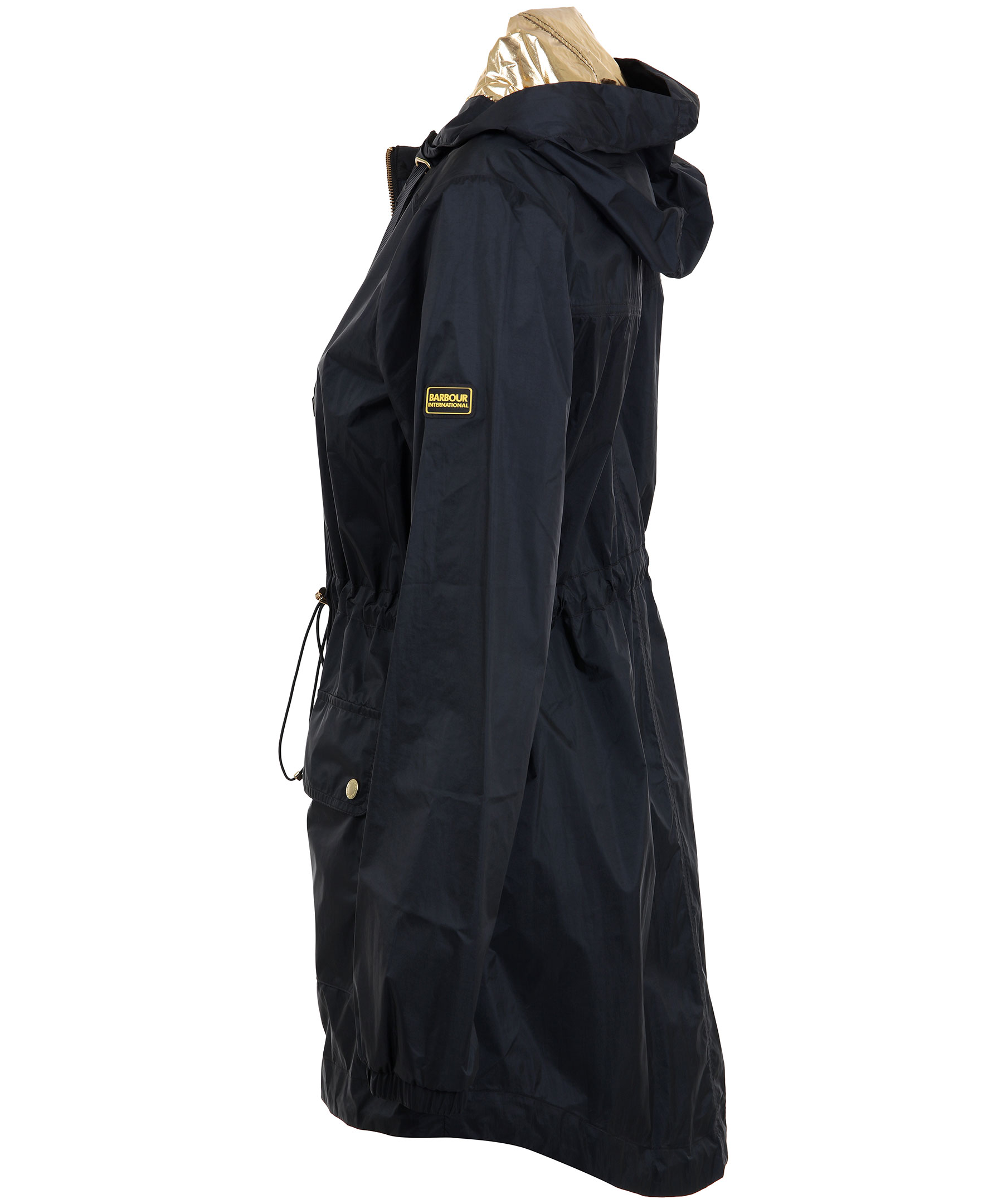Tunn jacka i längre modell från Barbour International. Guldfärgat, glansigt tyg på insidan av jackan. Breda snören i luvan och stängs med dragkedja. Dragsko i midjan, två stora fickor med guldfärgade tryckknappar fram. Applicerad logotyp på vänster ärm.