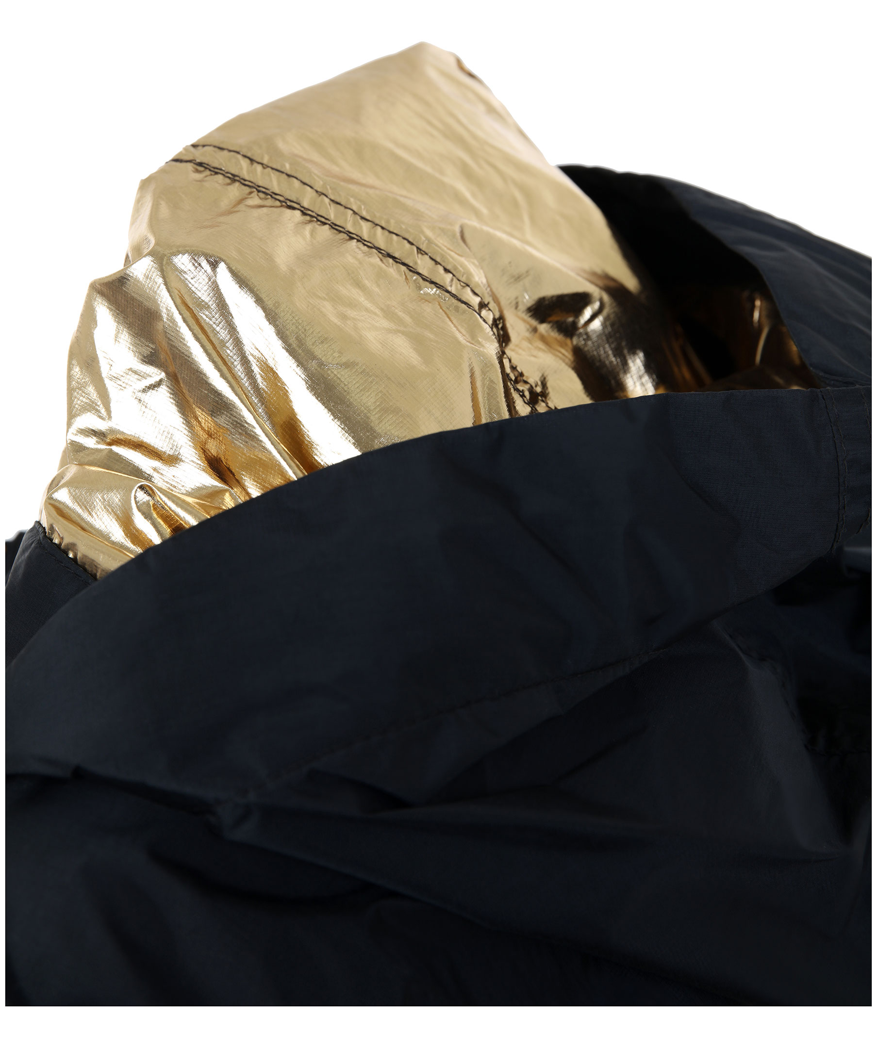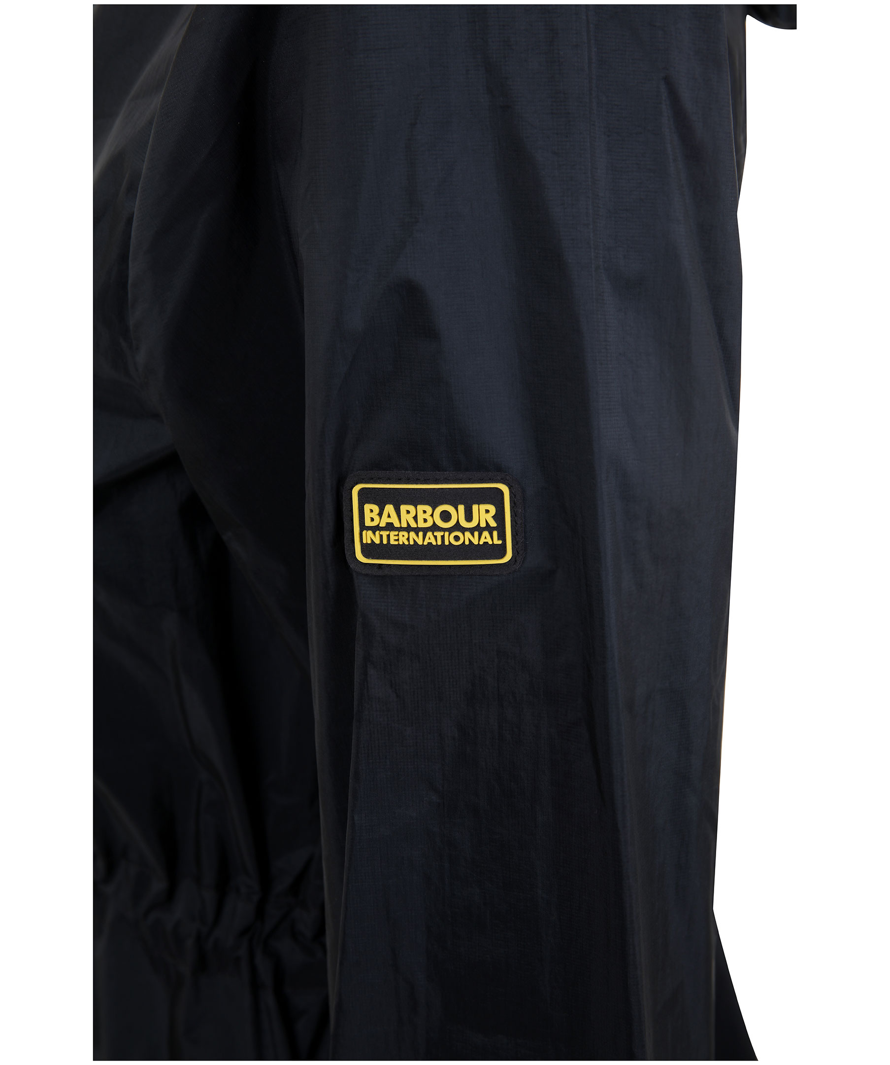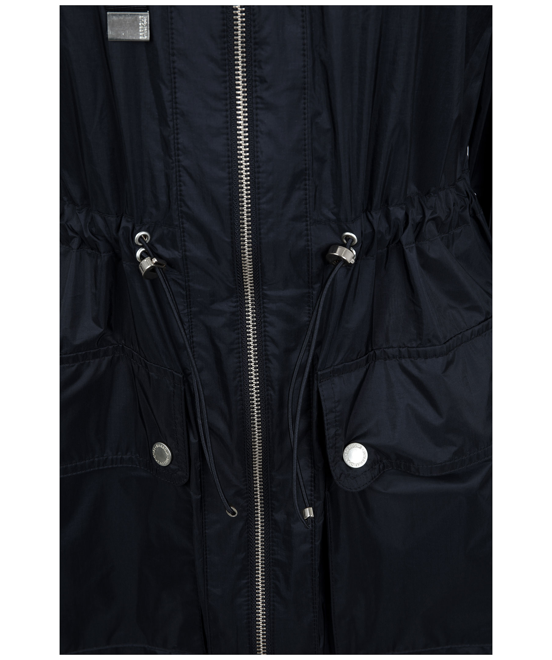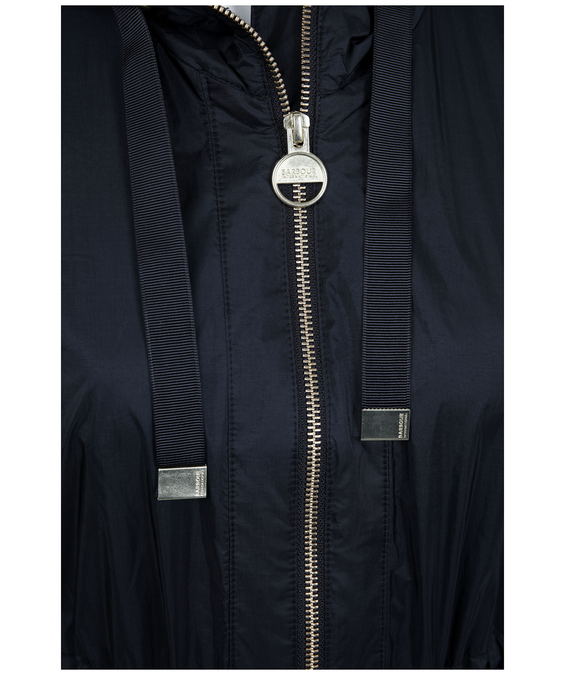 Tunn jacka i längre modell från Barbour International. Guldfärgat, glansigt tyg på insidan av jackan. Breda snören i luvan och stängs med dragkedja. Dragsko i midjan, två stora fickor med guldfärgade tryckknappar fram. Applicerad logotyp på vänster ärm.