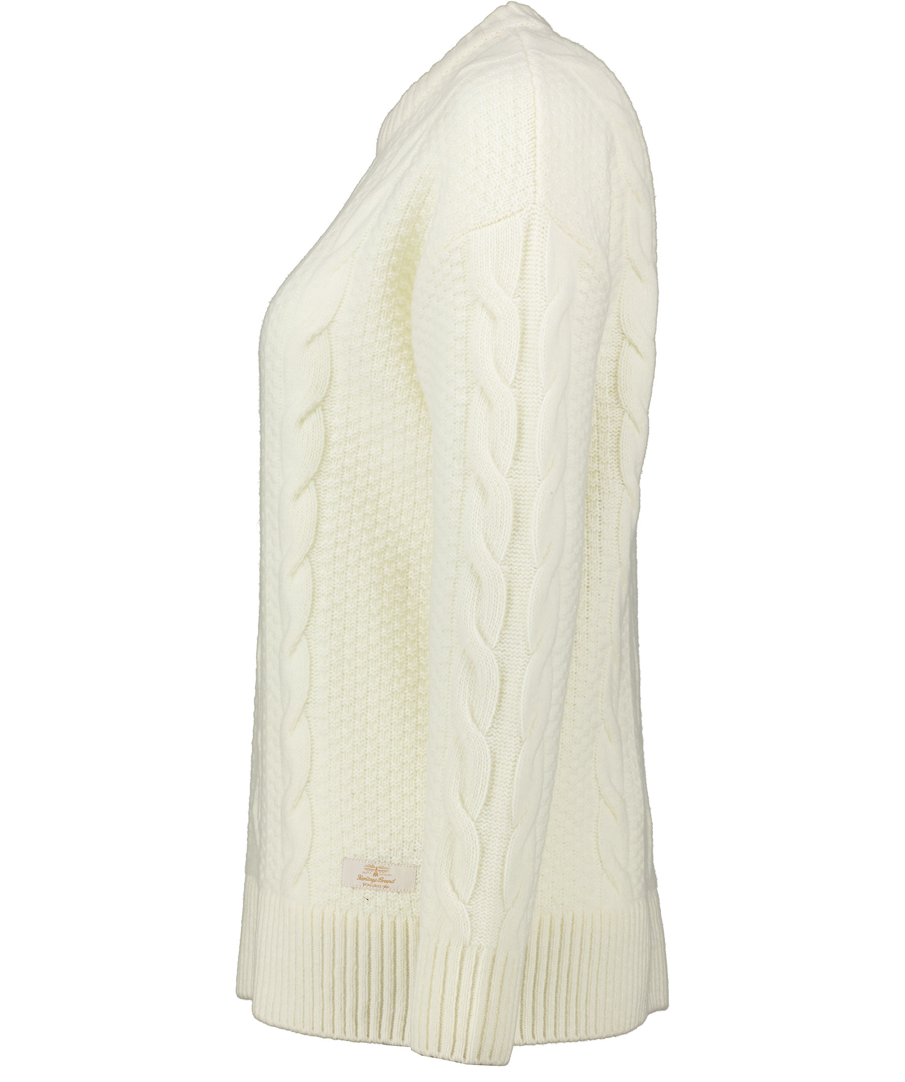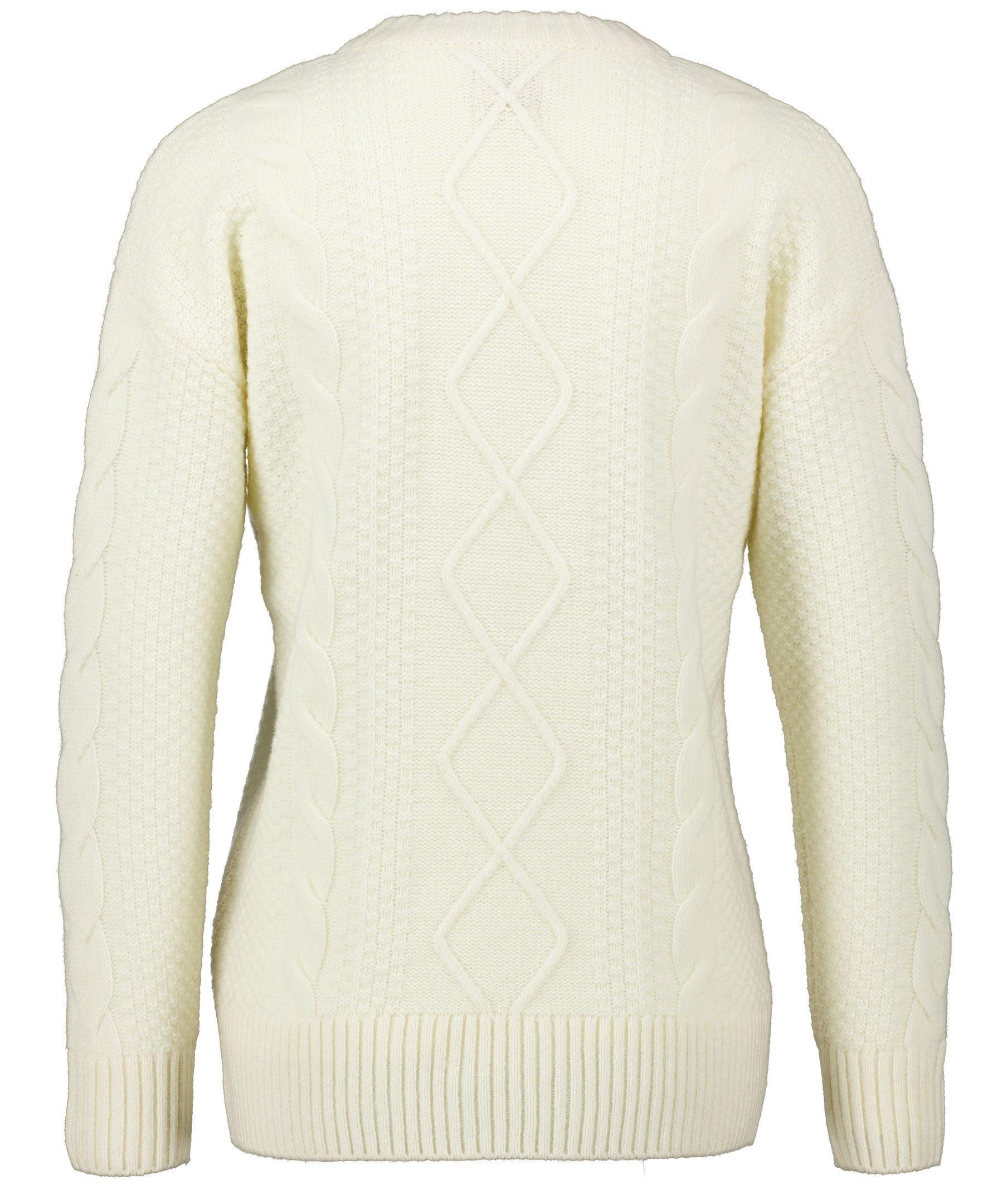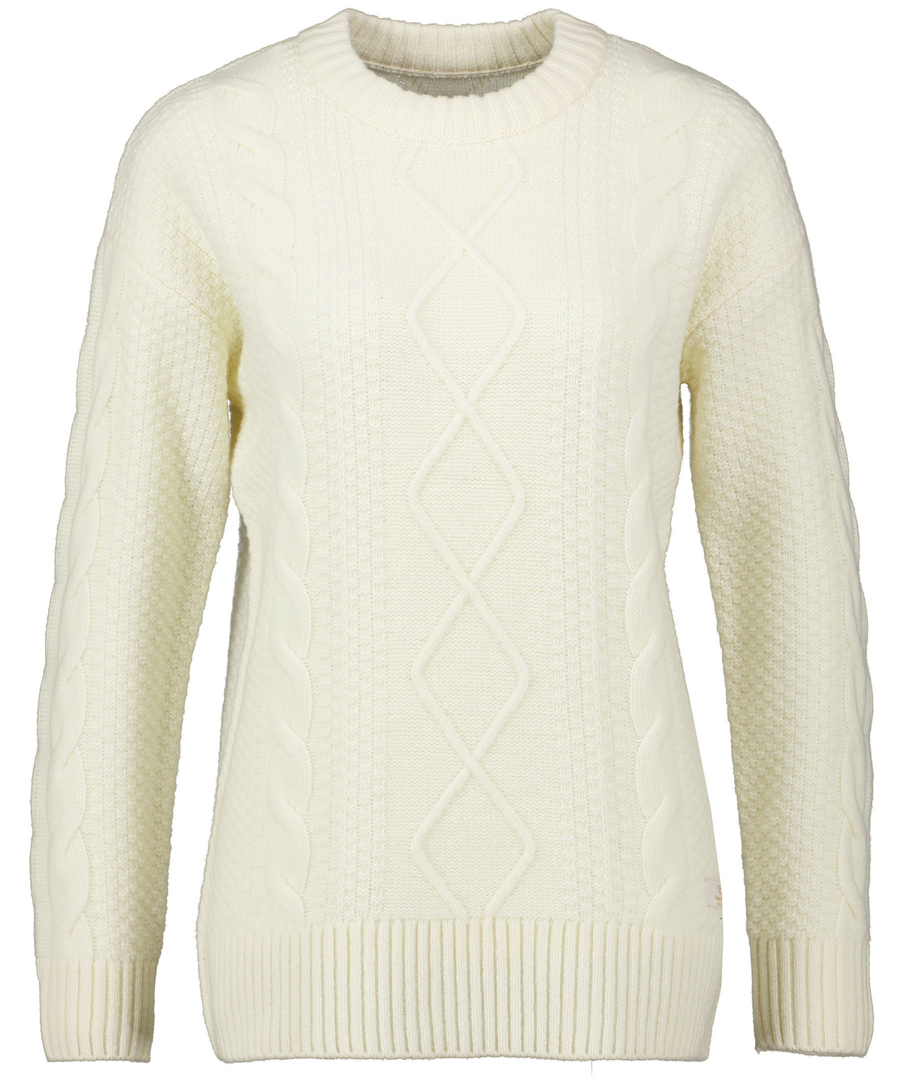 Krämvit kabelstickad ulltröja från Barbor. Ribbad, hög halsringning samt ribbat ärmslut och plaggslut. Rak och lång modell. Liten, vit patch med logotyp på vänster höft.