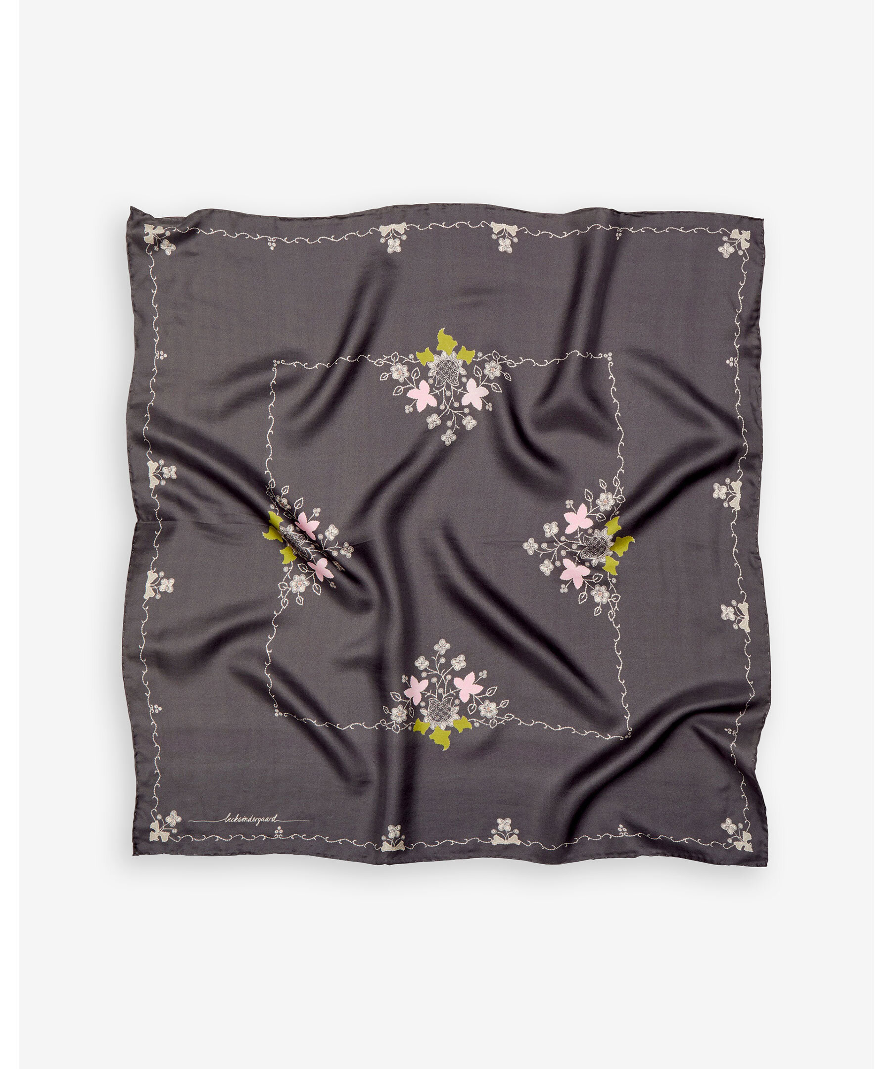 Mönstrad silkes scarf från Becksöndergaard. Gjord i 100% silke och har måtten 65x65 cm.