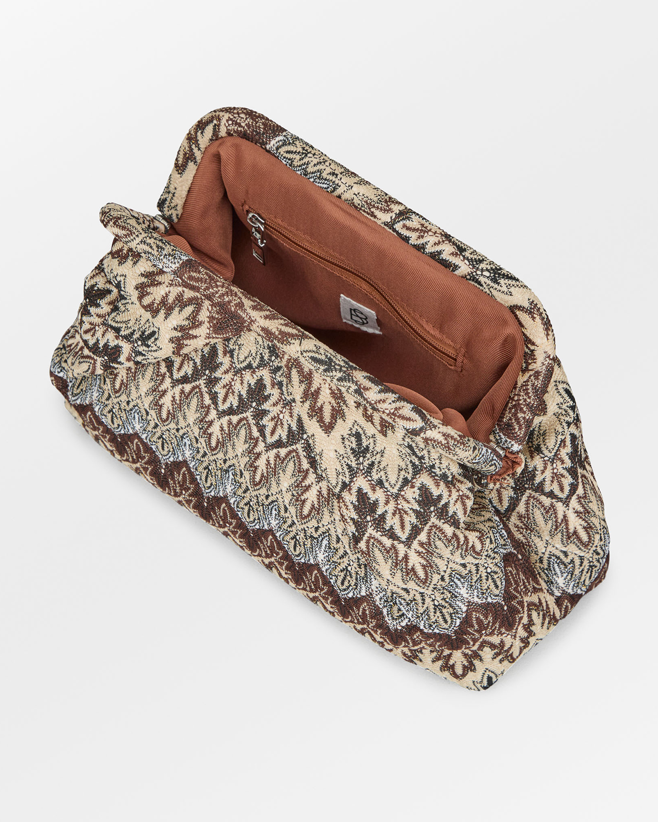 Mönstrad väska från Becksöndergaard Aps. Väskan har en öppning till ett större fack samt en mindre ficka inuti med dragkedja. Tillverkad i polyester. Mått: 26x18 cm.