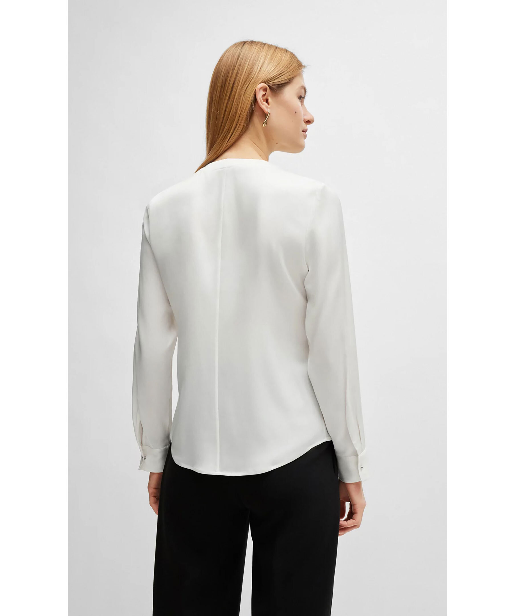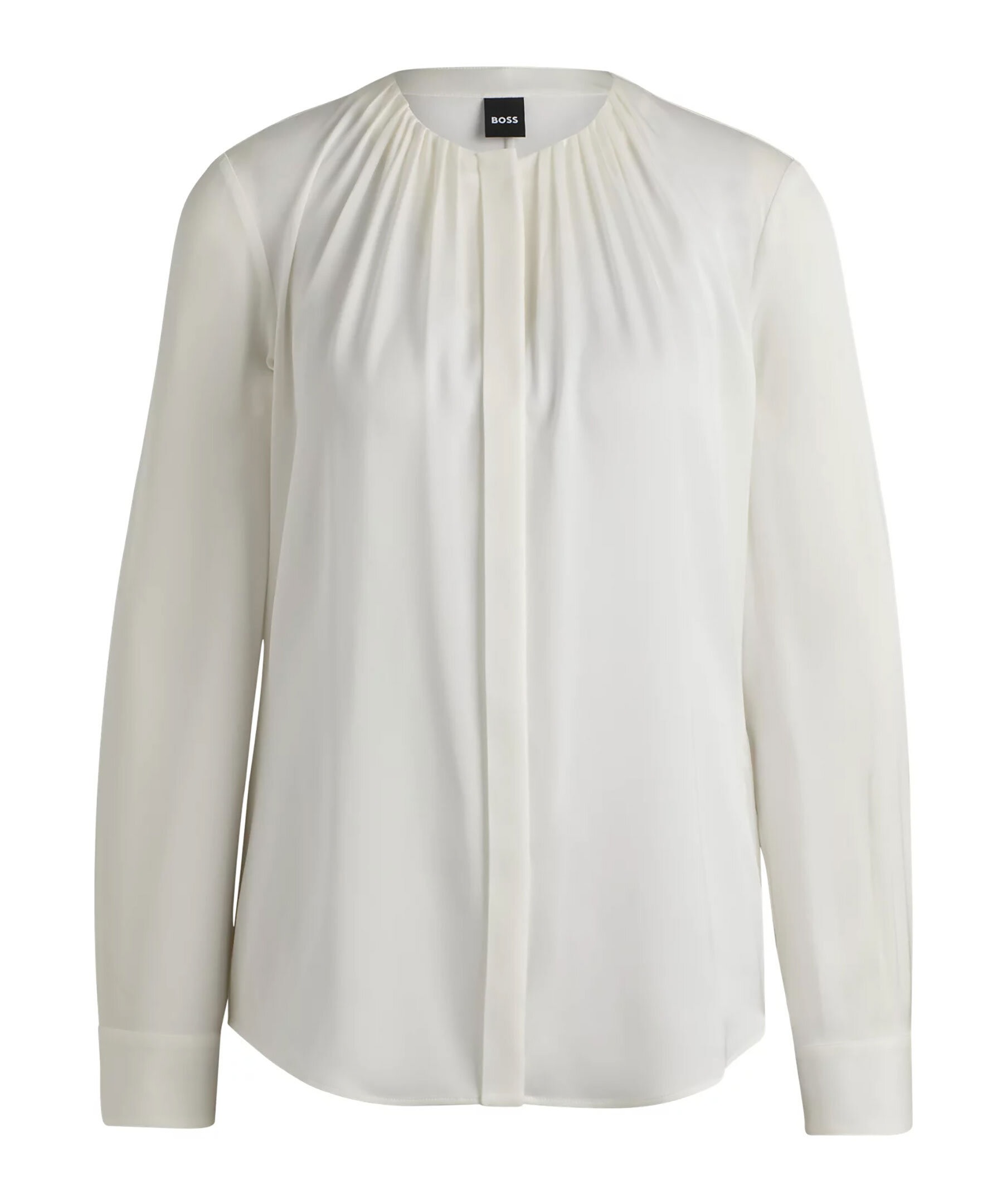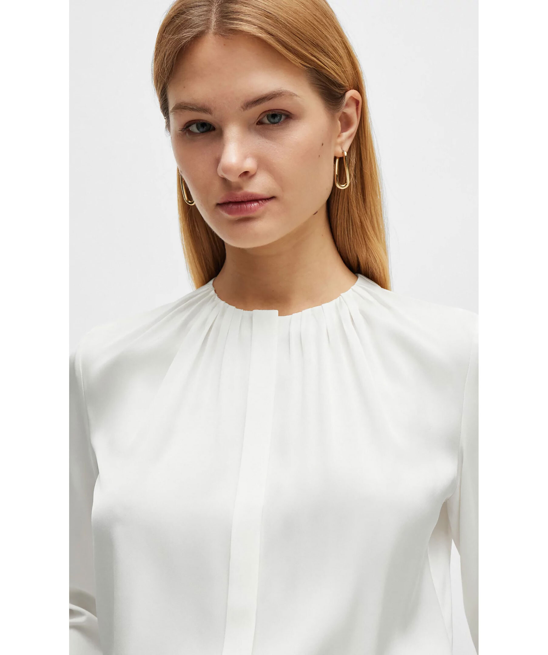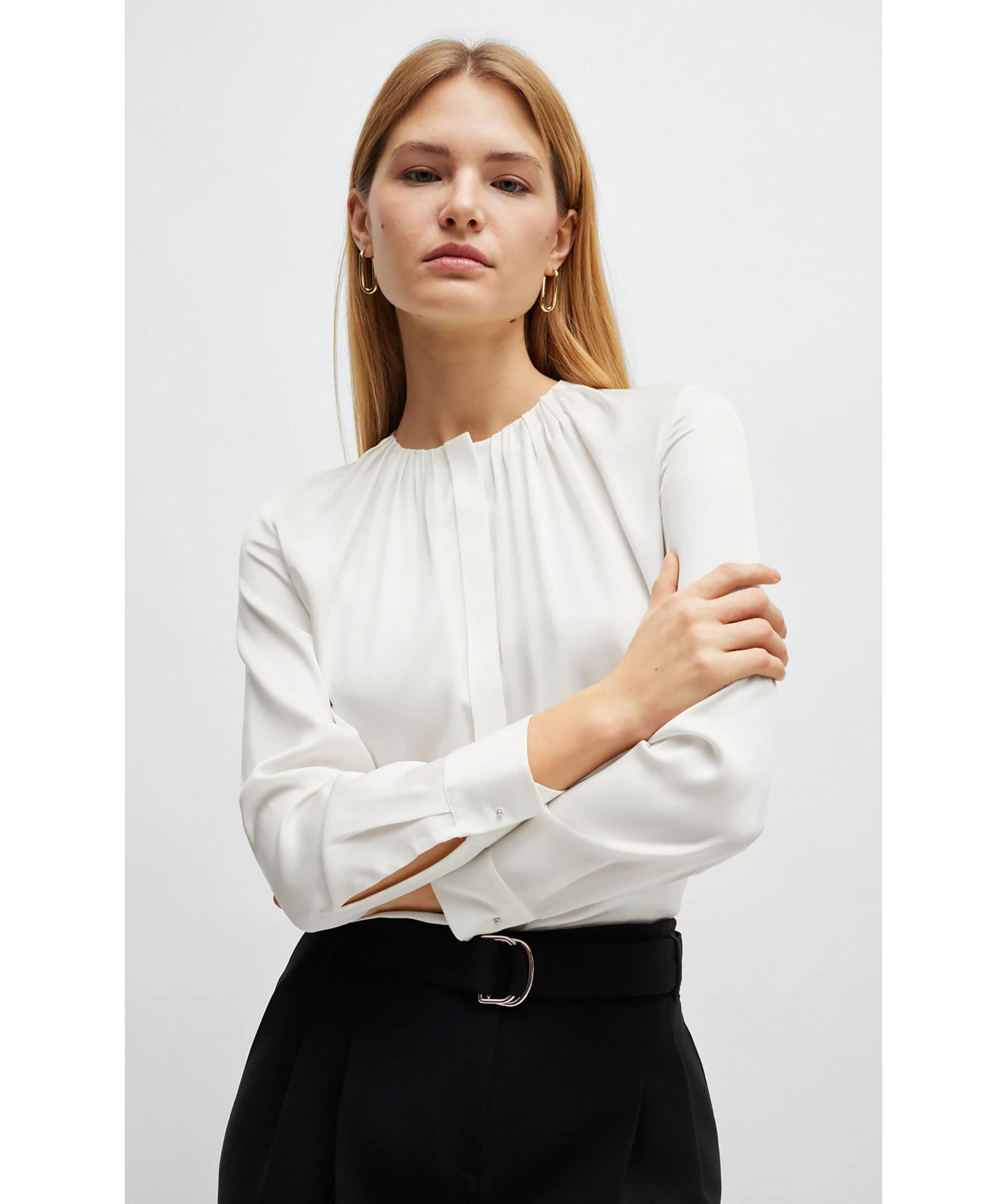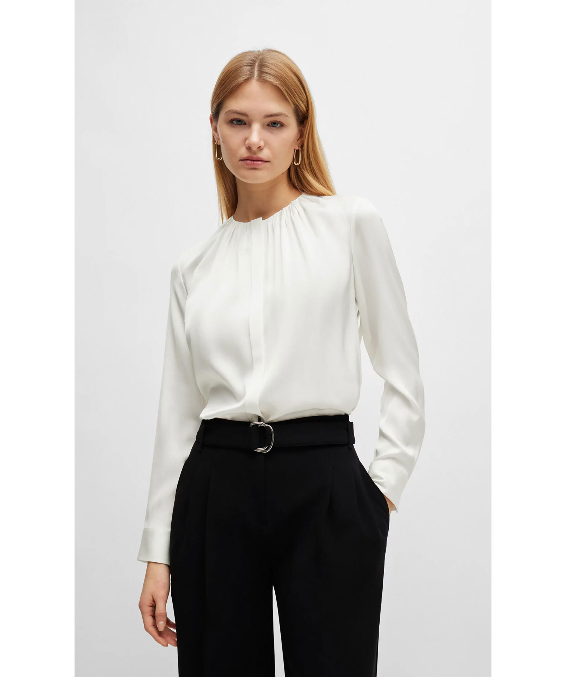 Vit blus i lyxig crepe de Chine från BOSS Black. Rynkad halsringning, dold stängning och en logga baktill. Blusen är designad i slim fit utan krage och har extra långa ärmar med knappmanschetter.