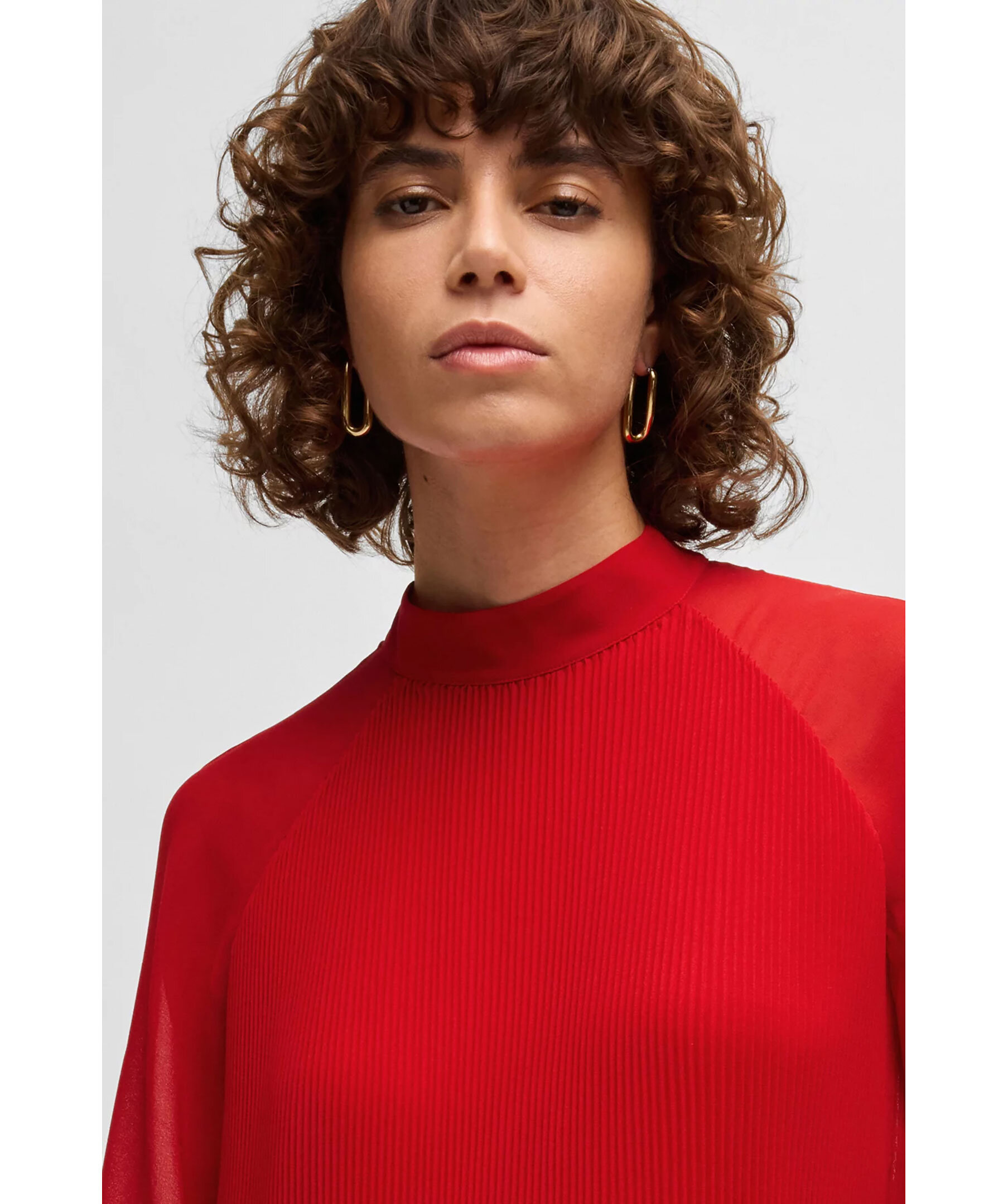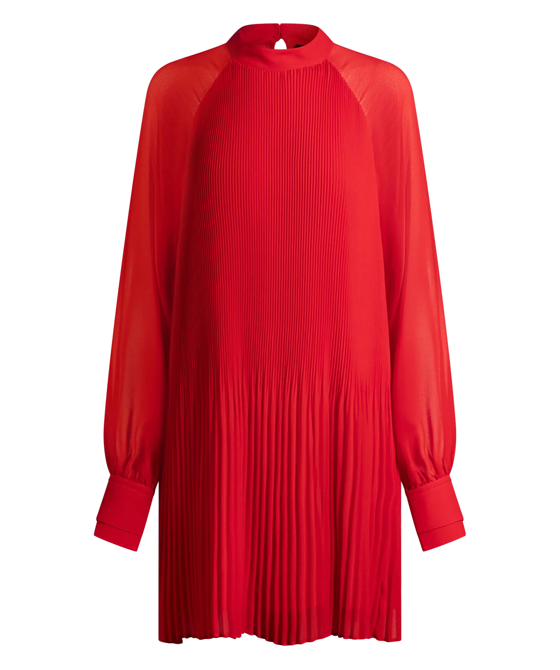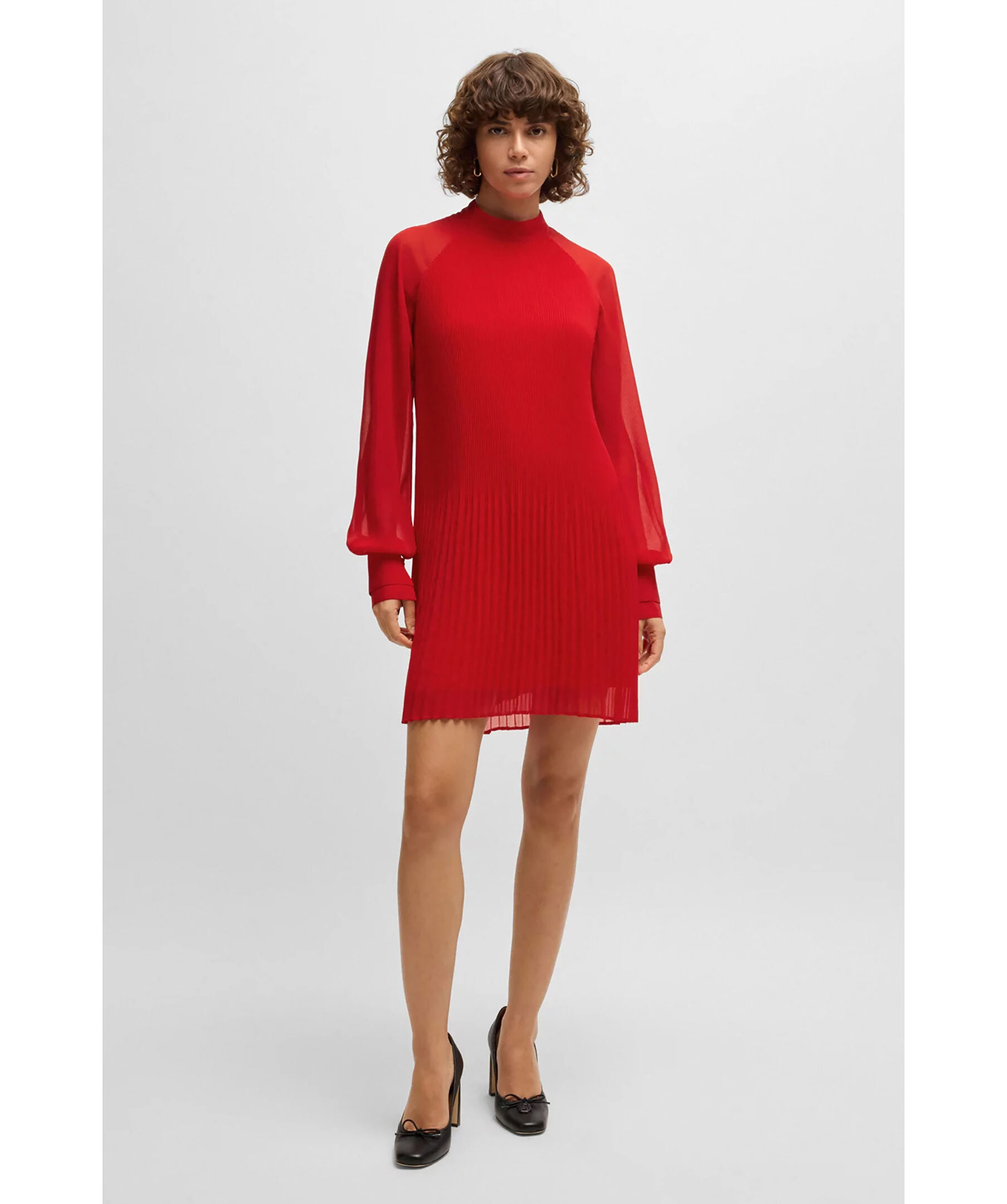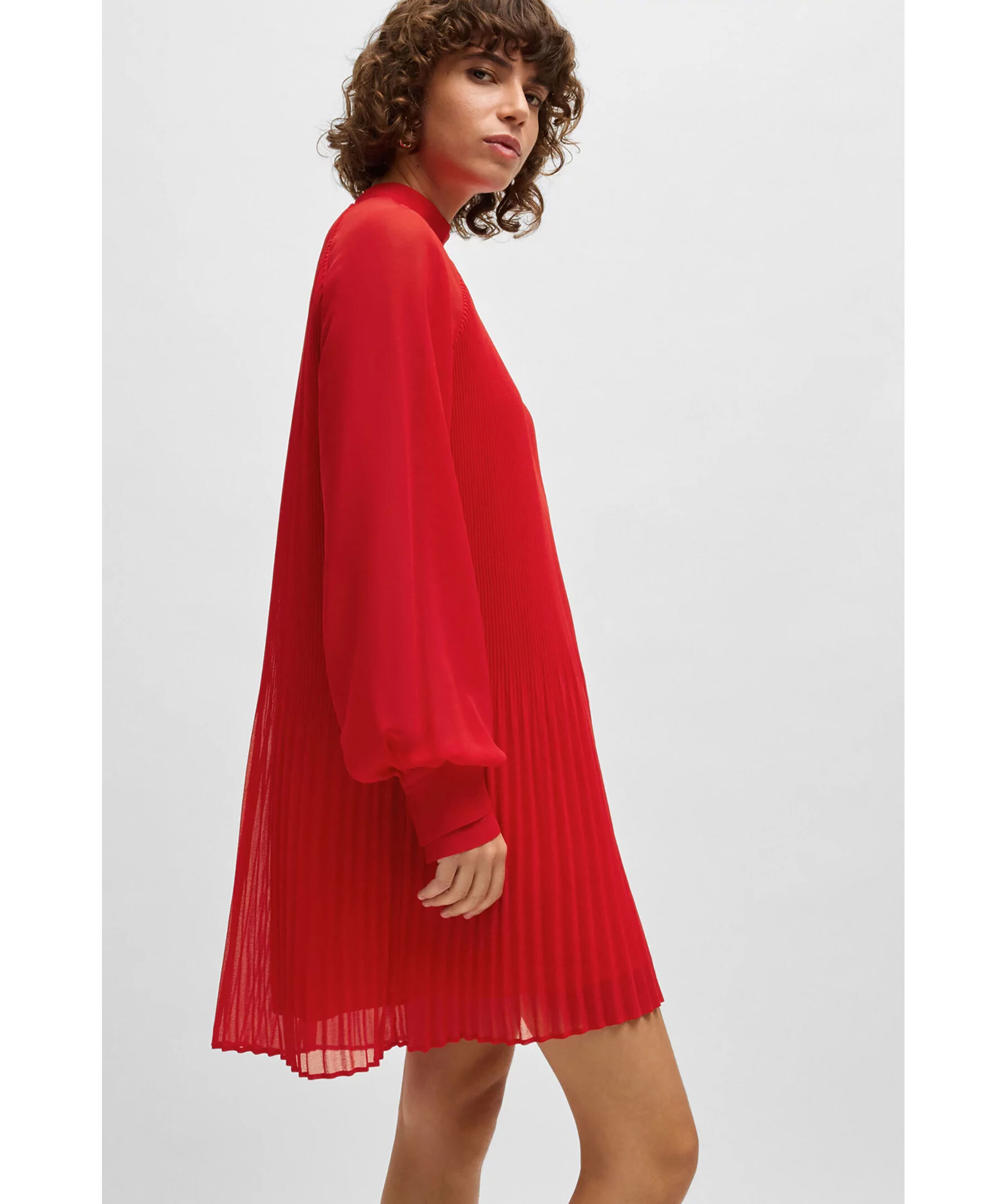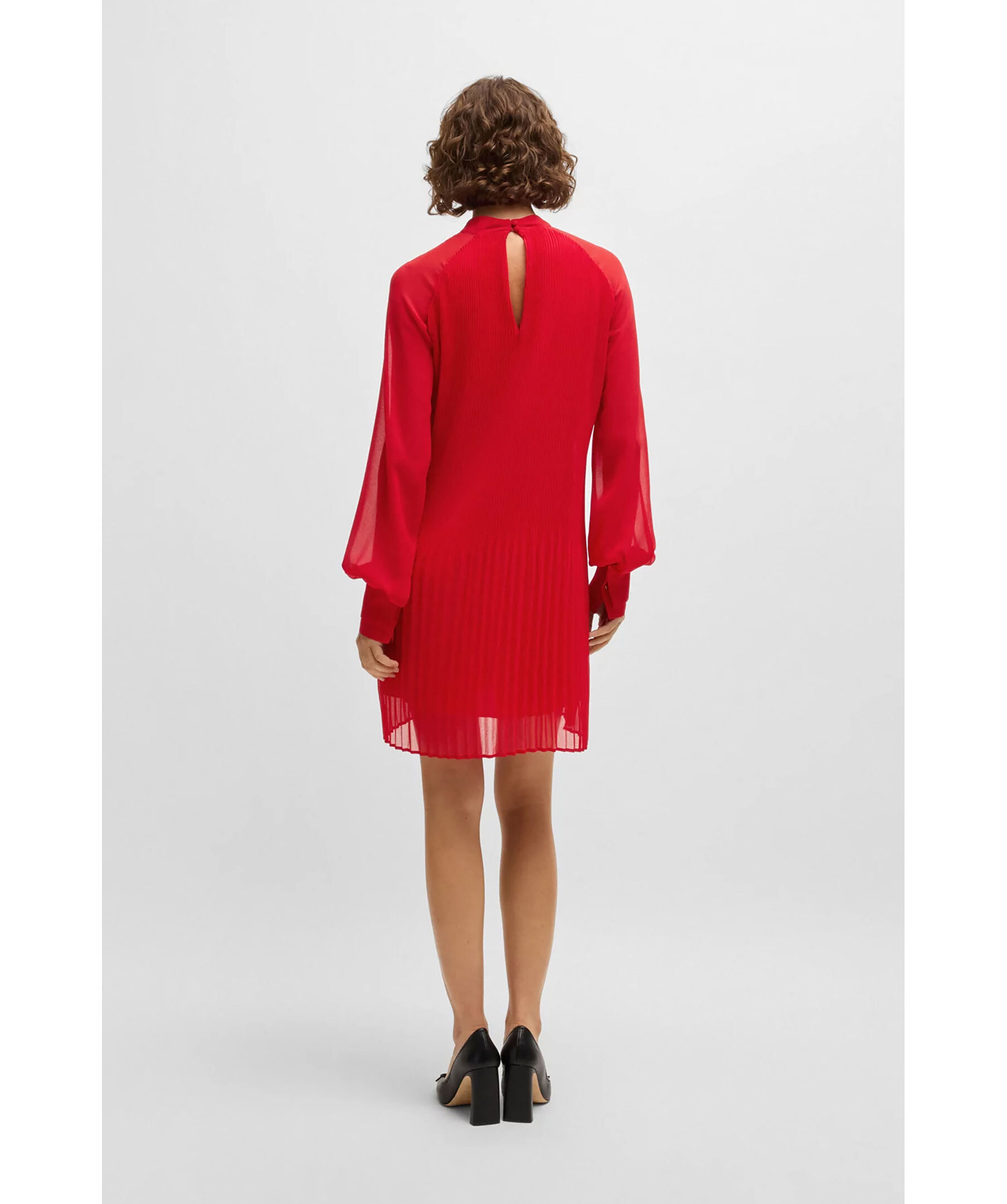 Röd klänning från BOSS Black. Klänningen är plisserad, har långa genomskinliga ärmar, stående krage. Nyckelhåls låsning baktill där den stängs med knapp. Tillverkad av polyester.