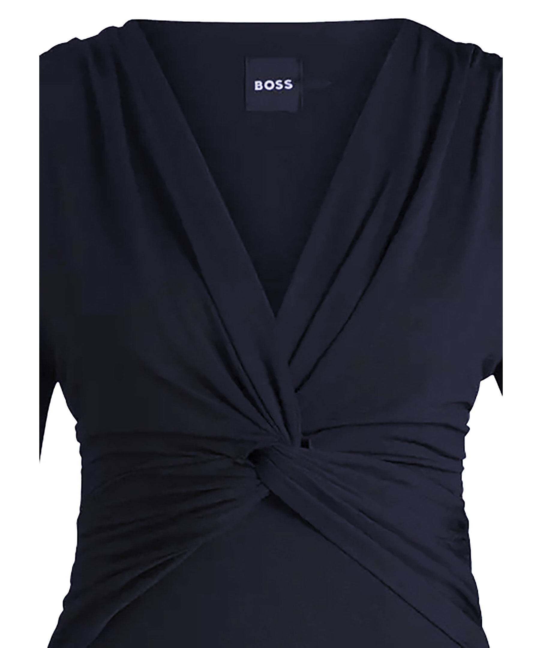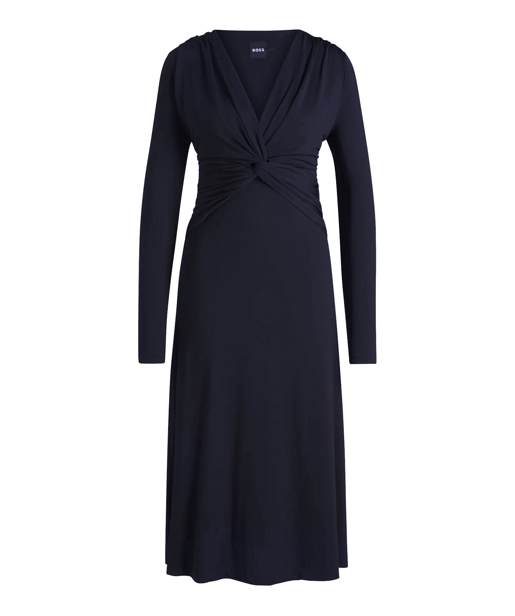 Mörkblå, långklänning med långa ärmar från BOSS Black. Klänningen är v-ringad och har en twist-detalj framtill. Tillverkad i stretchigt crêpetyg.