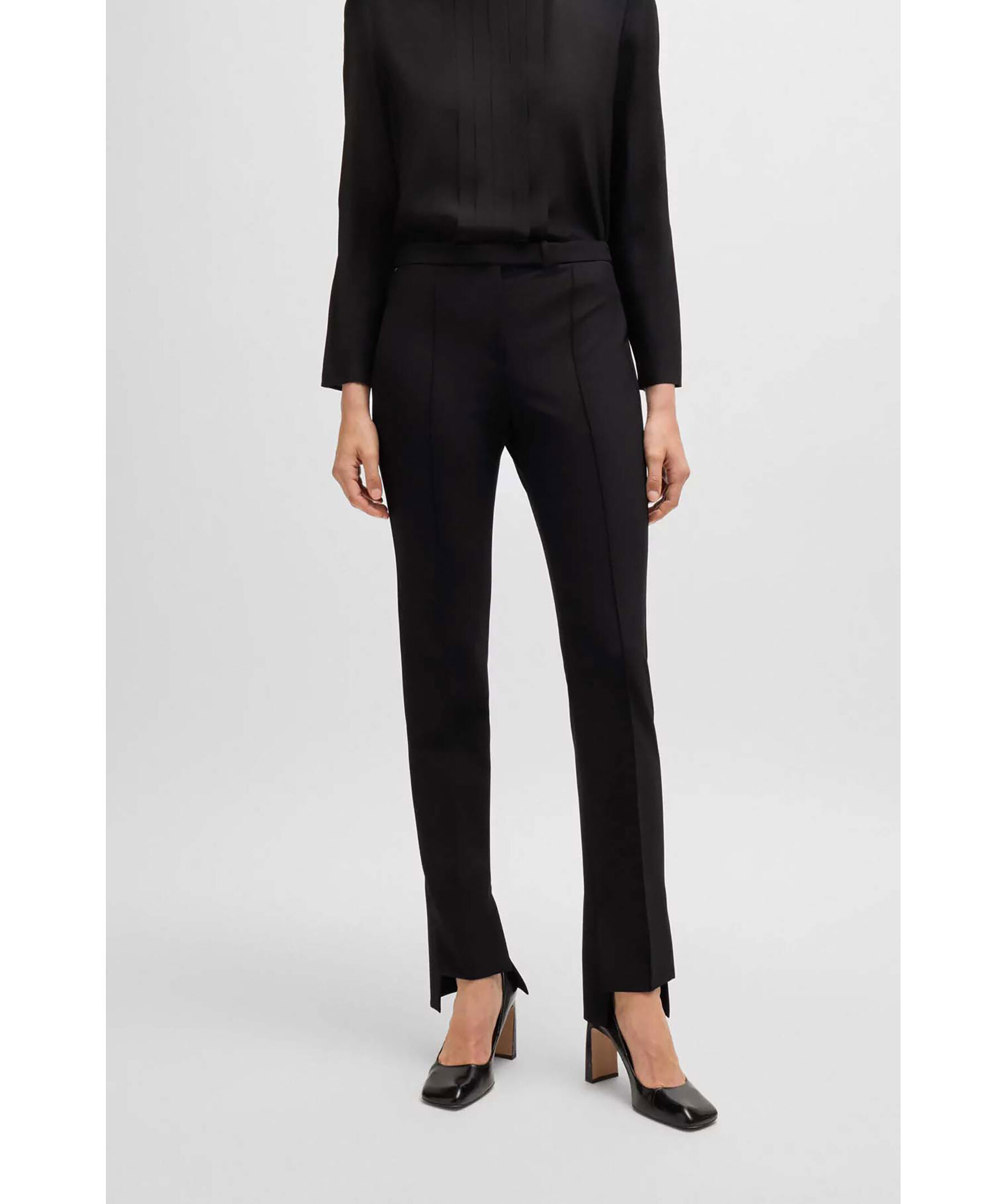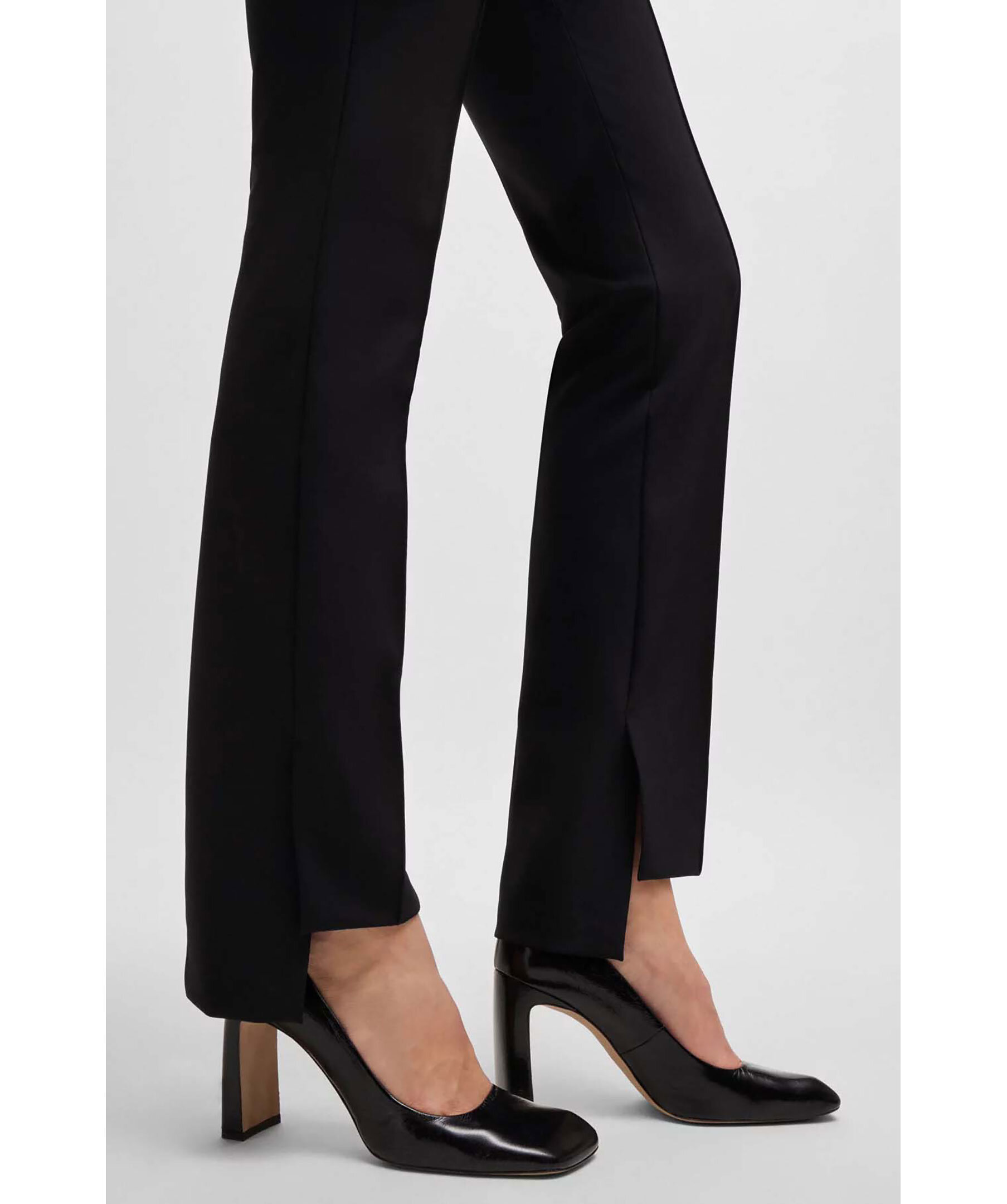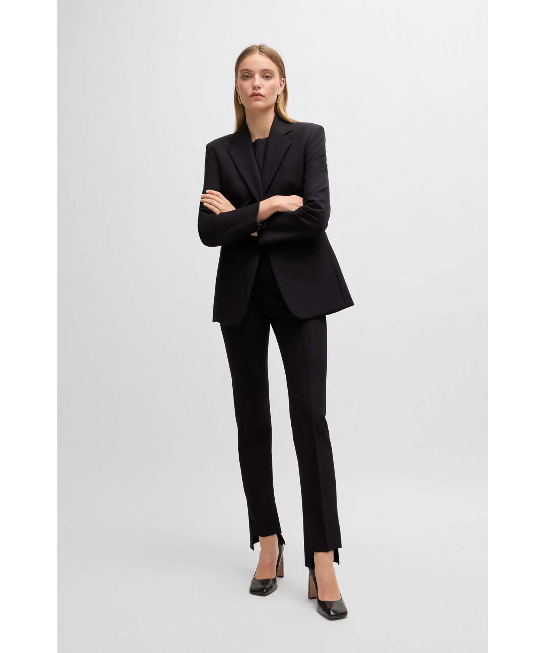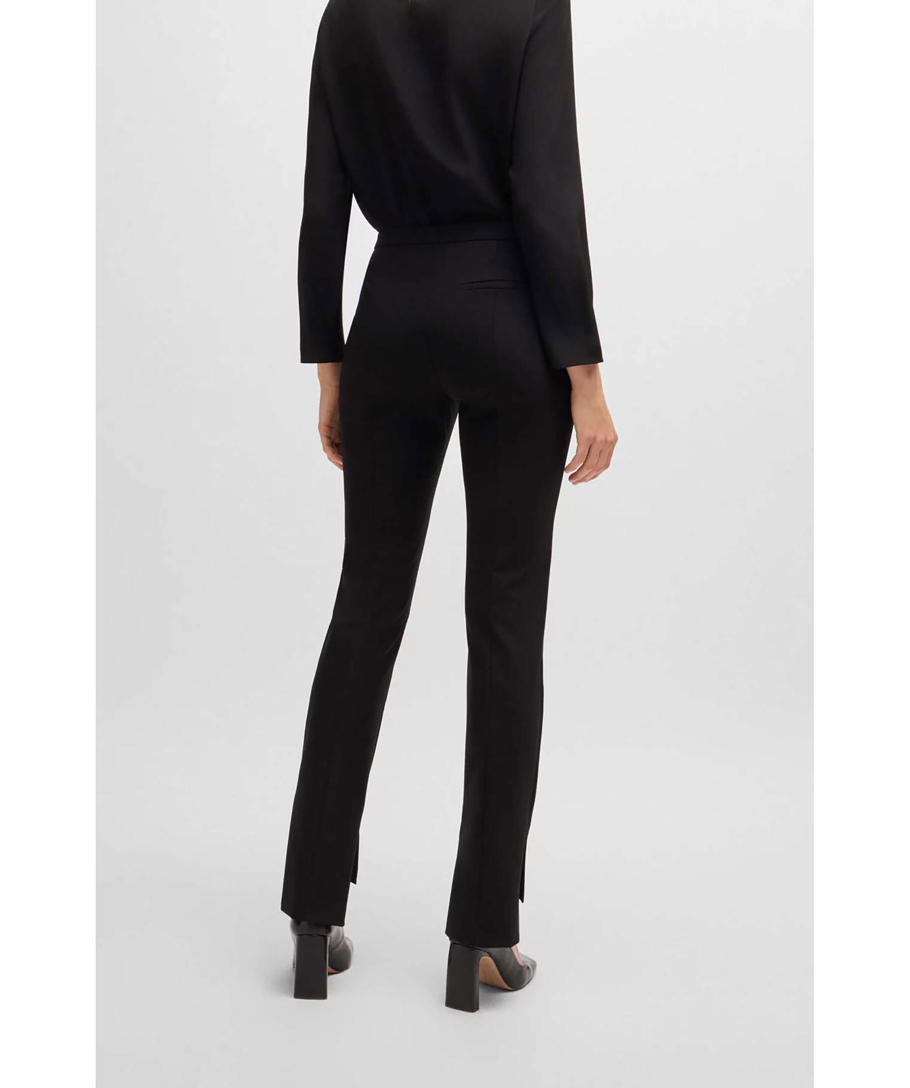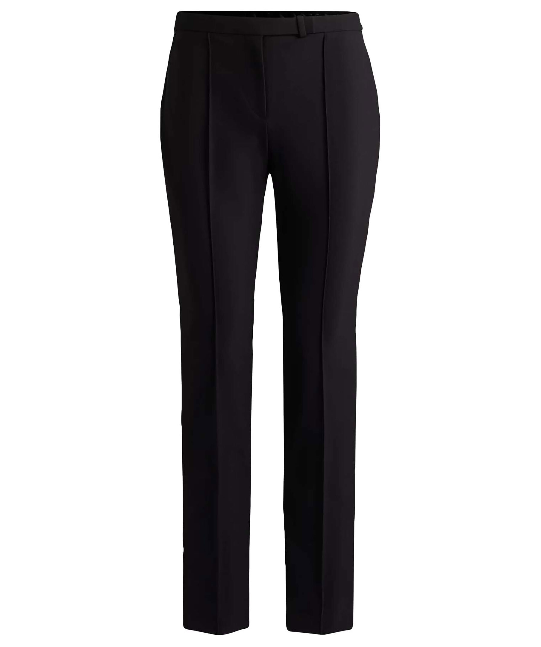 Svarta kostymbyxor från Boss Black. Byxorna är höga i midjan och har pressveck. Smala ben och passpoalfickor baktill. Sprund vid benslut, där byxan är något längre baktill än fram. Stängs med med dragkedja, knapp och hake. Tillverkade av preformance-stretch i polyamid.