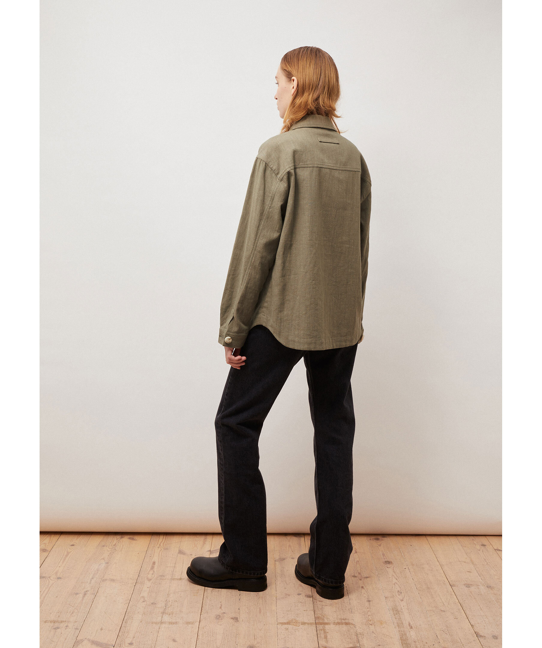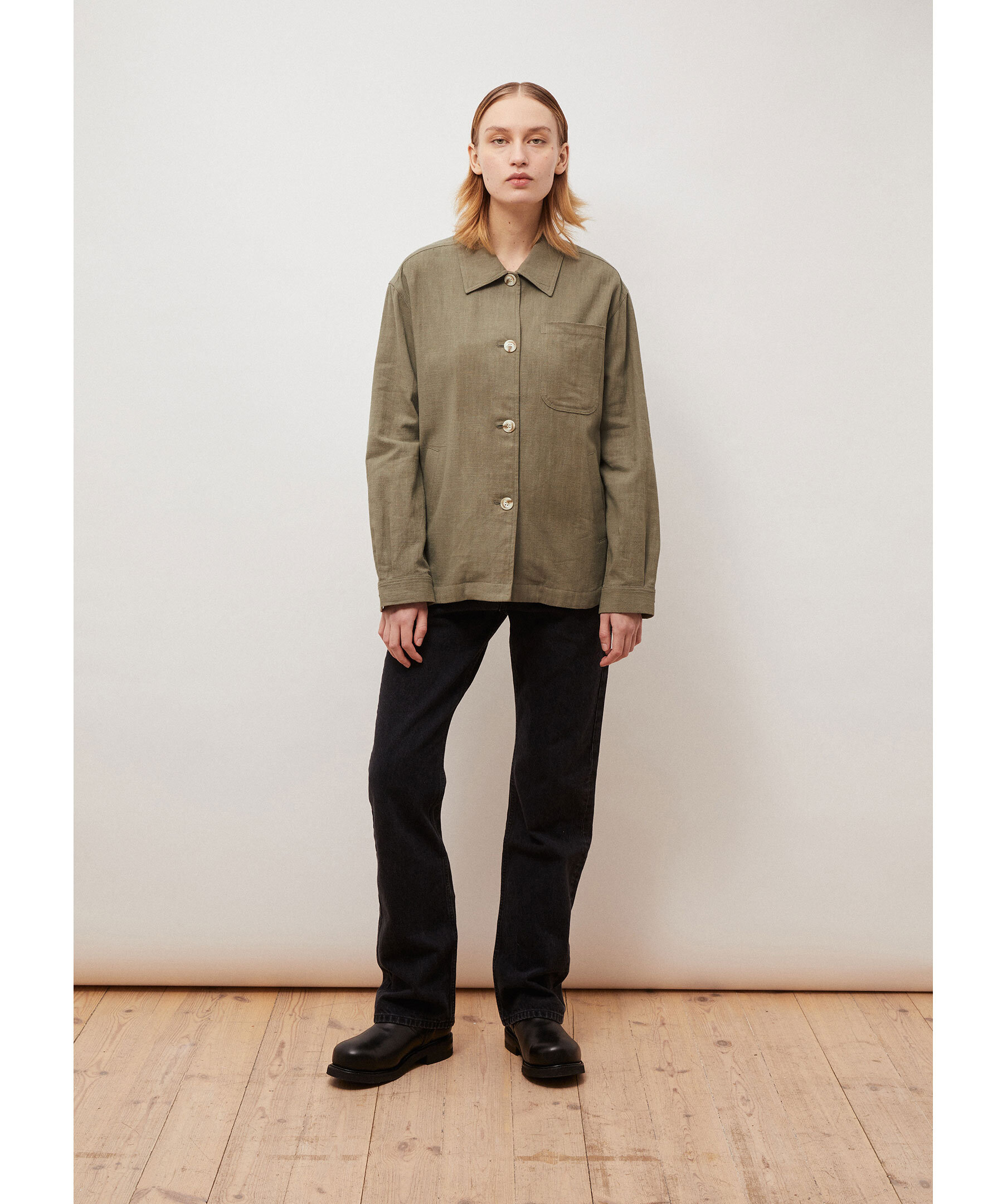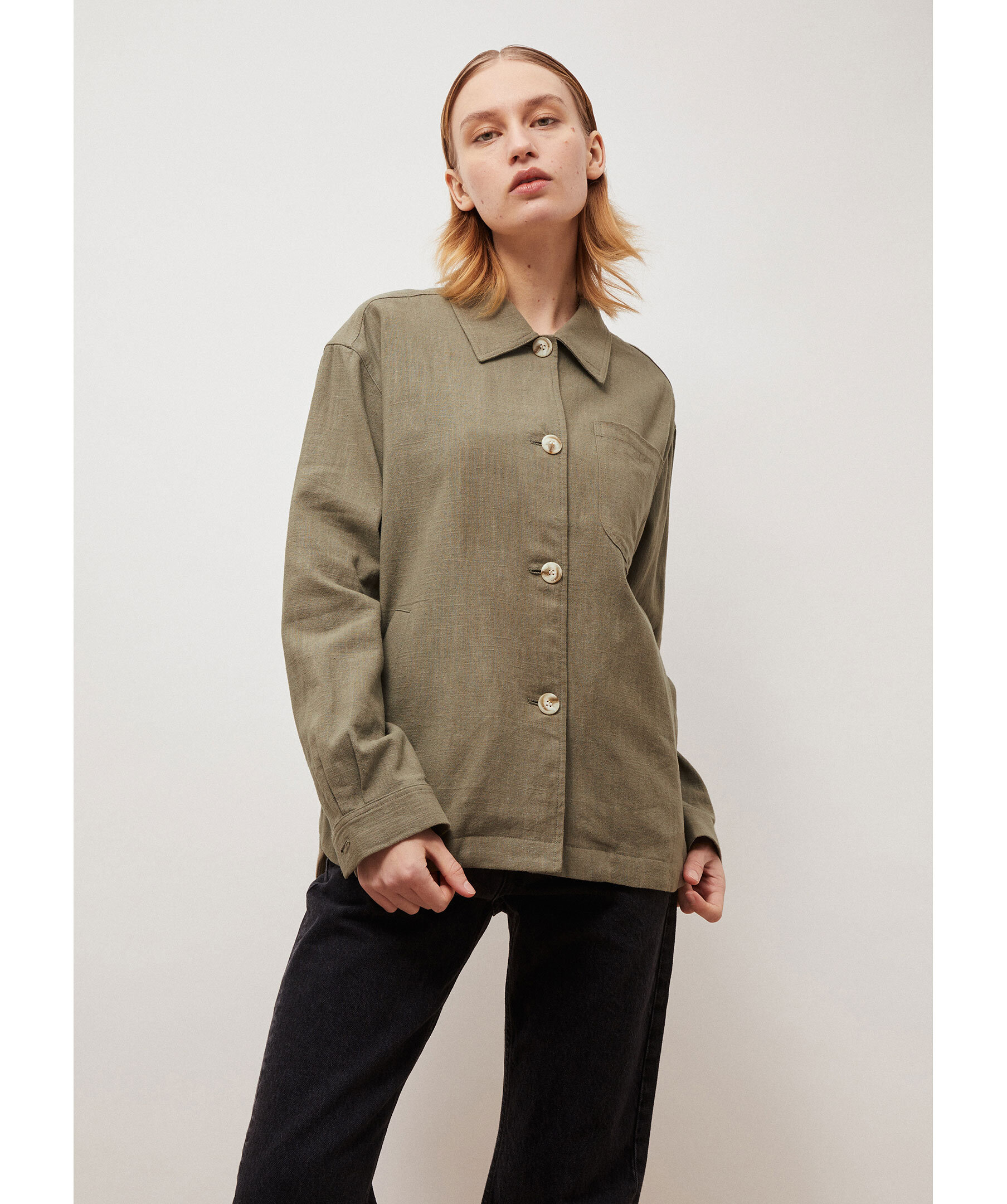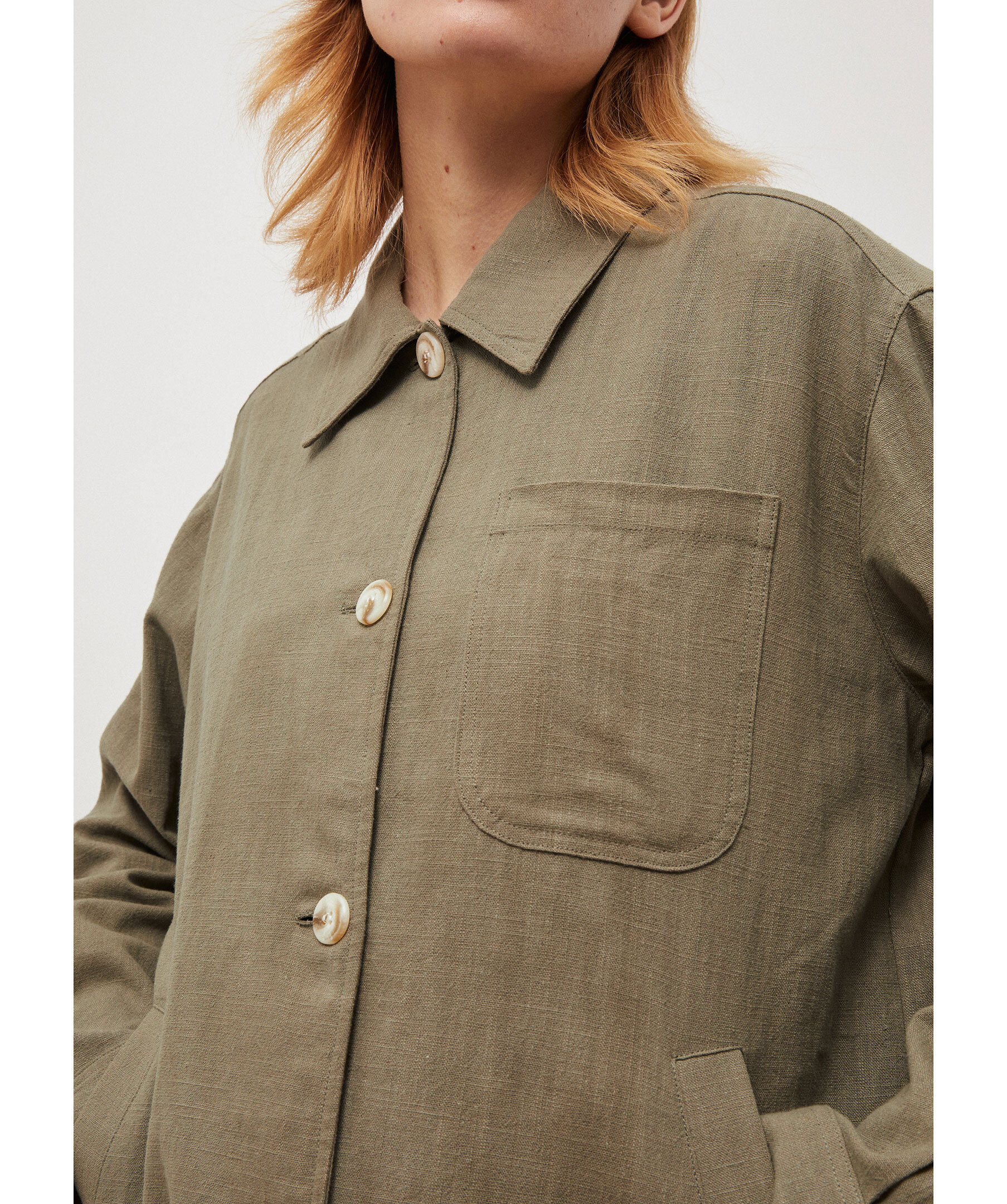 Mossgrön overshirt från Brixtol Textiles. Stängs med knappar framtill och har en påsydd bröstficka samt två welt sidofickor. Tillverkad i en linblandning.