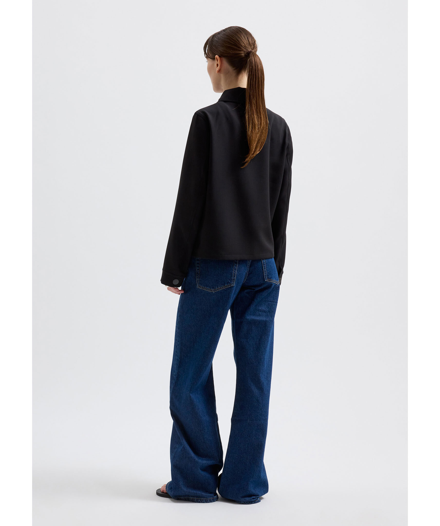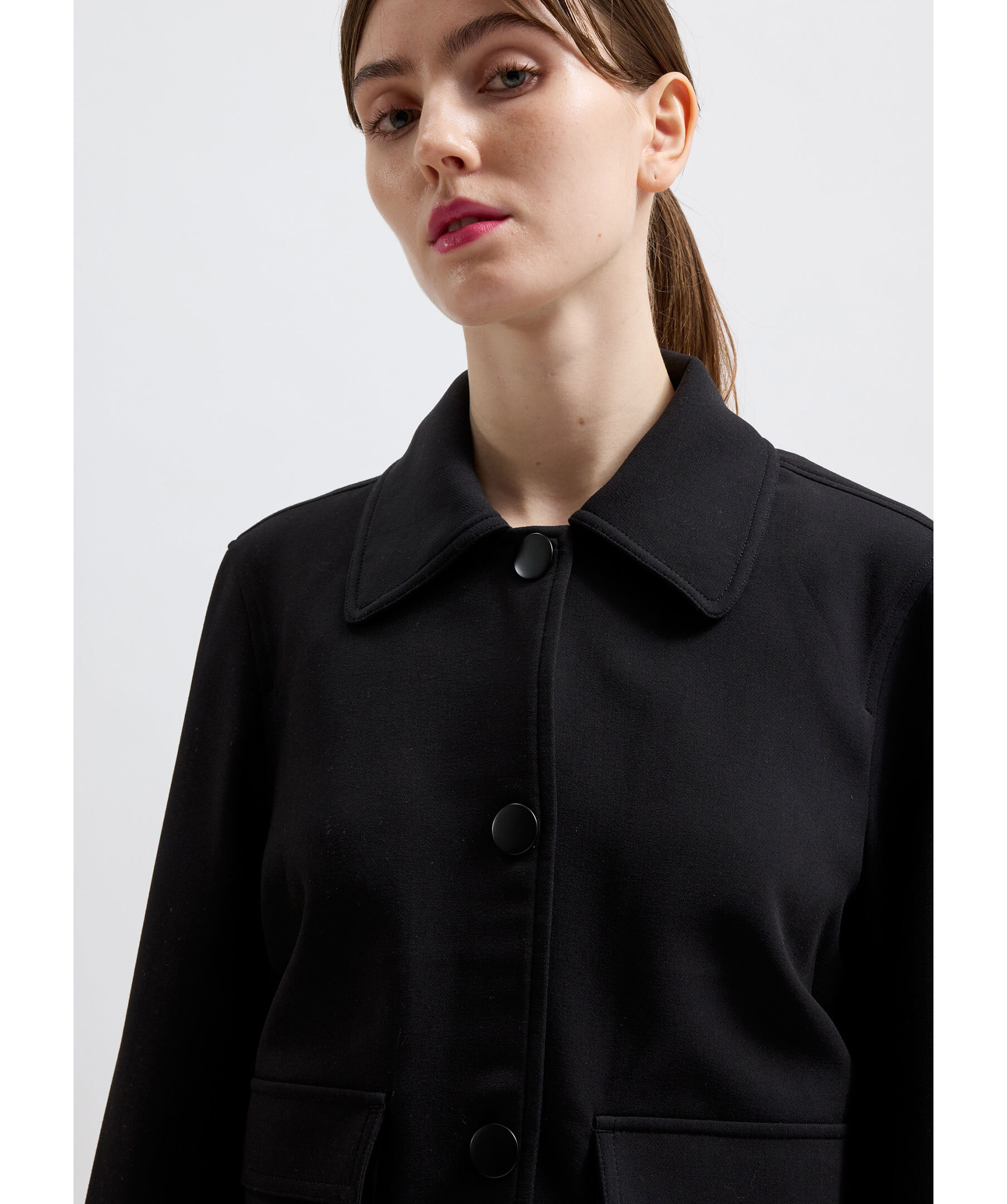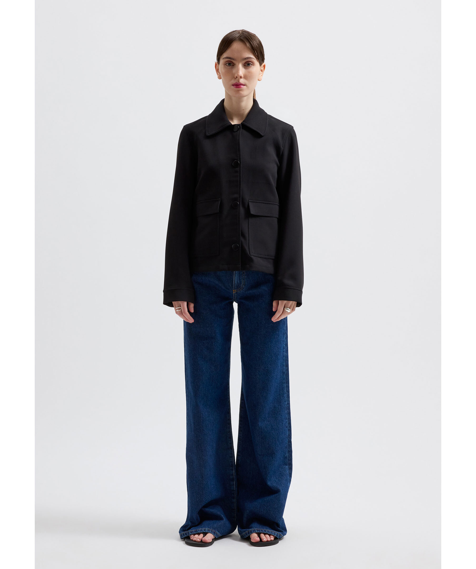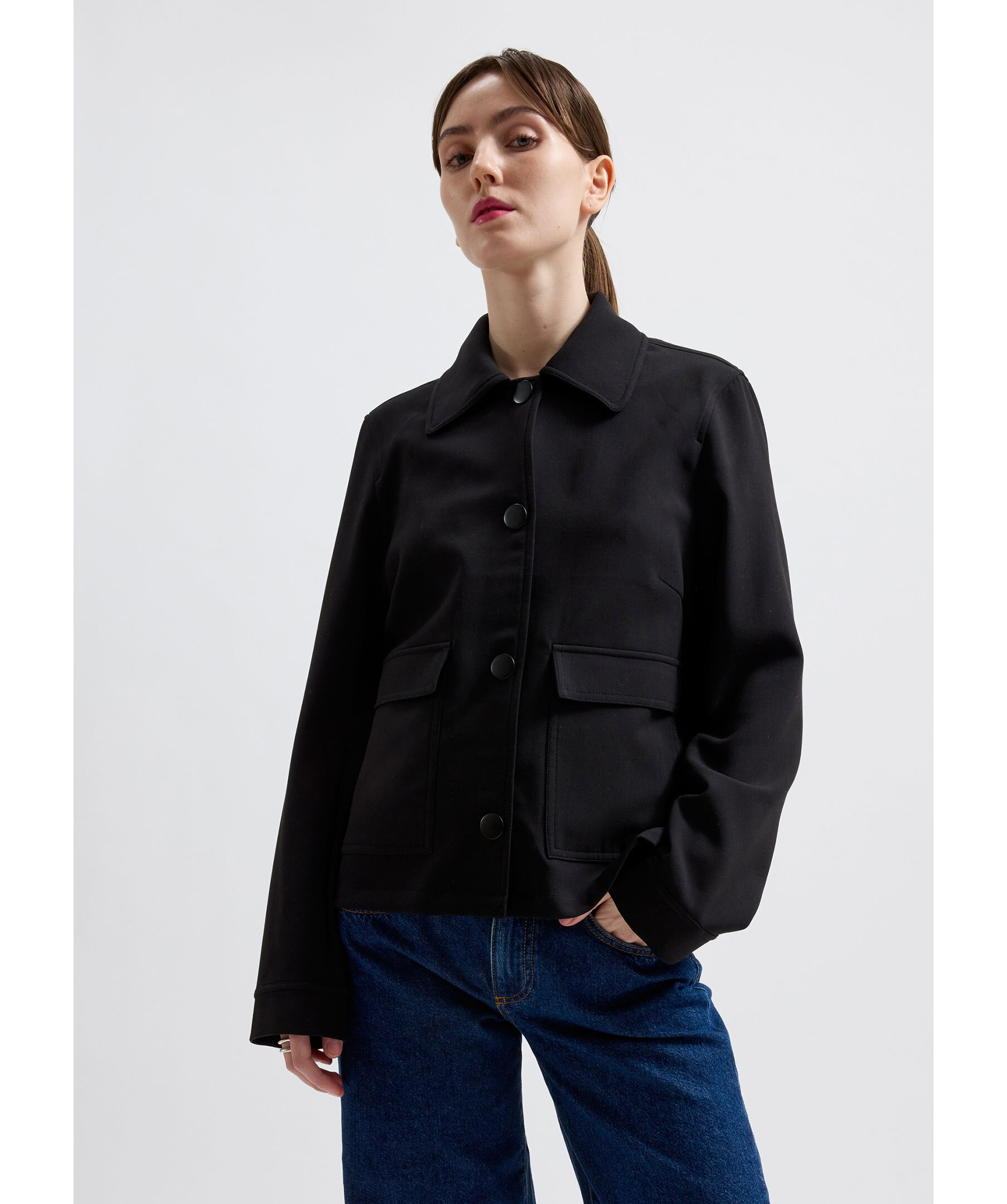 Svart jacka från Brixtol Textiles. Jackan är i en kortare längd med synliga sömmar, på sydda fickor och tonala tryckknappar. Tillverkad i en mjuk och tung crêpe-kvalitet gjord av återvunna plastflaskor.