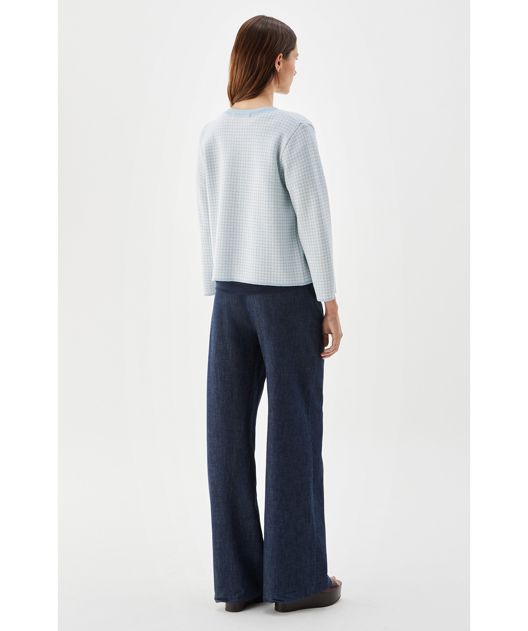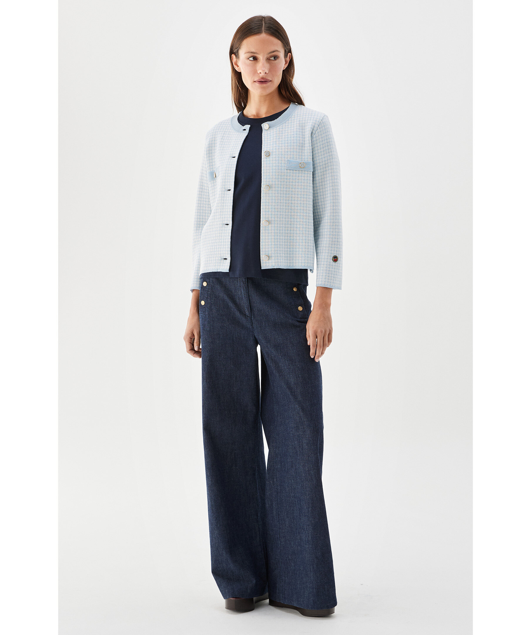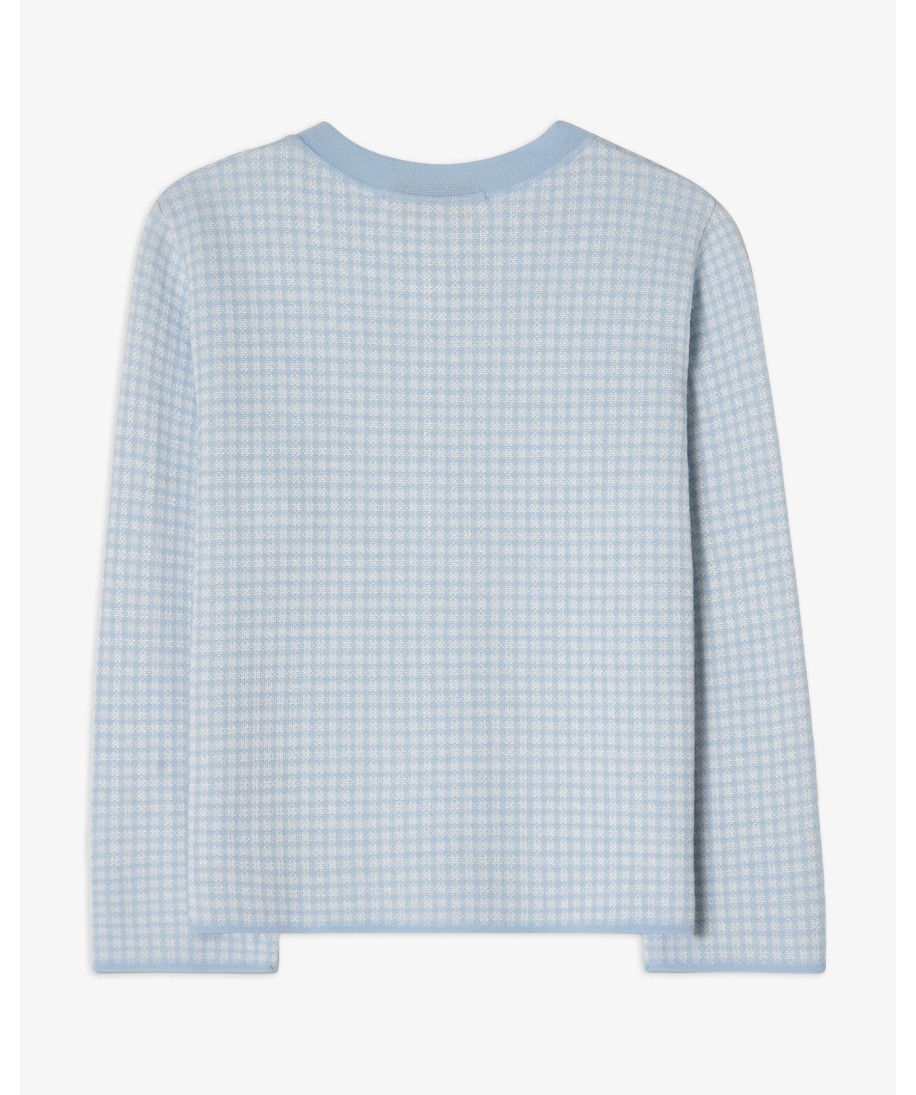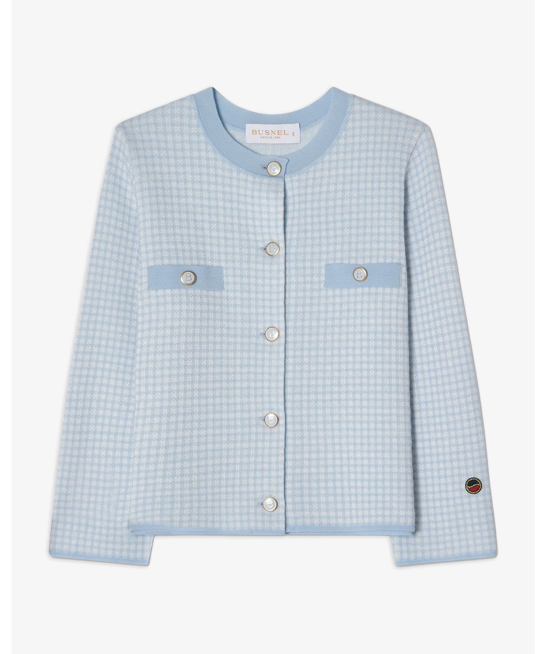 Ljusblå kort stickad rutig jacka från Busnel - enkelknäppt kort jacka stickad i en ull-och viskosmix. Jackan har en rund halsringning, något kortare ärm, fuskfickor på bröstet och guldknappar. Det rutiga mönstret är subtilt och elegant där materialmixen av ull och viskos ger en fin lyster och kontrast i mönstret.