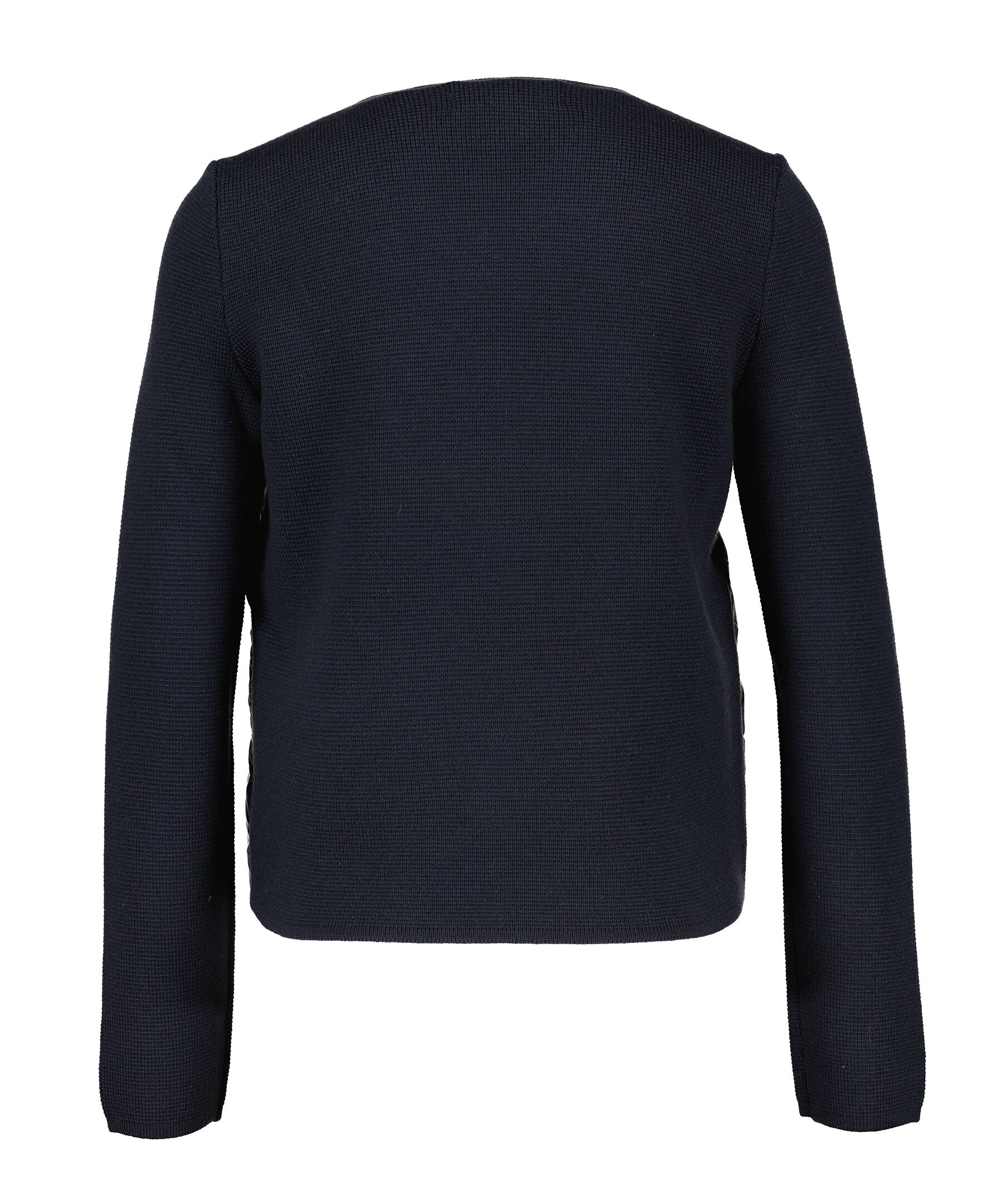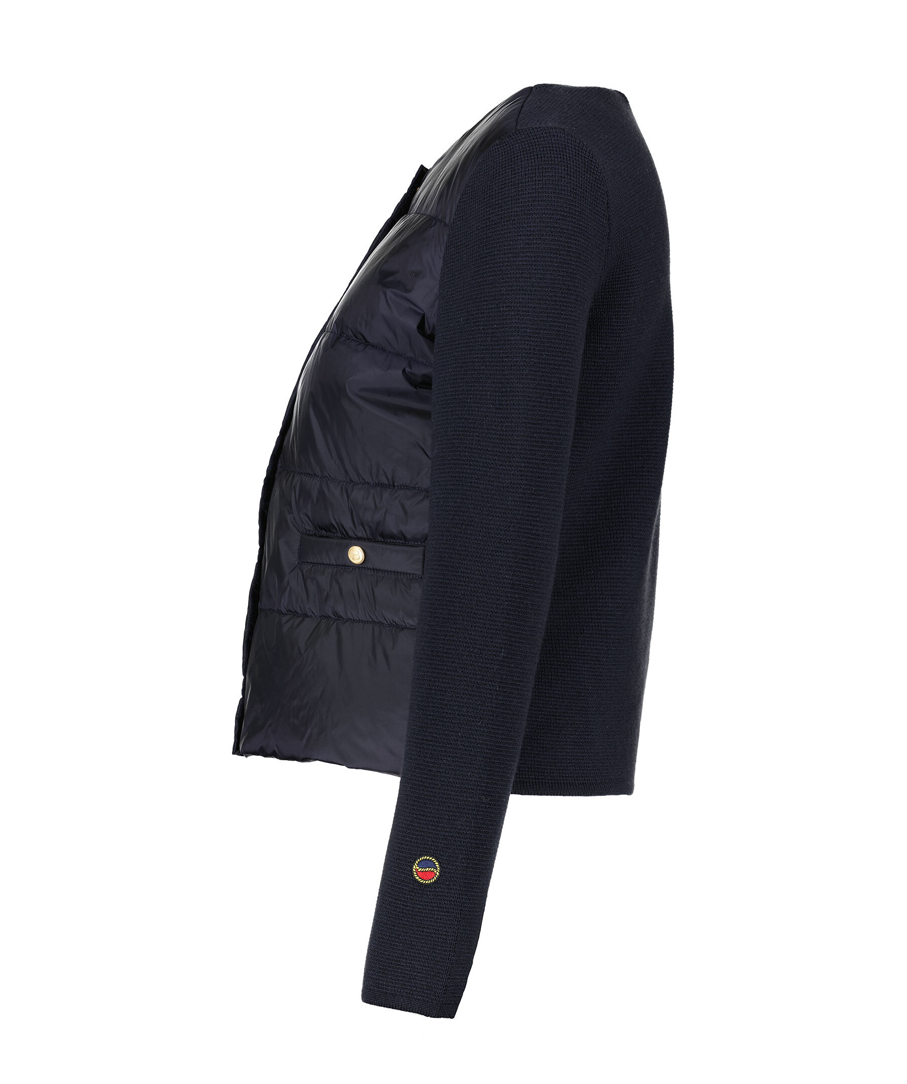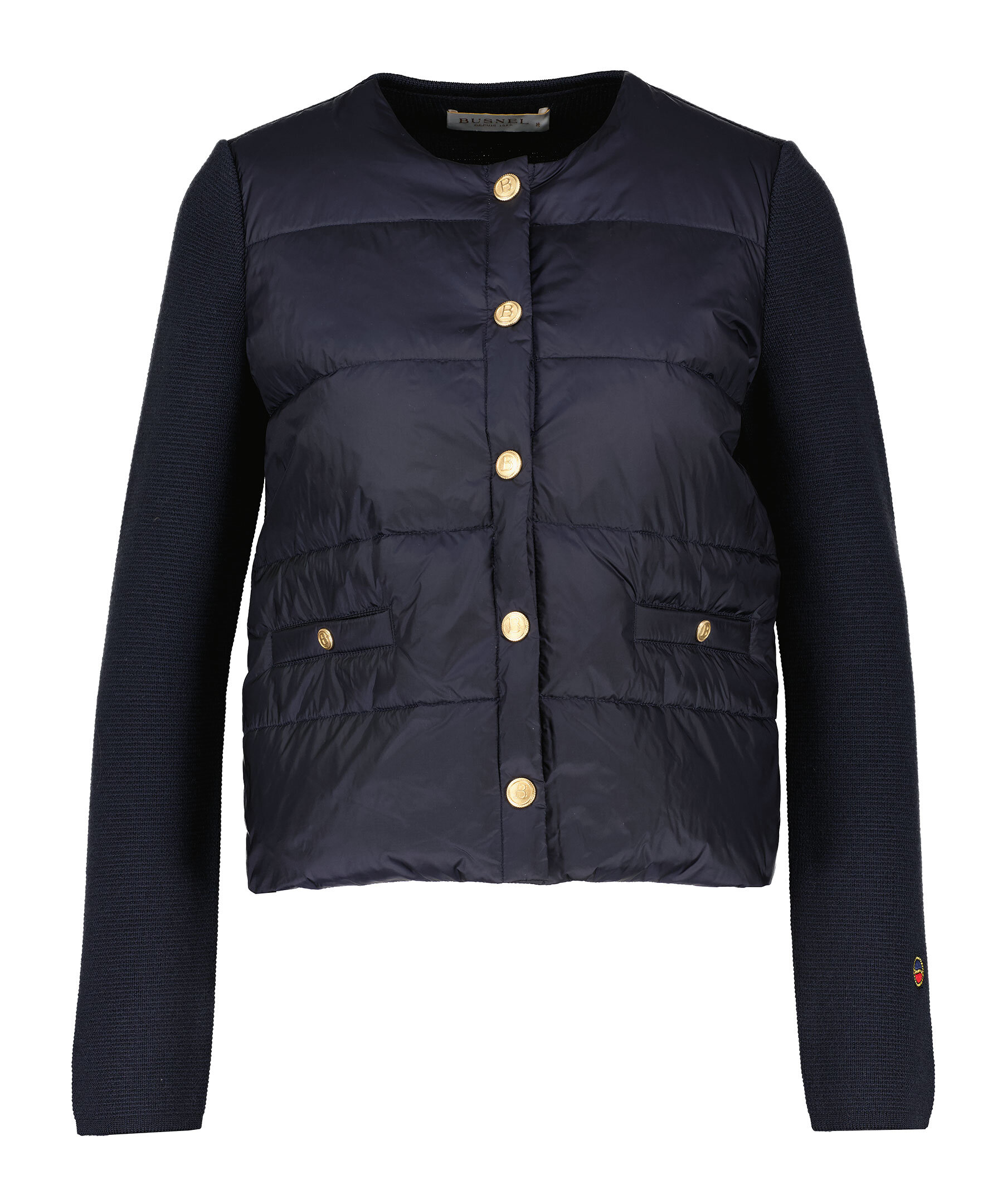 Marinblå jacka från Busnel. Jackan har stickade ärmar och rygg. Stängs med guldfärgade knappar med logotyp. Rundad halsringning och fickor fram med tryckknapp. Broderad logotyp vid ärmslut på höger ärm. Tillverkad i en ull blandning.