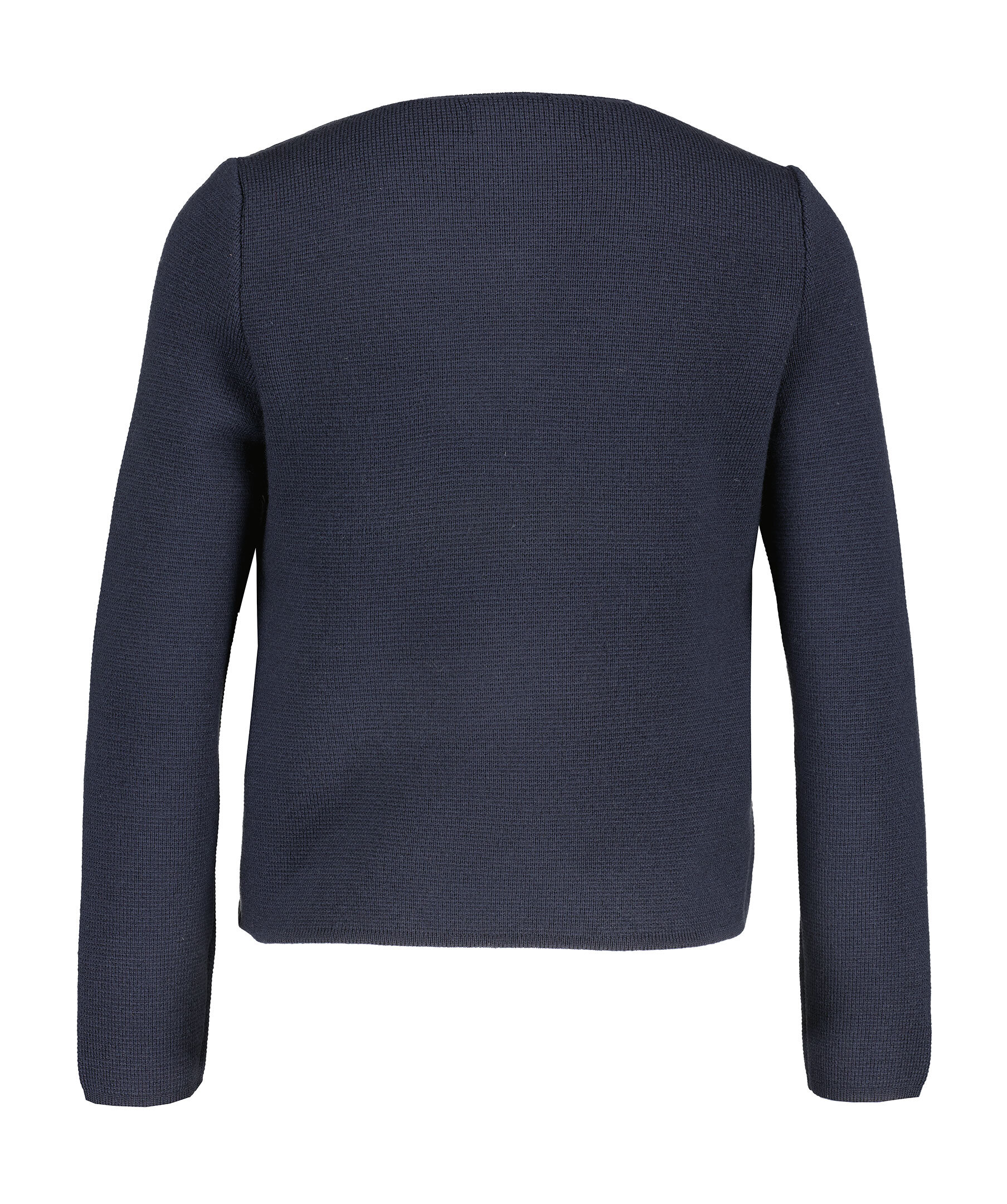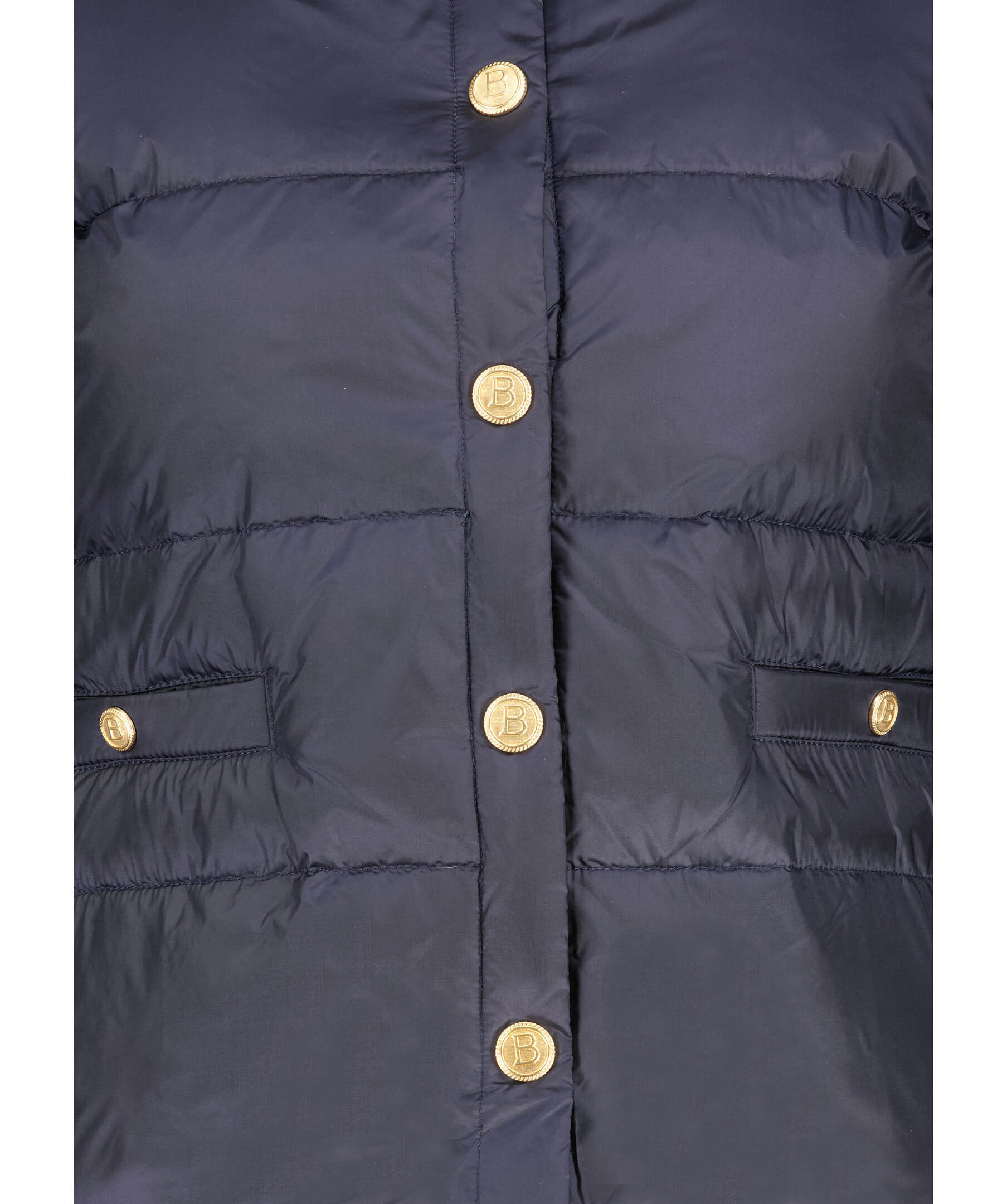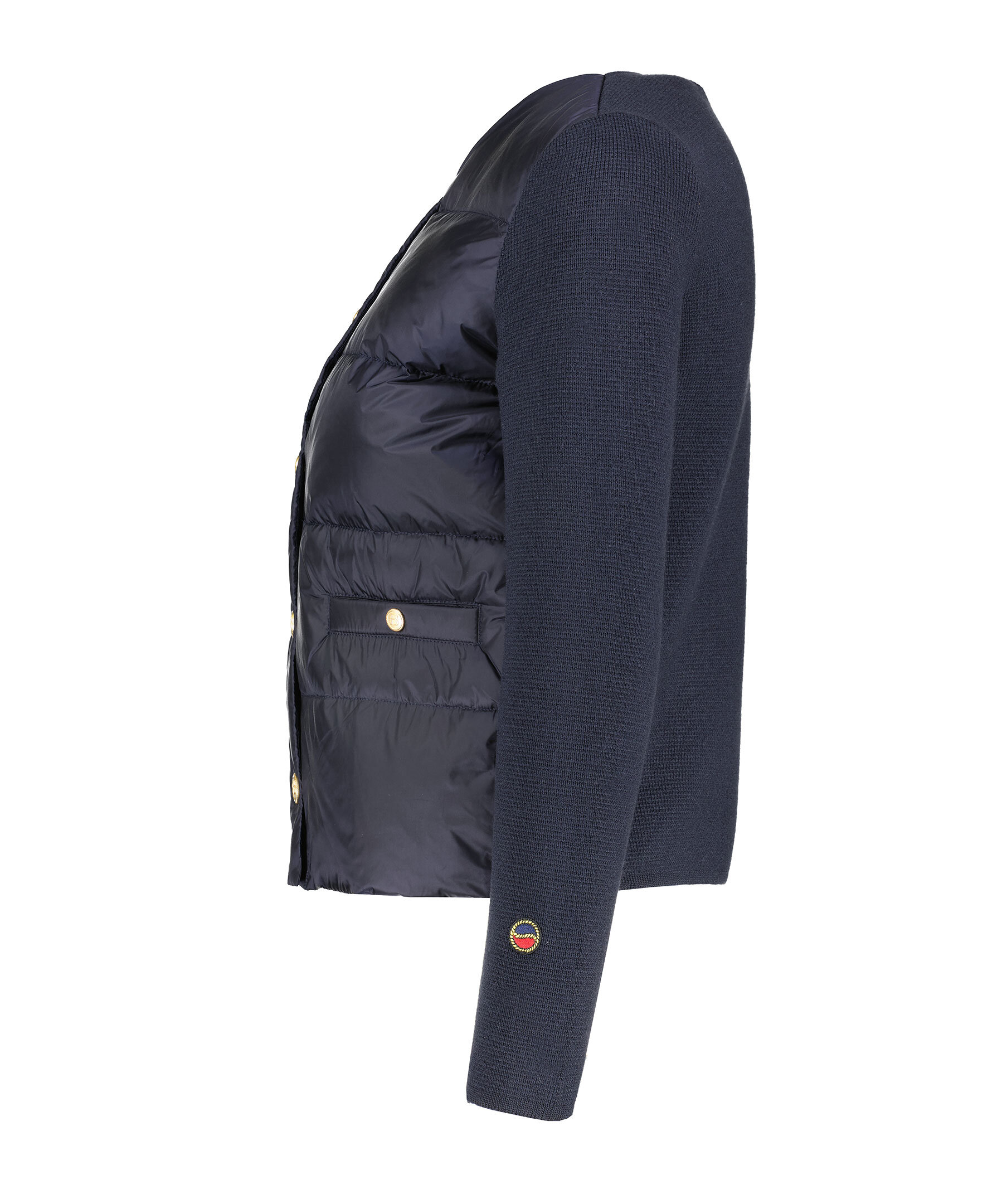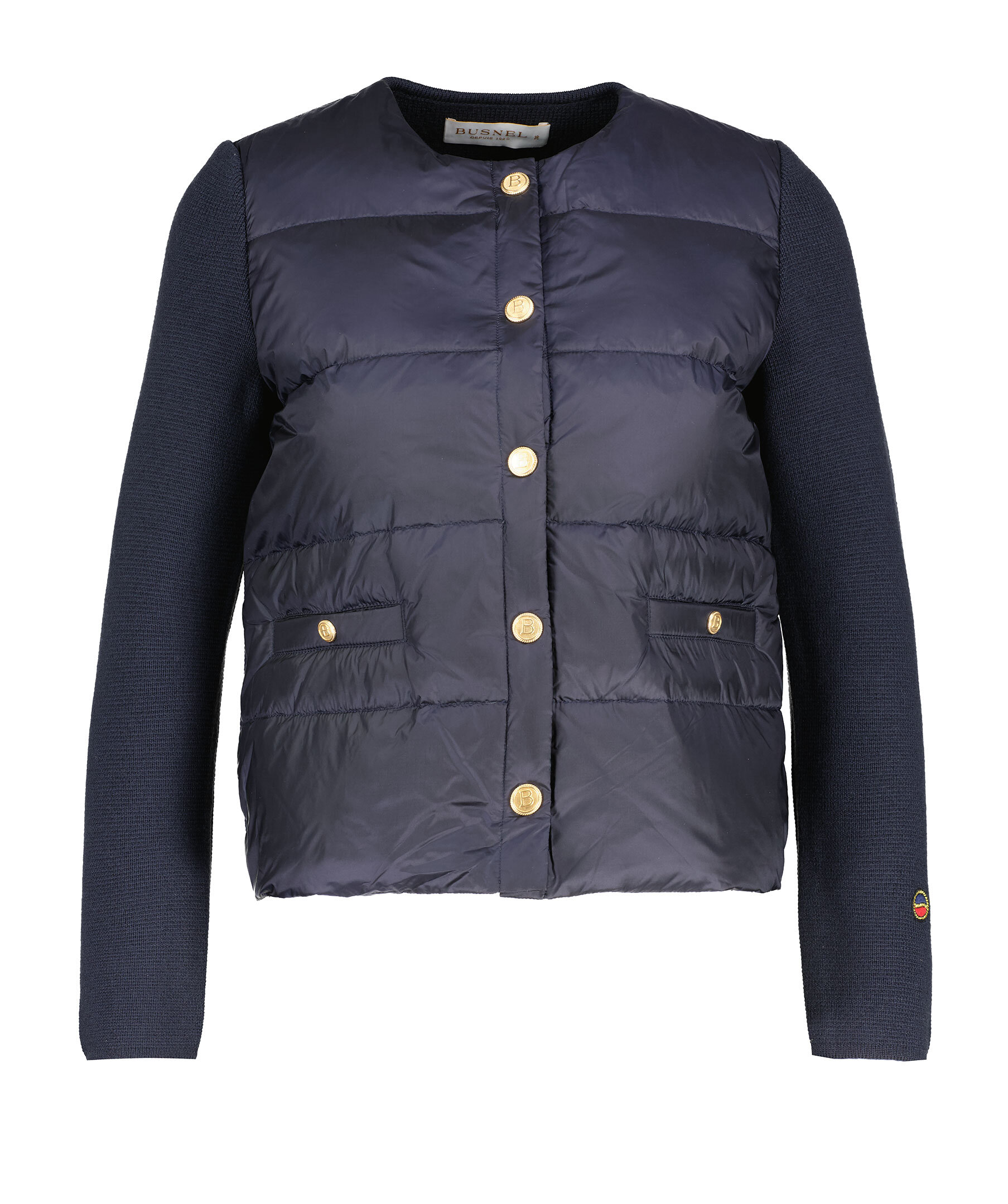 Marinblå jacka från Busnel. Dun jacka med stickade ärmar och rygg. Guldfärgade knappar med monogram. Två sidofickor med knappar. Tillverkad av merinoull och nylon, fylld med dun.