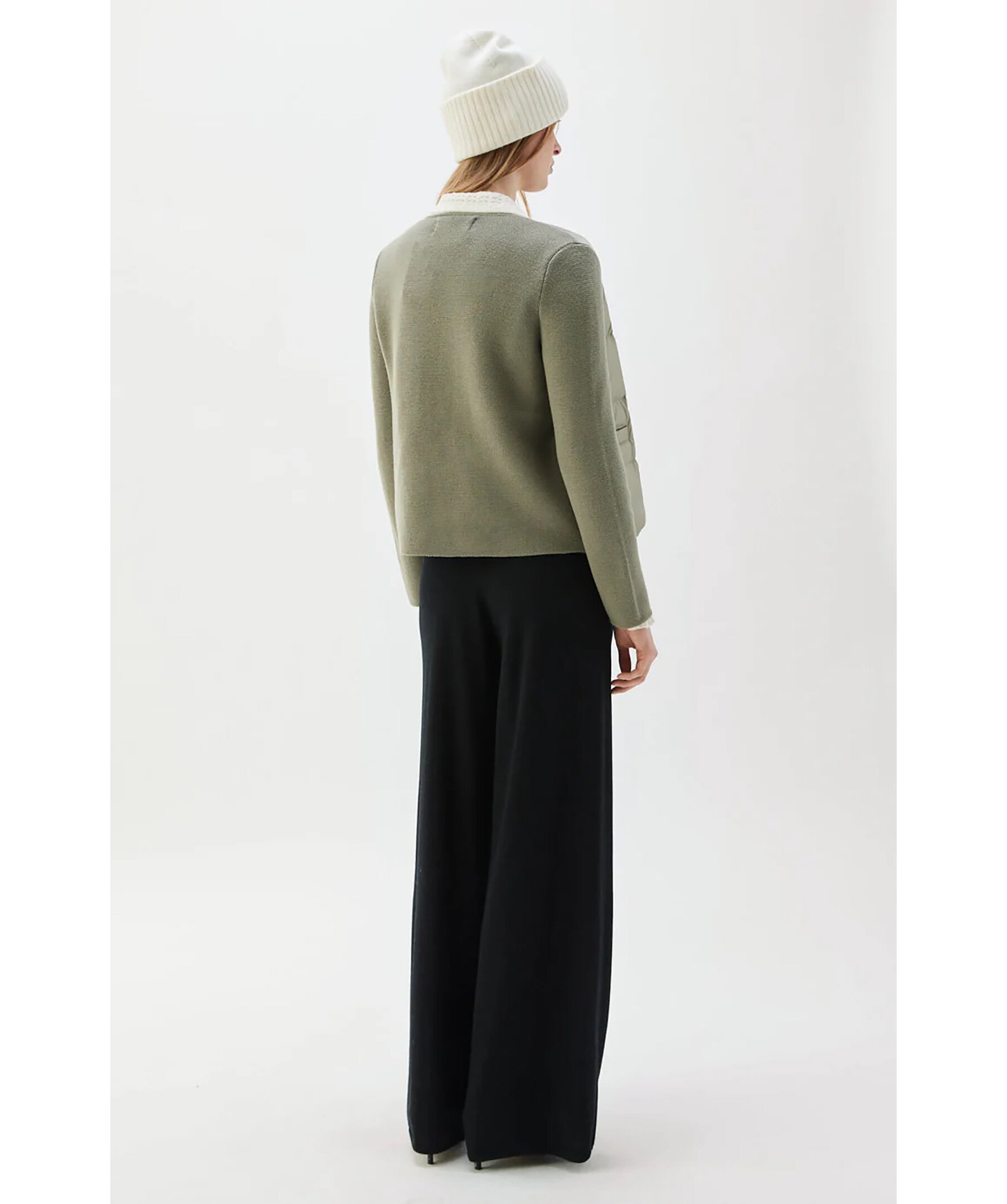 Olivgrön dunjacka från Busnel - stickade ärmar och bakstycke för en feminin silhuett. Perfekt för vår, höst och mild vinter med en elegant, minimalistisk look.