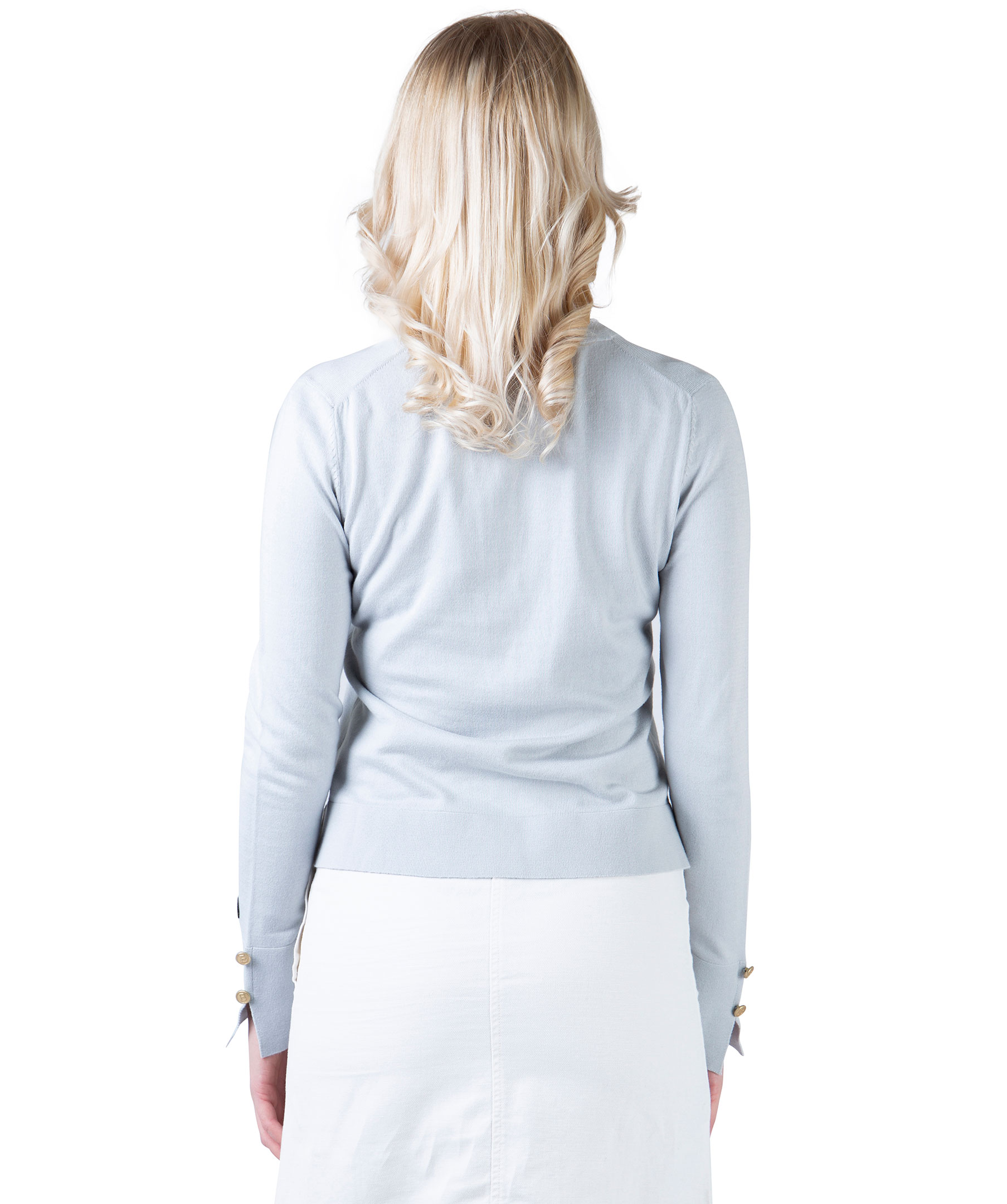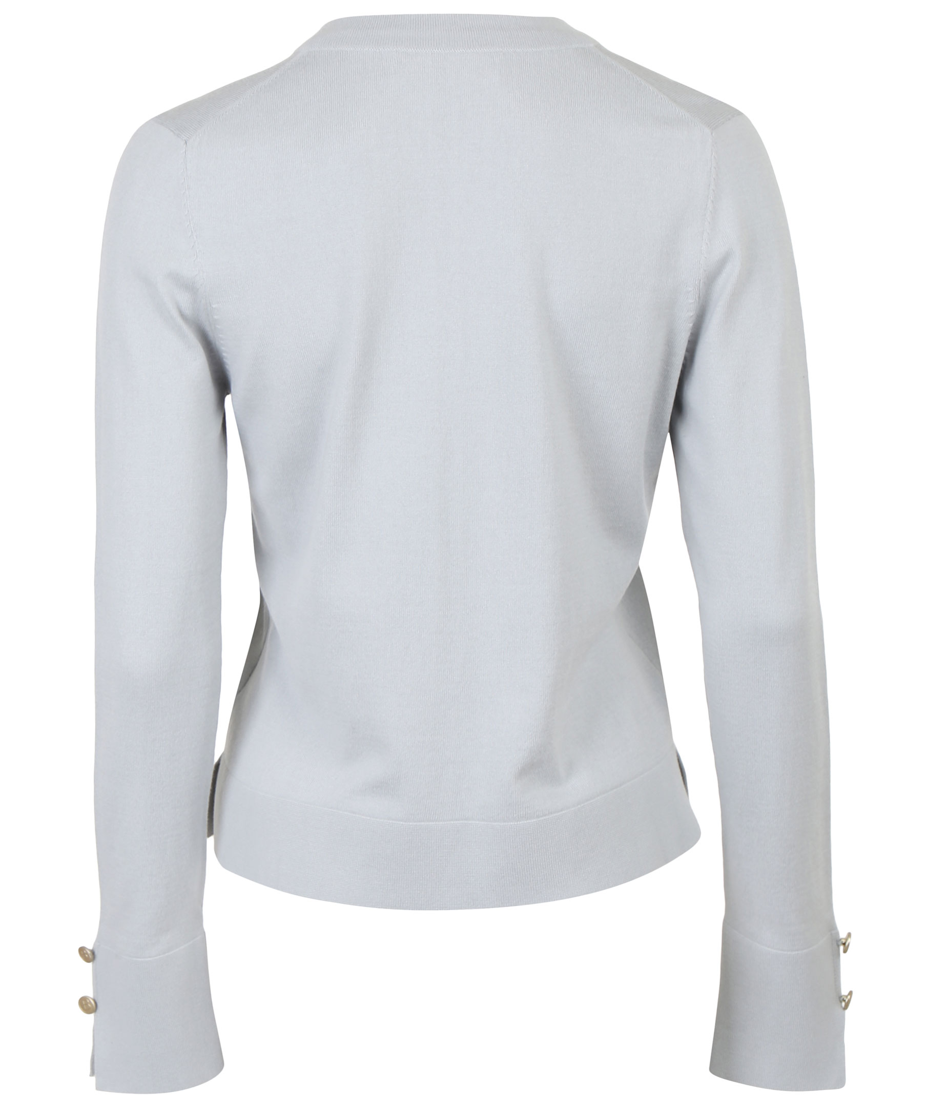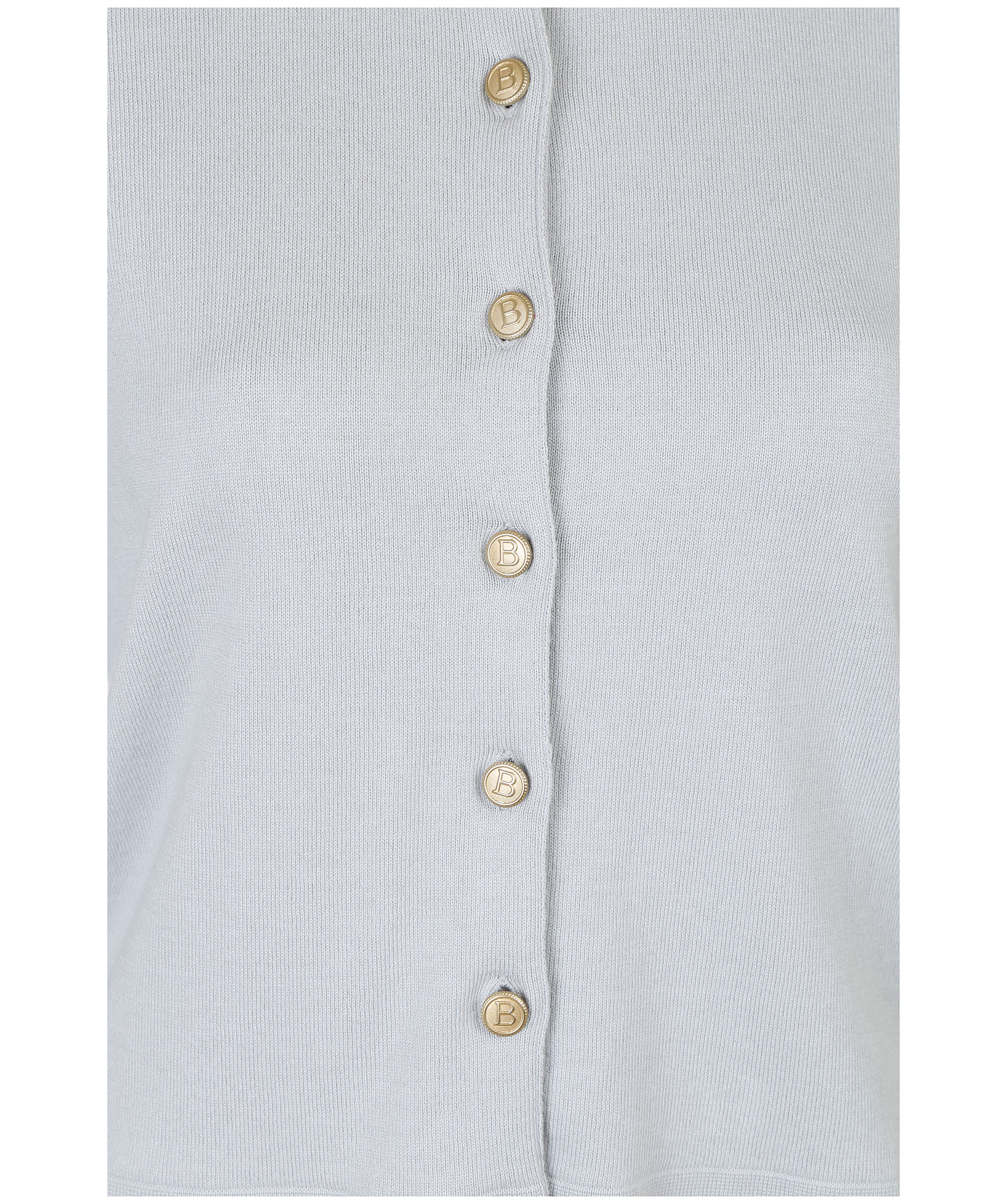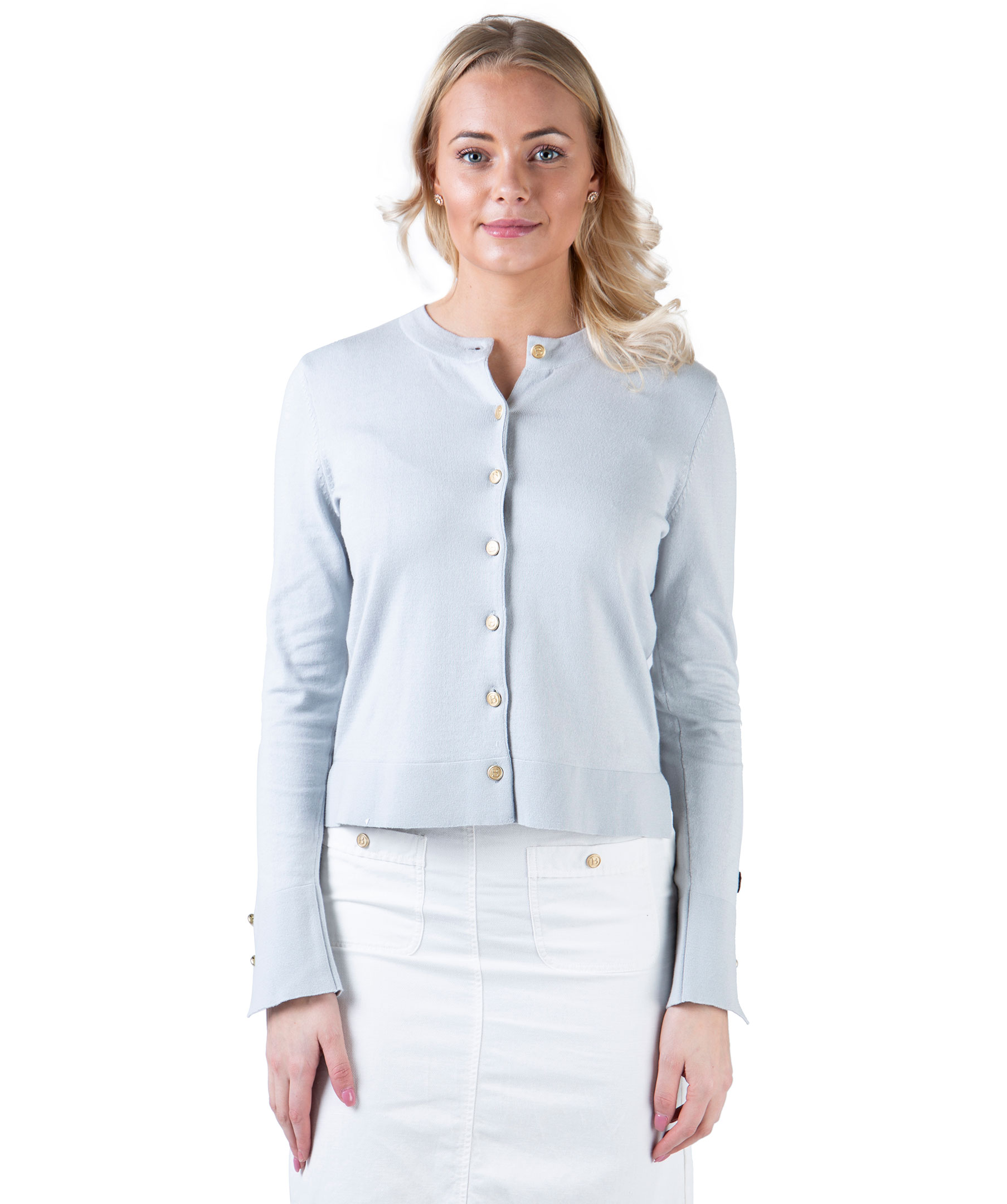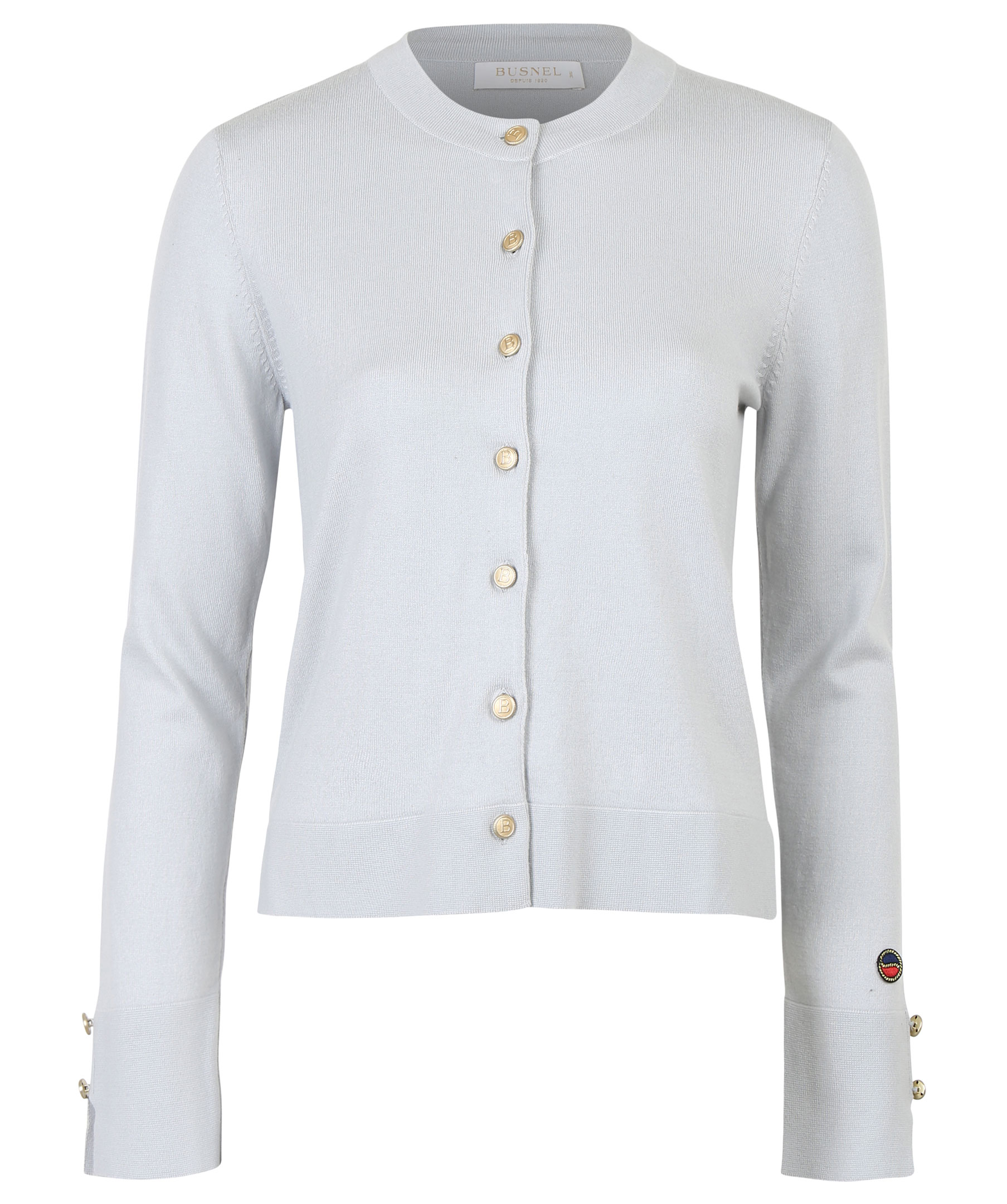 Cardigan från Busnel i en fin dimblå färg. Guldfärgade knappar framtill, rundad hals, broderad logotyp på vänster ärm samt två knappar i ärmslut.