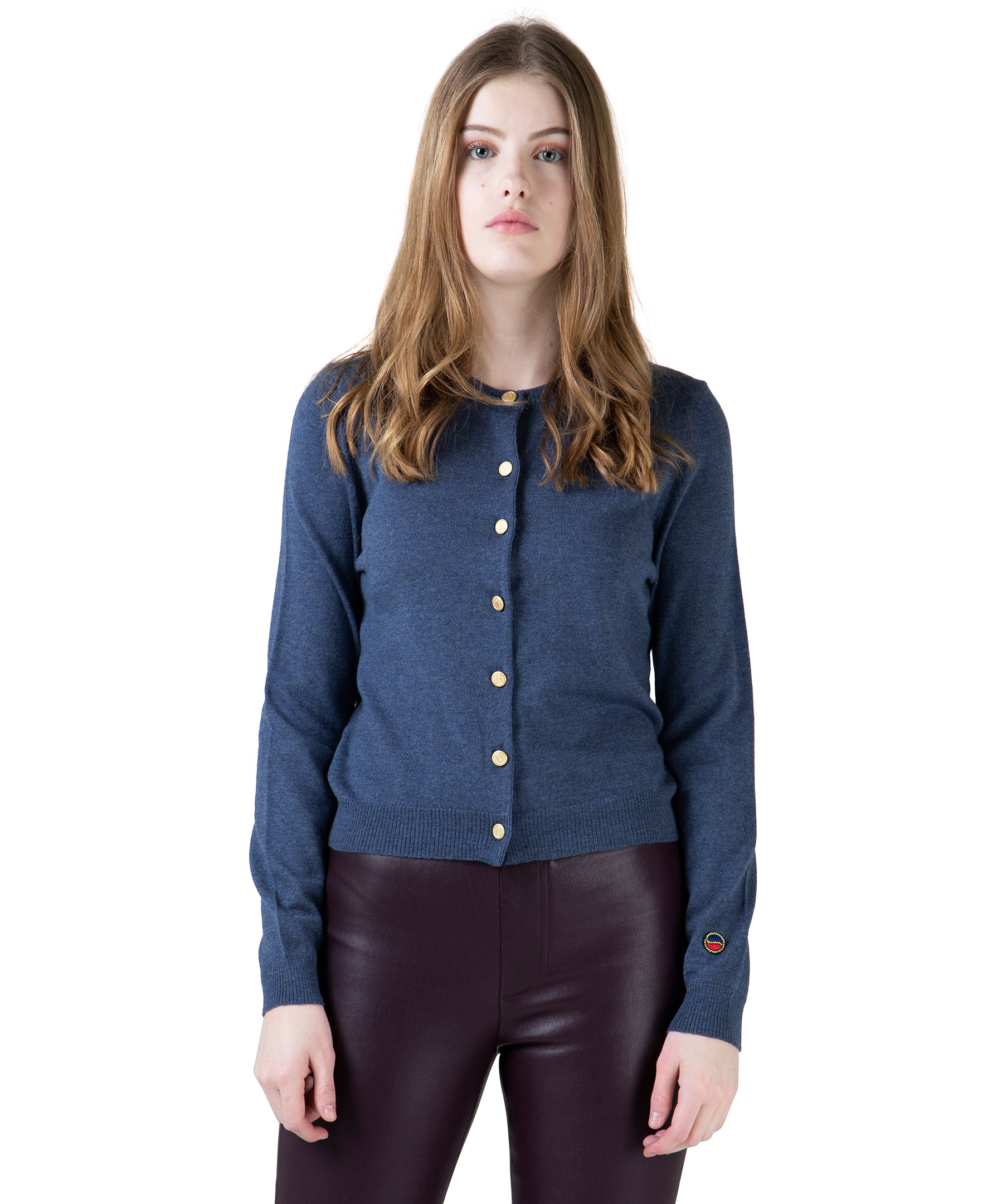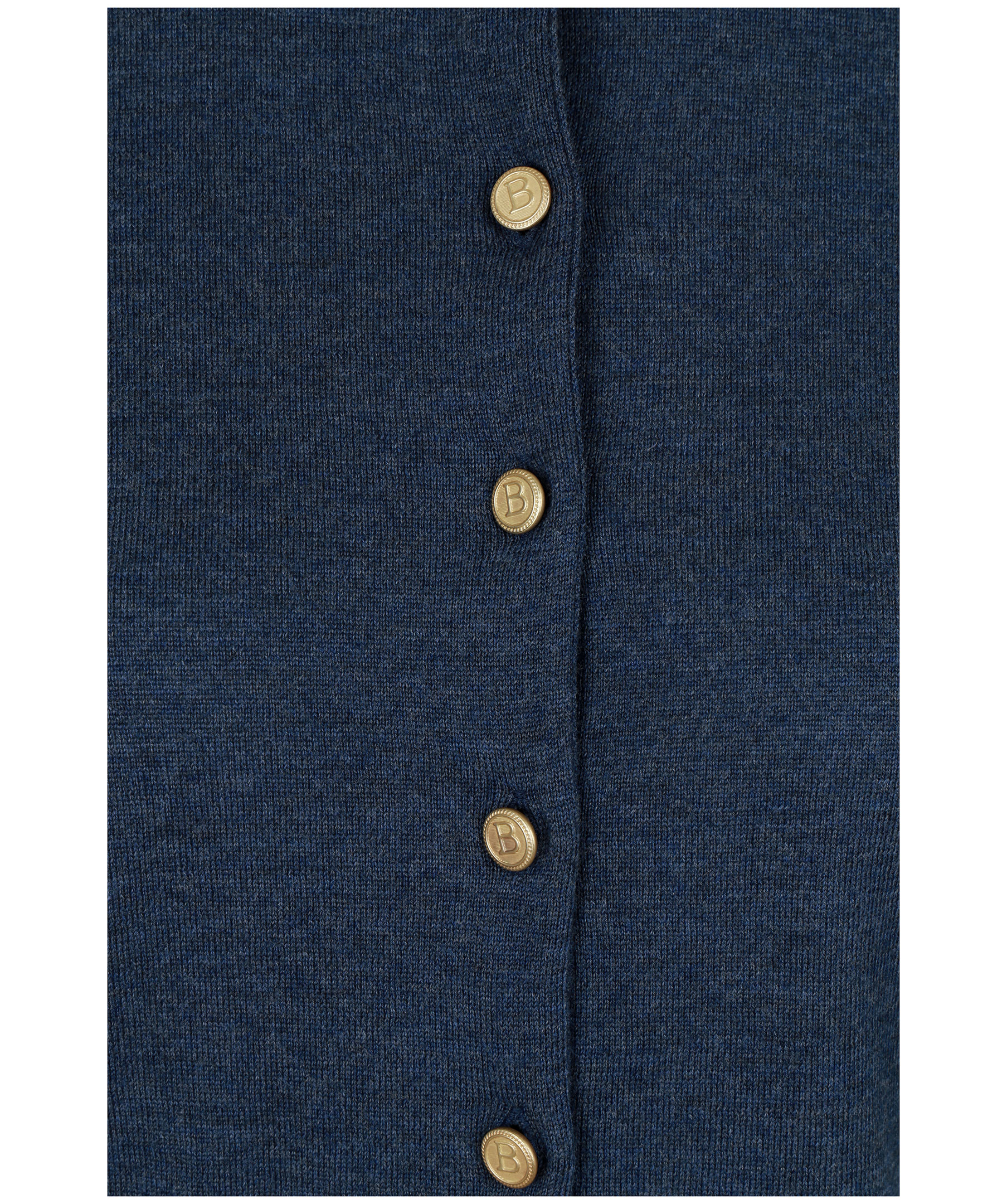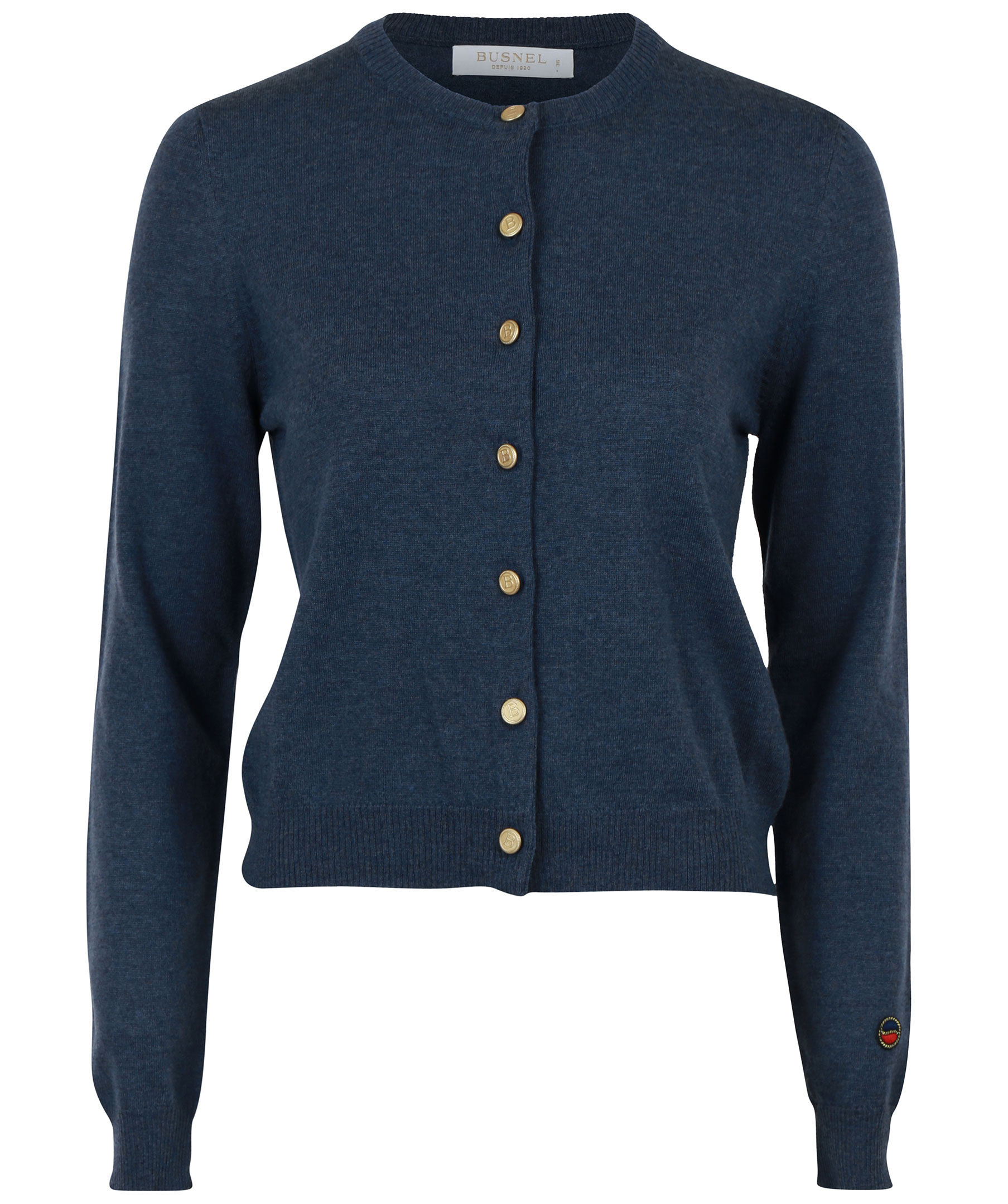 Gråblå cardigan i kortmodell från Busnel med ribbstickade detaljer. Rak passform. Stängs med guldfärgade knappar längst mitten. Logga nertill på vänster ärm. Tillverkad i 100% merinoull. Modellen är 173 cm lång och bär storlek 36.
